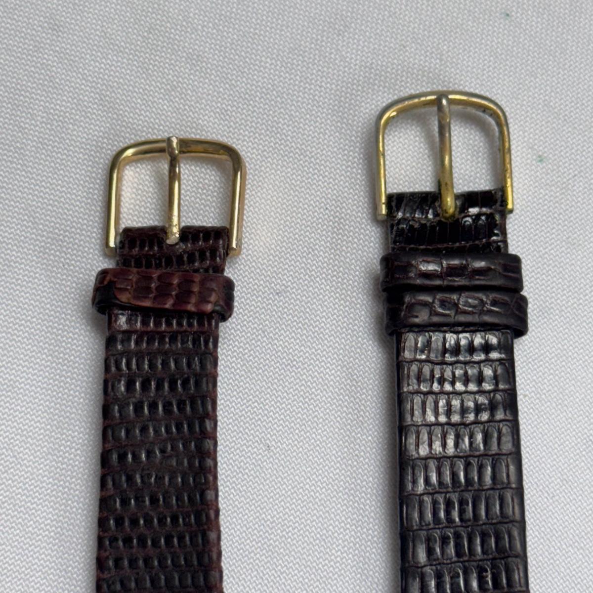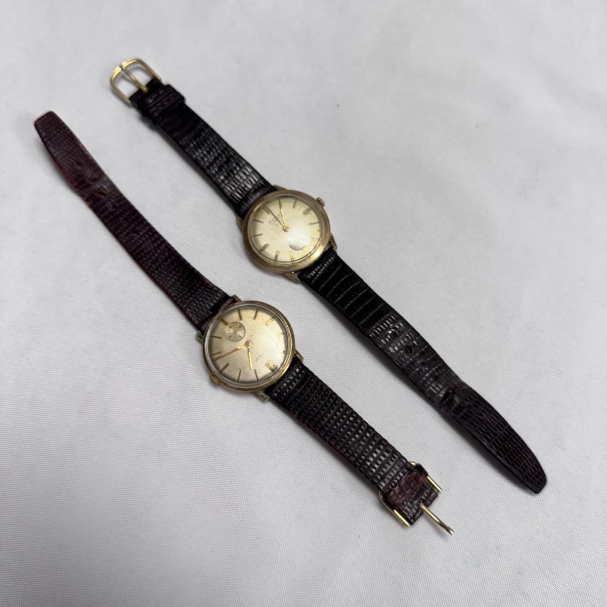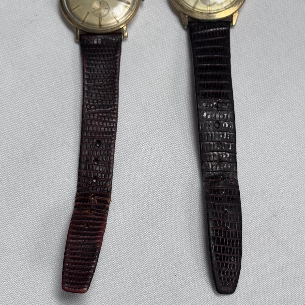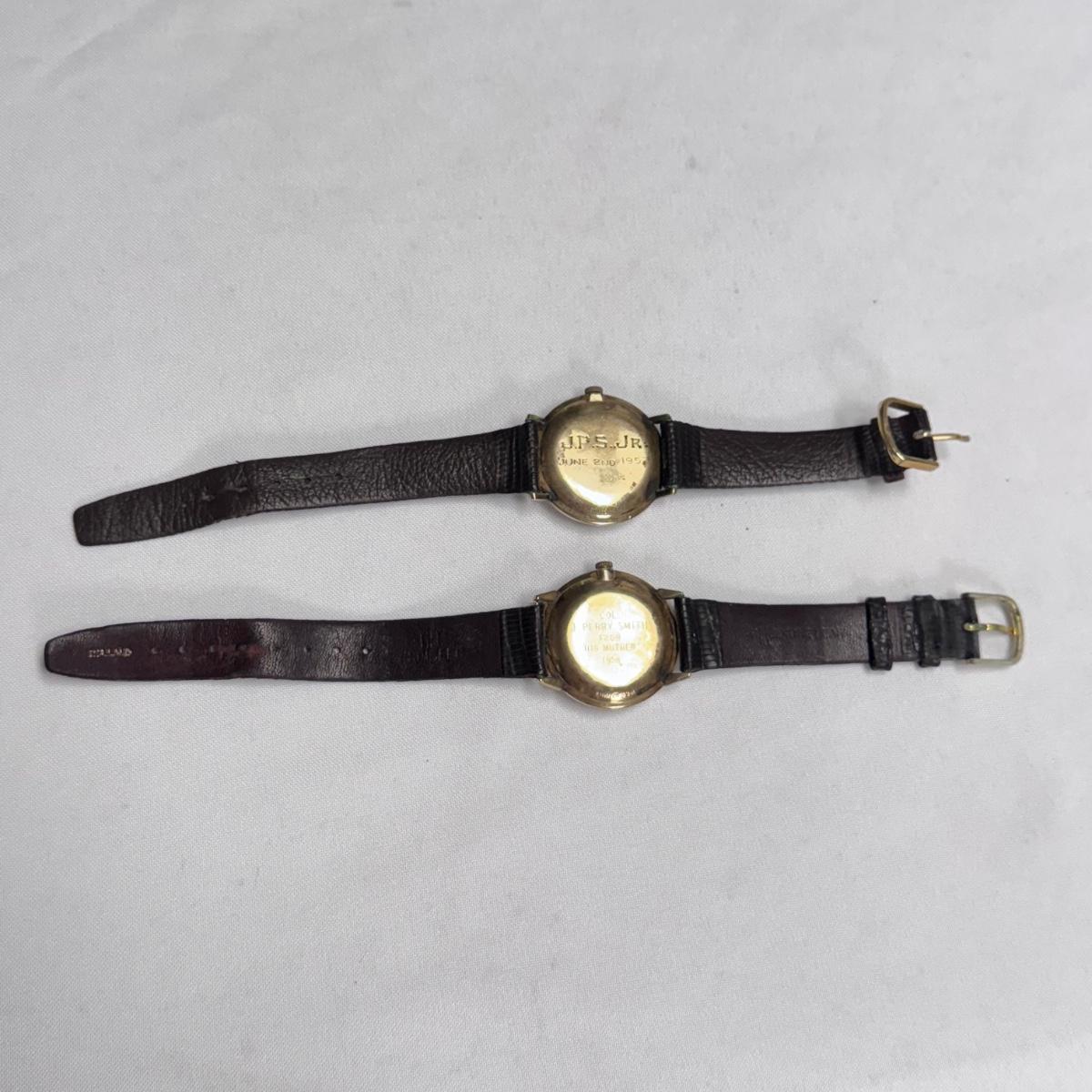 Lot includes two vintage Nicolet watches, with leather straps with 10 k.g. filled stamp on the back of watches. Each one is stamped with names on the back including “J.P.S, Jr - June 2nd, 1957” and “Col. J. Perry Smith from His Mother - 1958.” Both watches are individually 9” long. Neither watch was wound. All sales are final. No returns or refunds. Please bid accordingly. Shipping available.