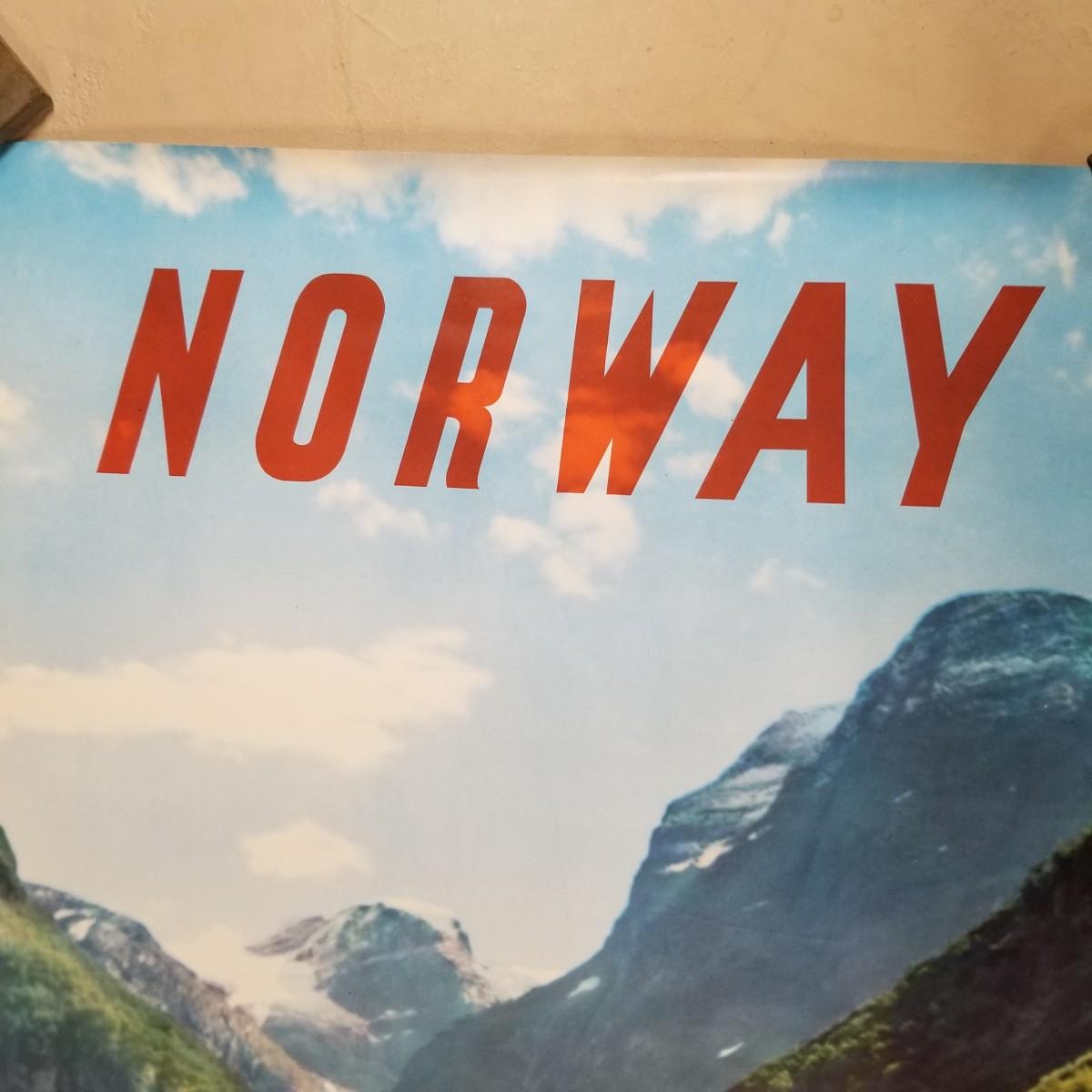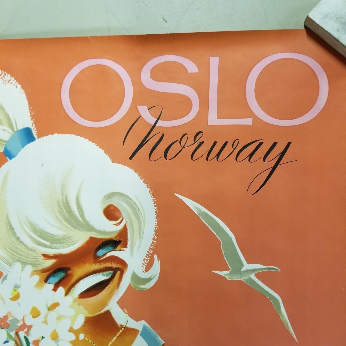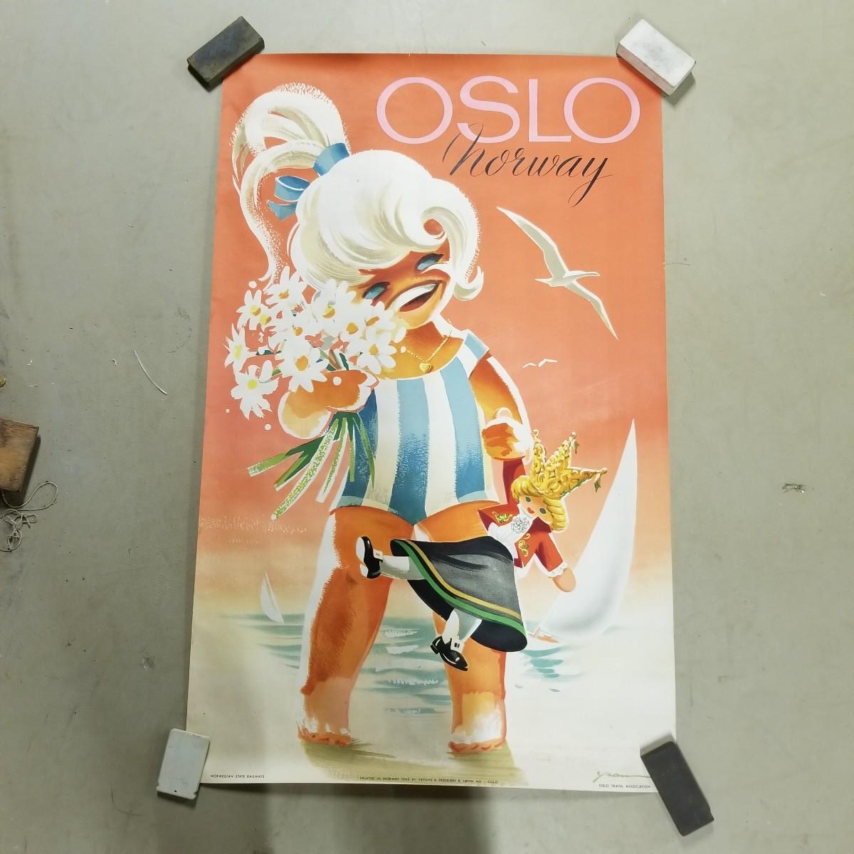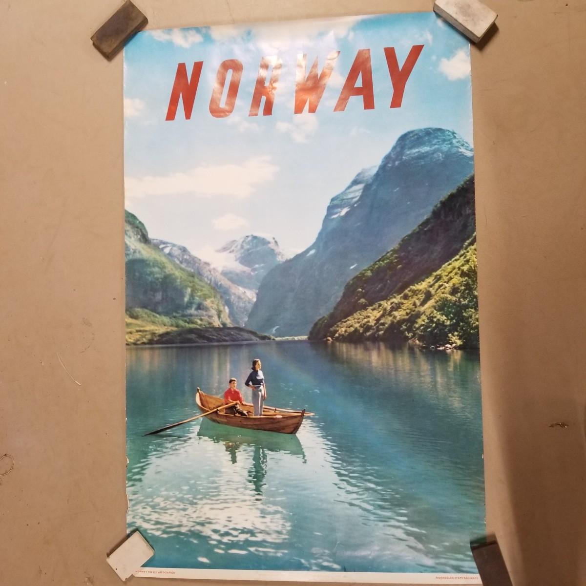 Travel posters for Norway, one of a couple boating on a fjord, the other of a child on the beach in Oslo.  Both items measure 39"x25".  Fjord print on glossy stock, the Oslo piece has a matte finish.  Produced by Norway Travel.  Shipping available.