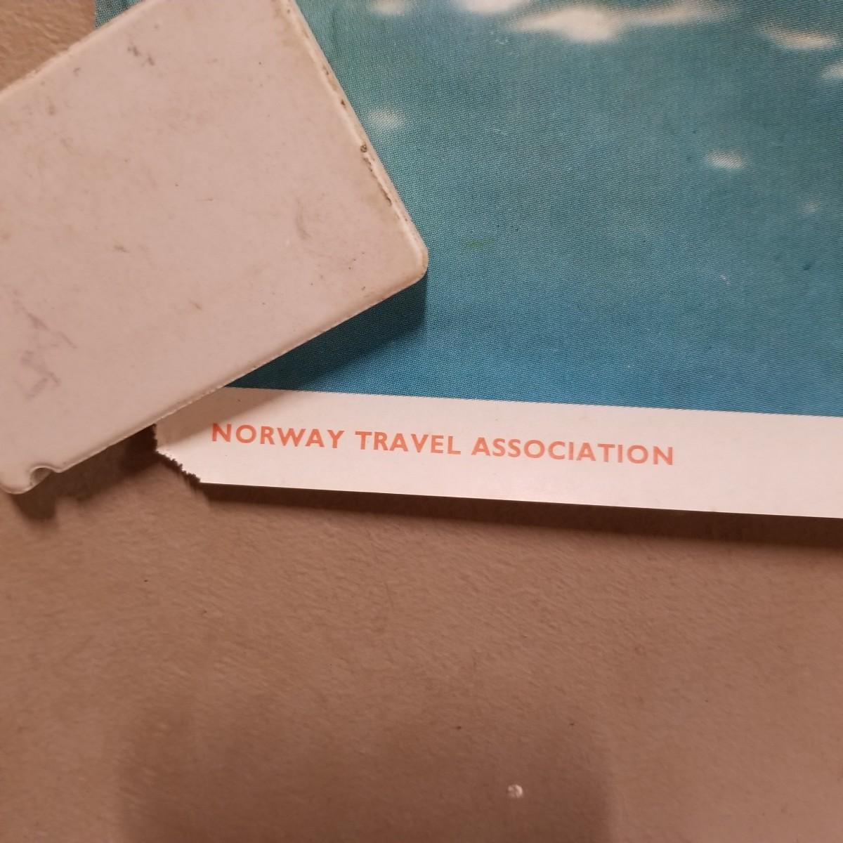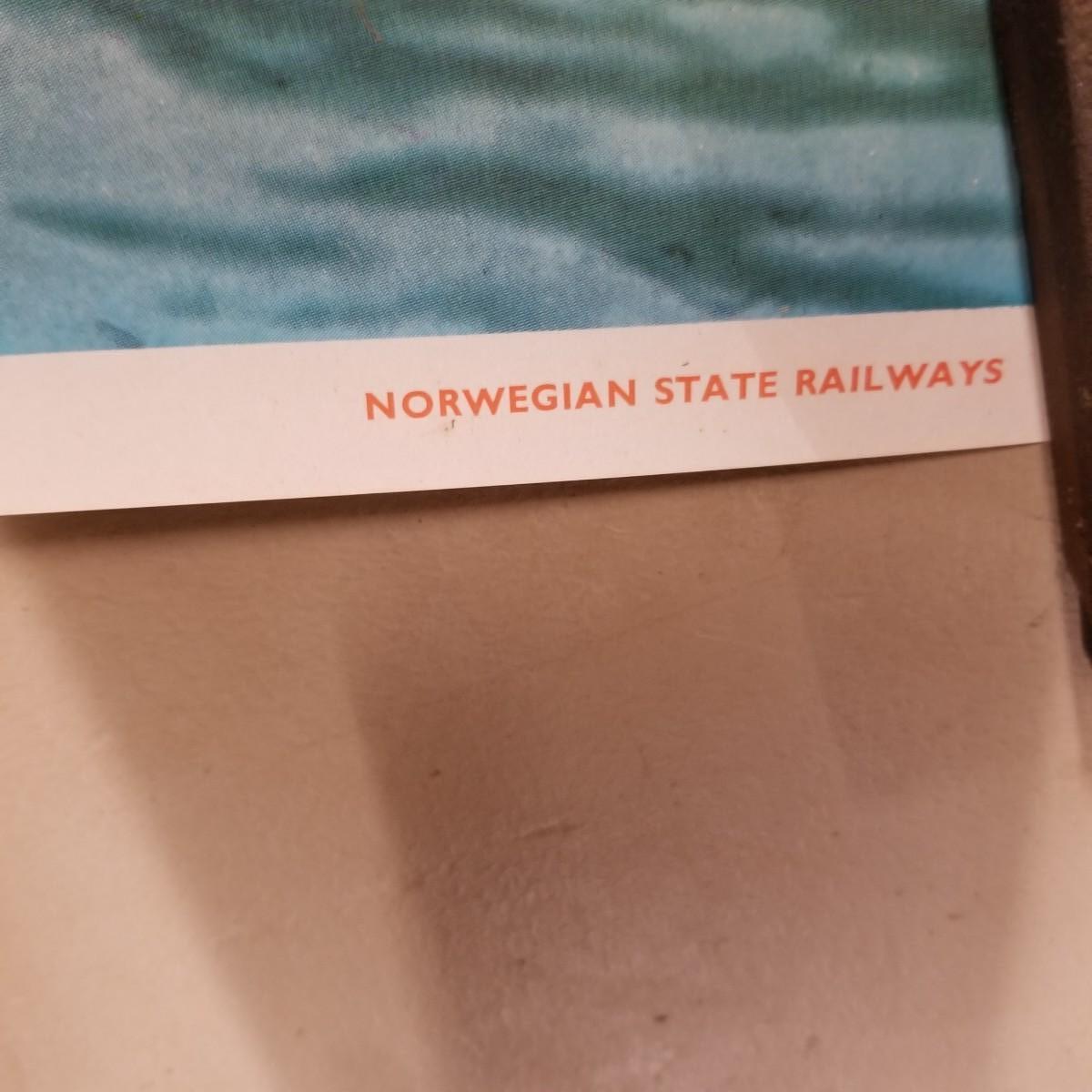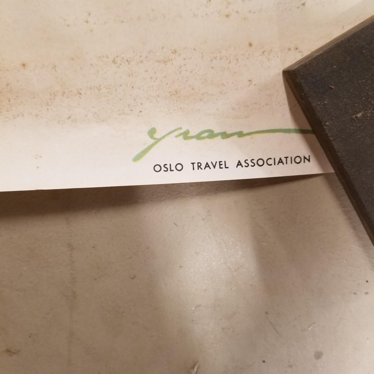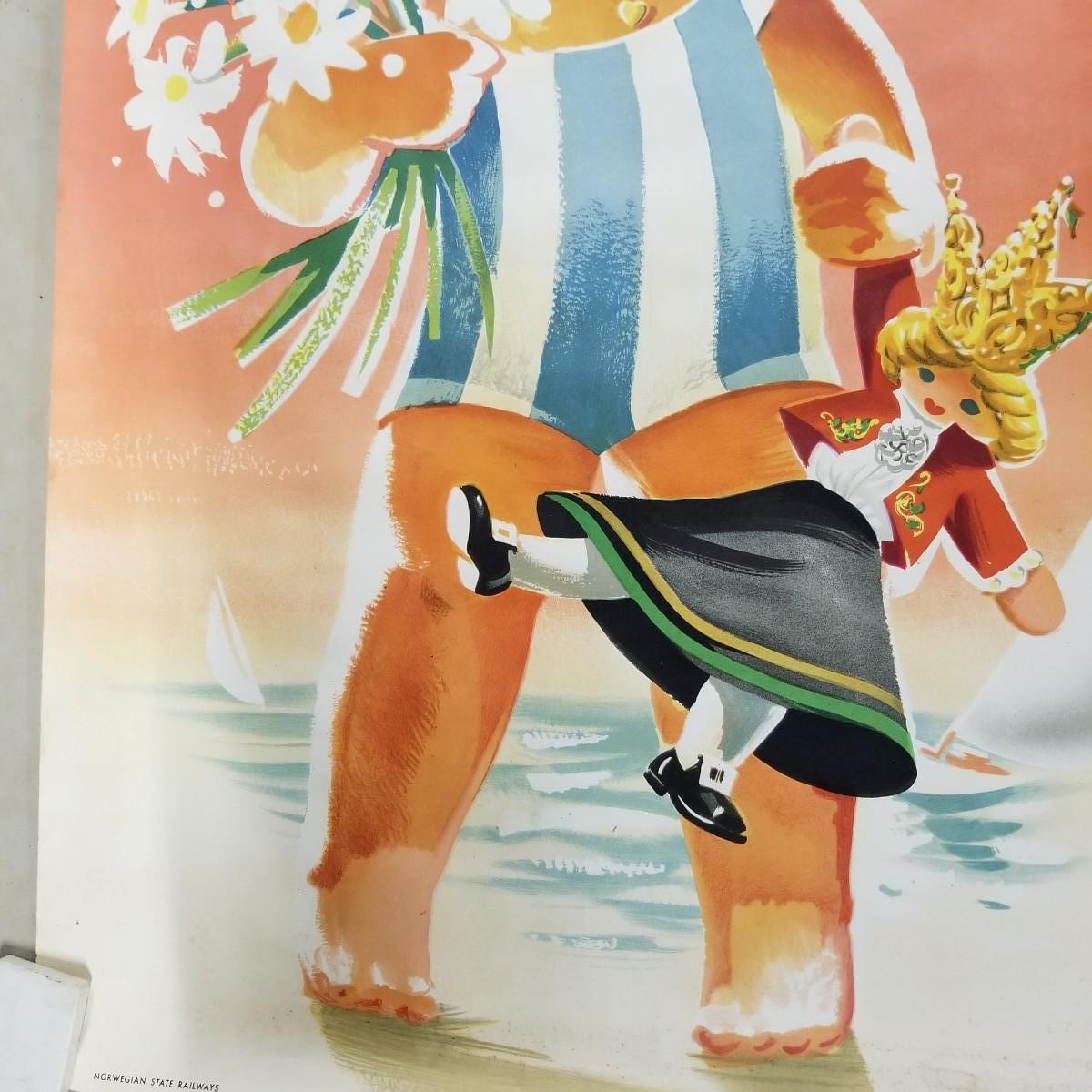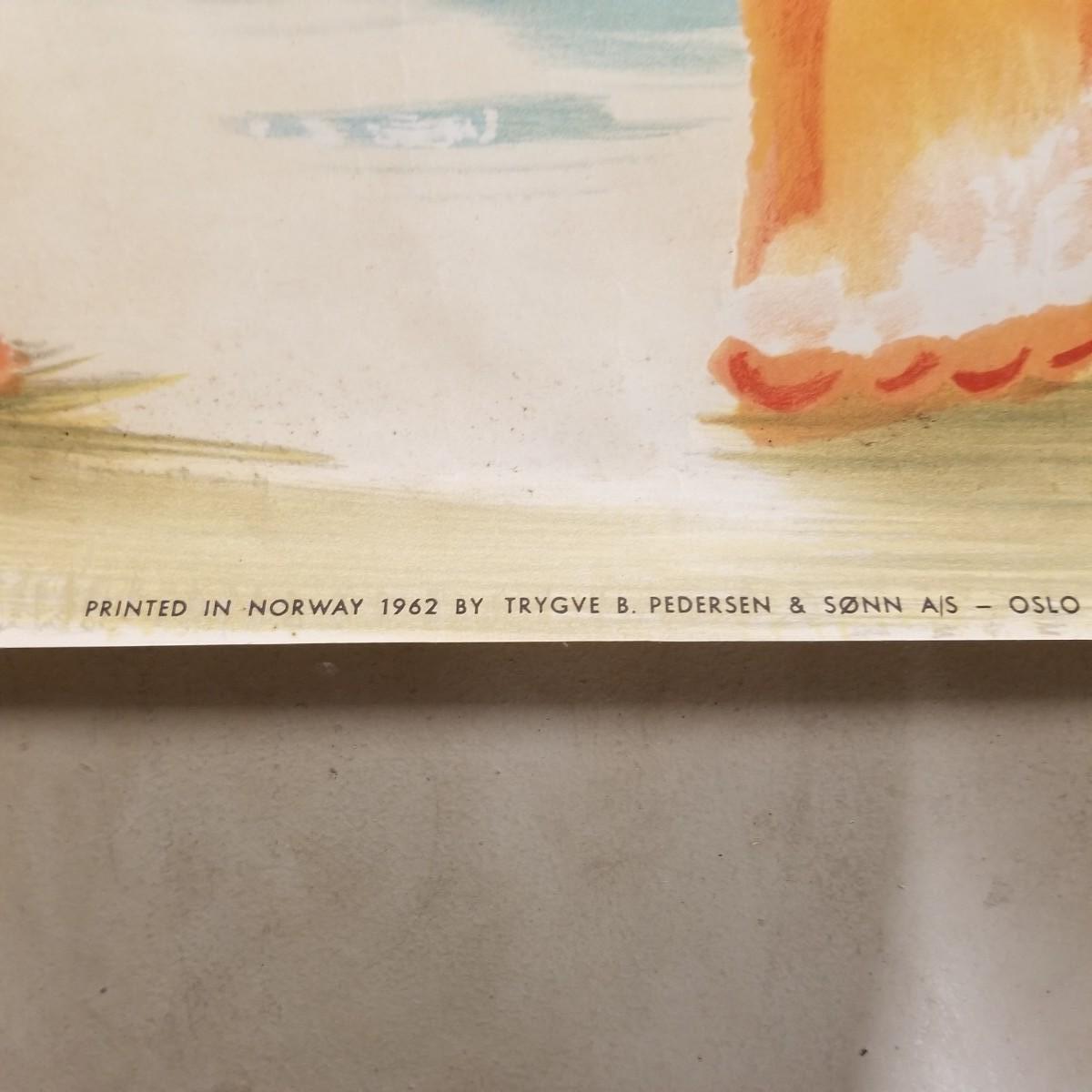 Travel posters for Norway, one of a couple boating on a fjord, the other of a child on the beach in Oslo.  Both items measure 39"x25".  Fjord print on glossy stock, the Oslo piece has a matte finish.  Produced by Norway Travel.  Shipping available.