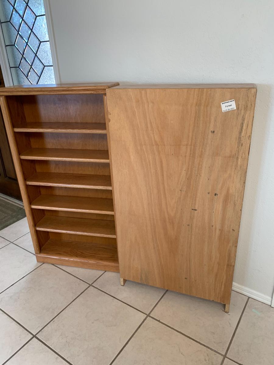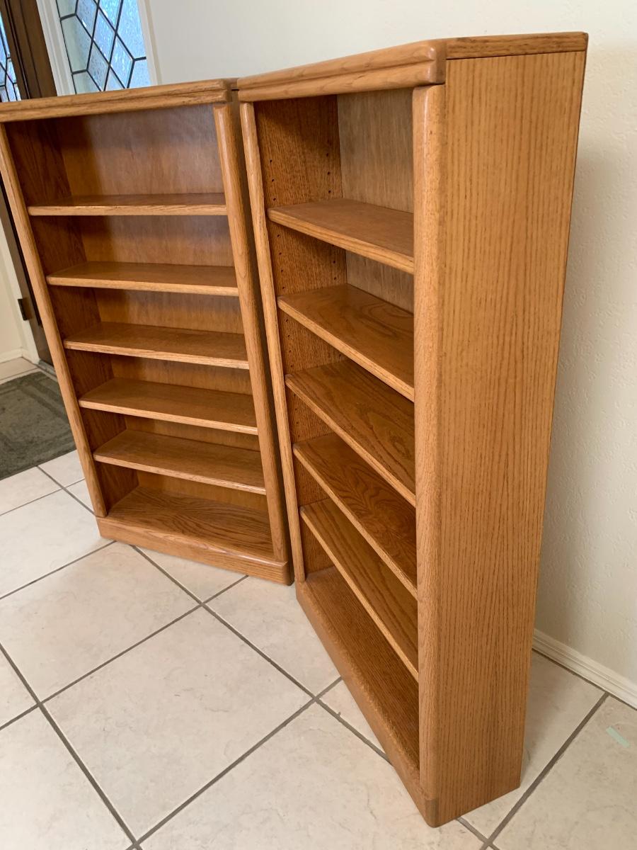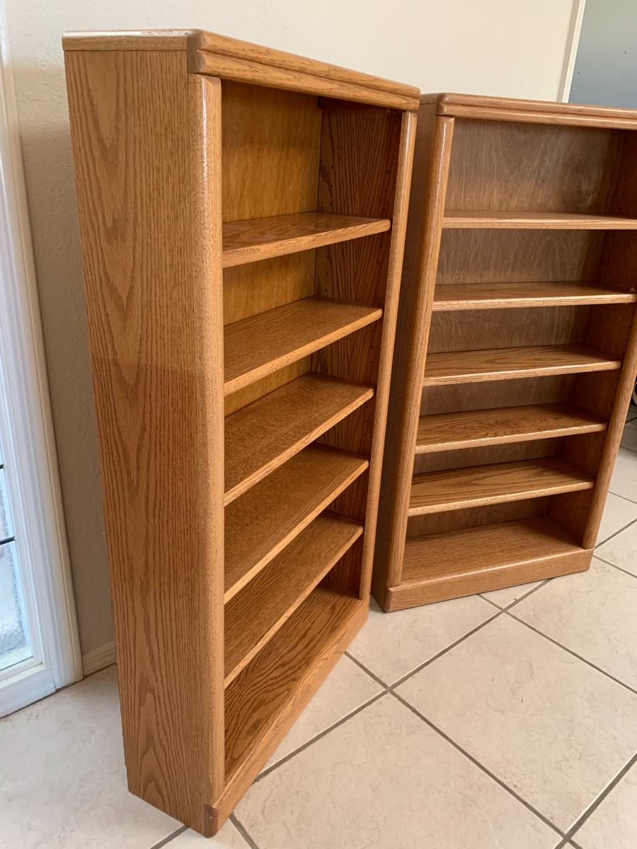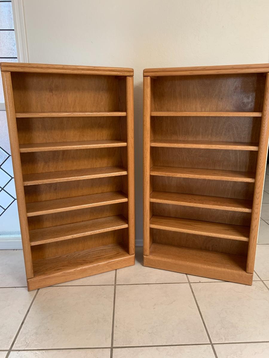Two oak bookshelves with adjustable shelves in great condition. (2 feet in length, 7 inches in depth, 44 inches in height)