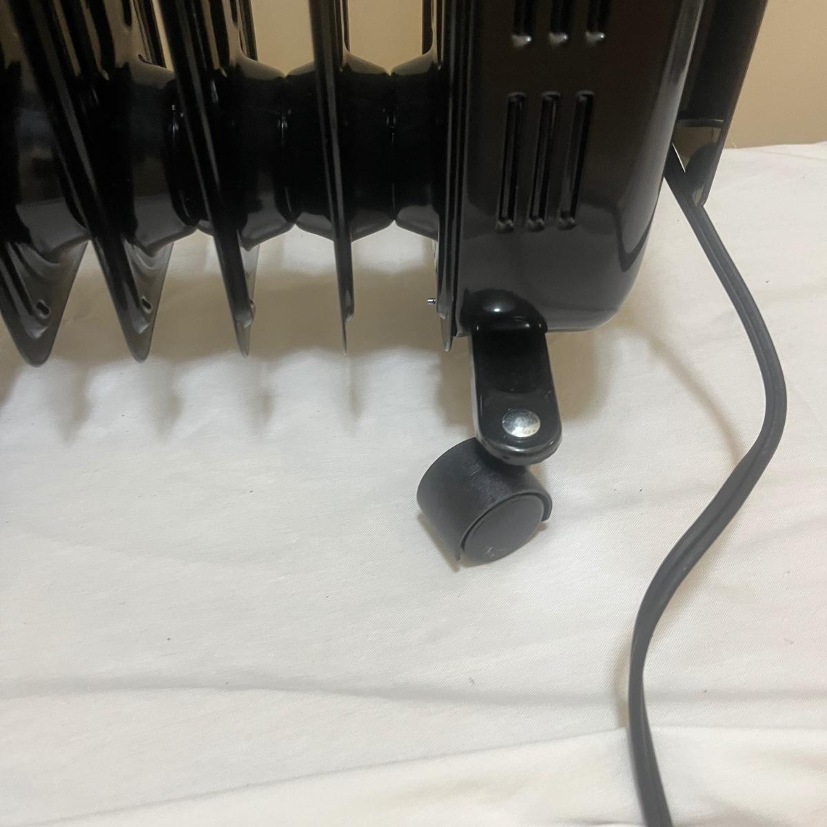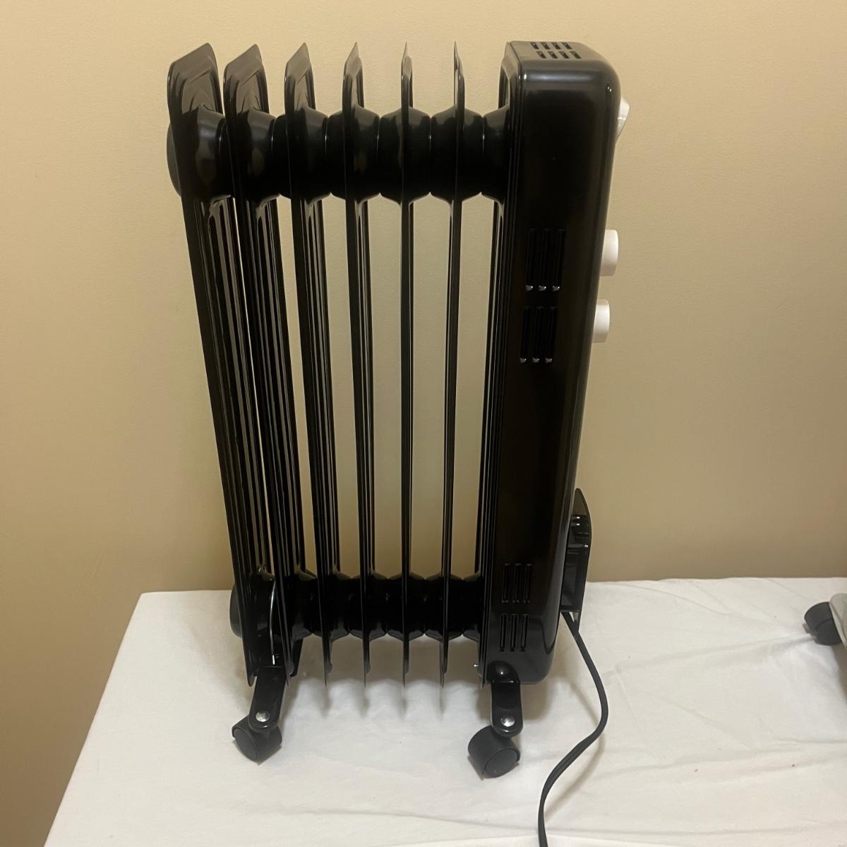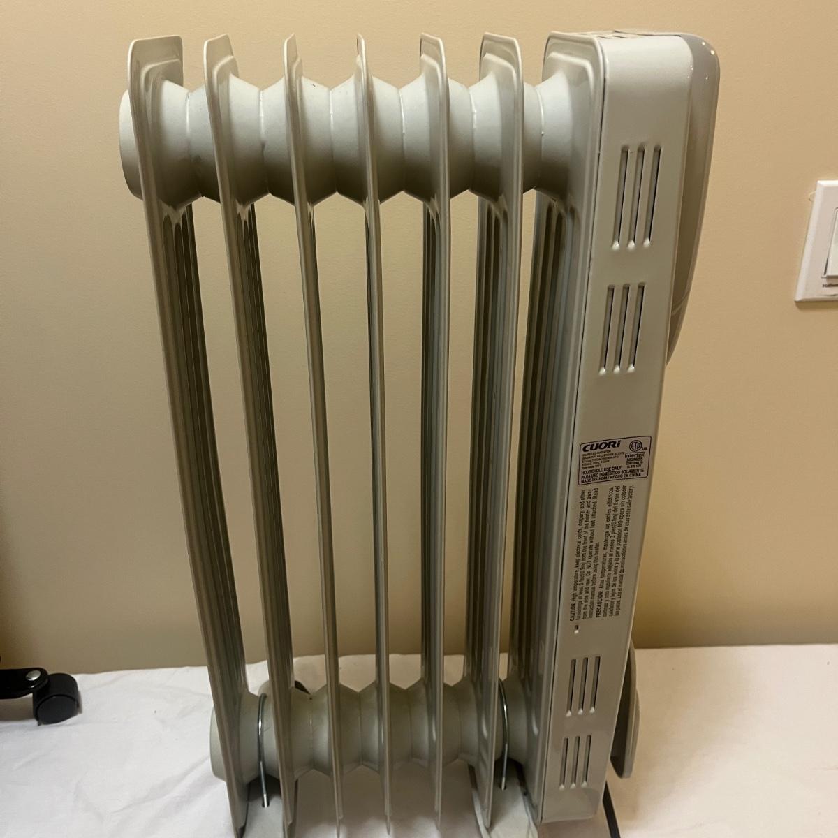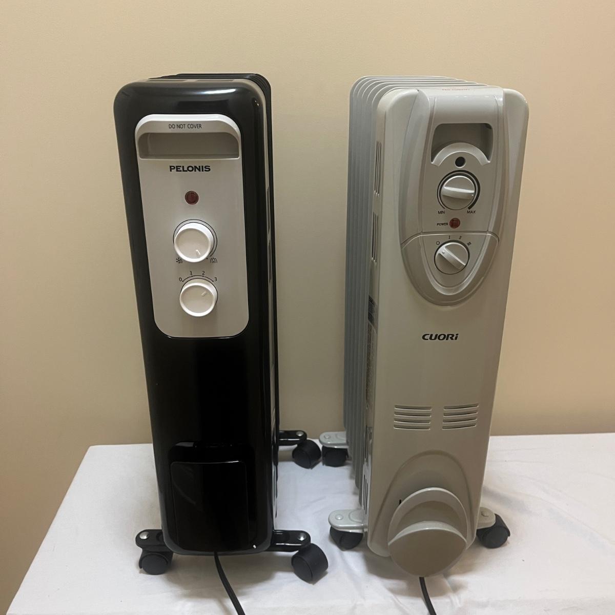 Lot includes one Pelonis oil filled heater and one Cuori oil filled heater. Heaters measure 10” x 13” x 27”H.