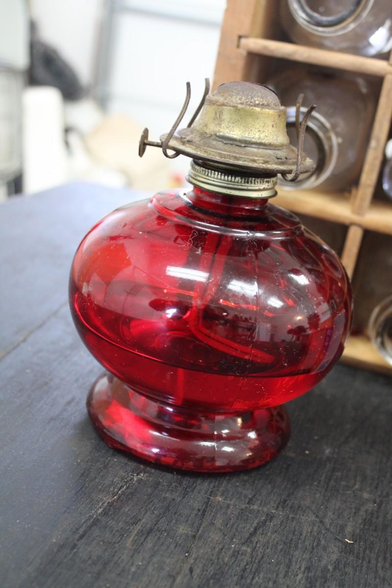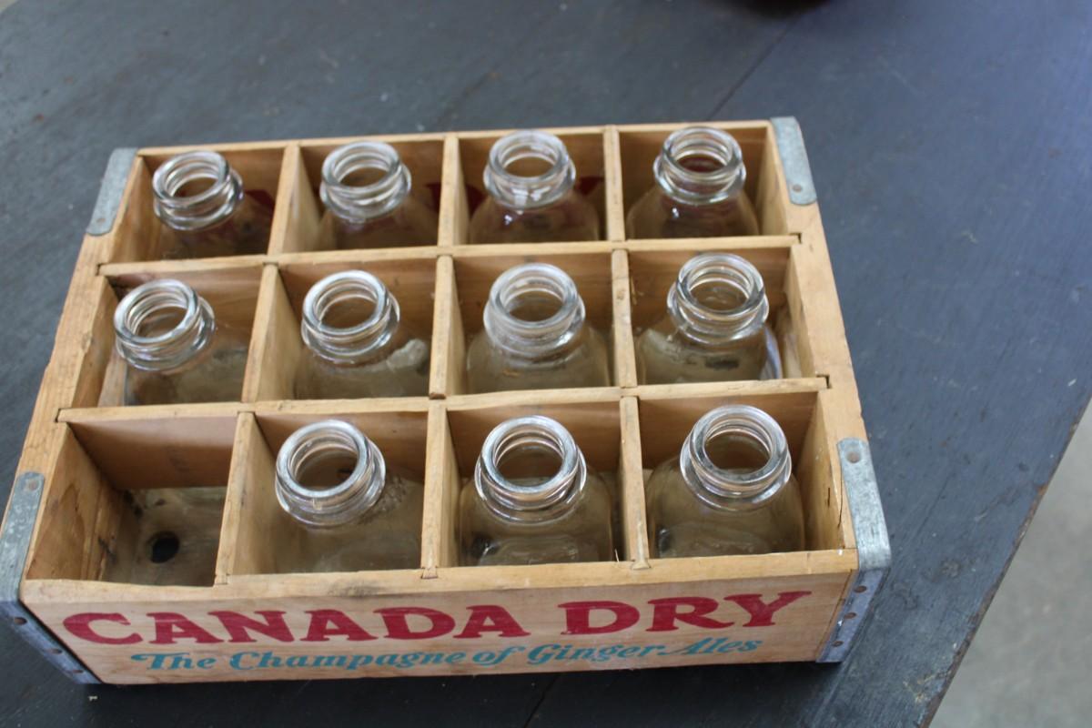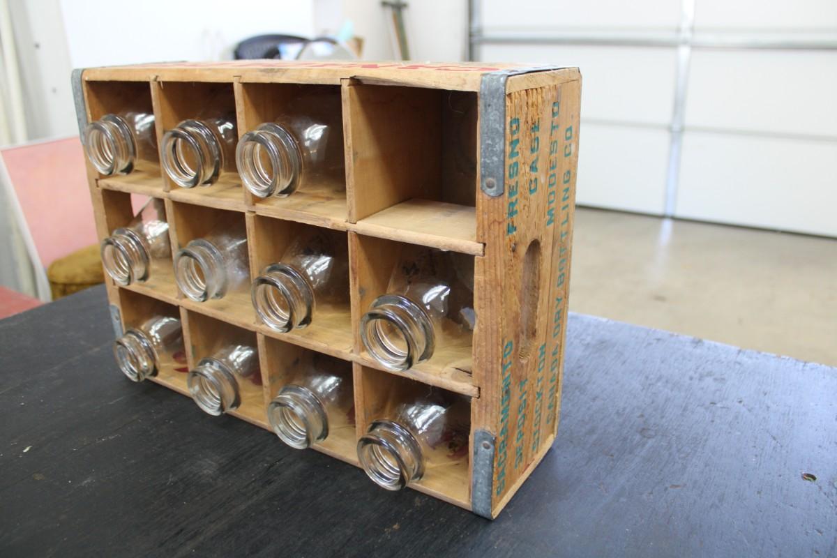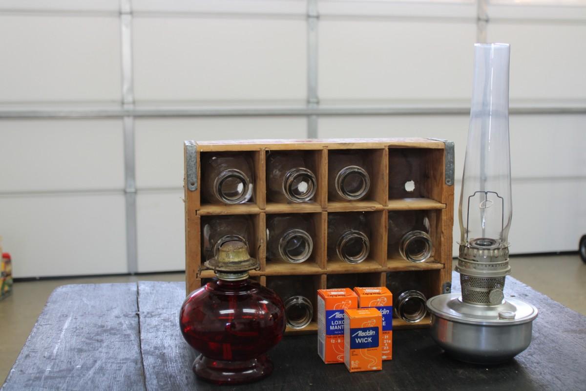 Vintage Two Oil Lamps and Wooden Milk Crate w Bottles; x11 Glass Milk Bottles