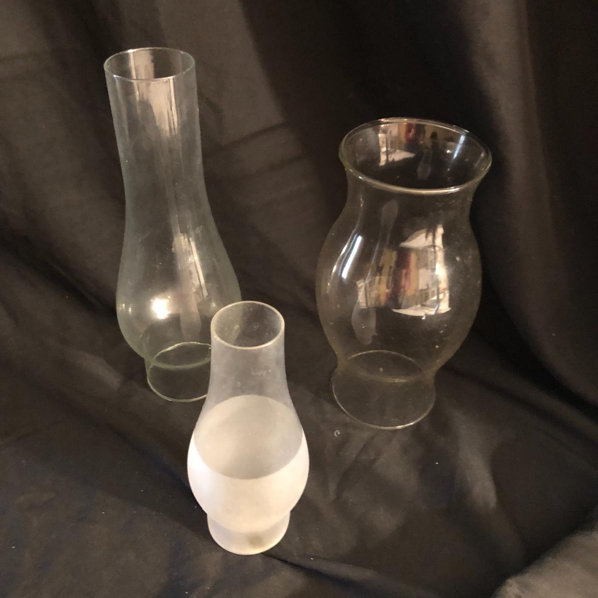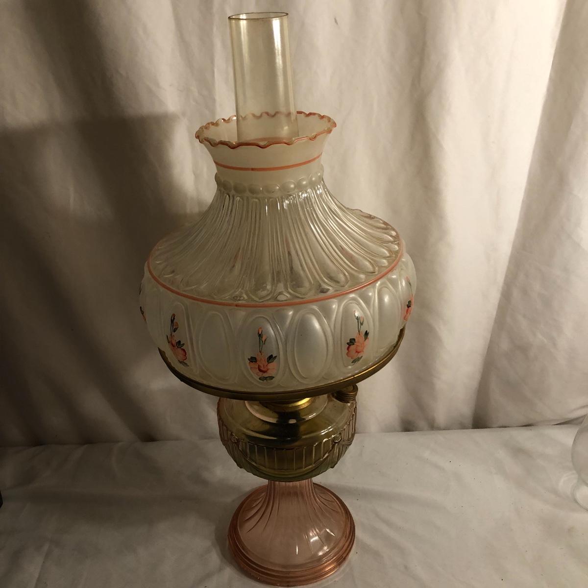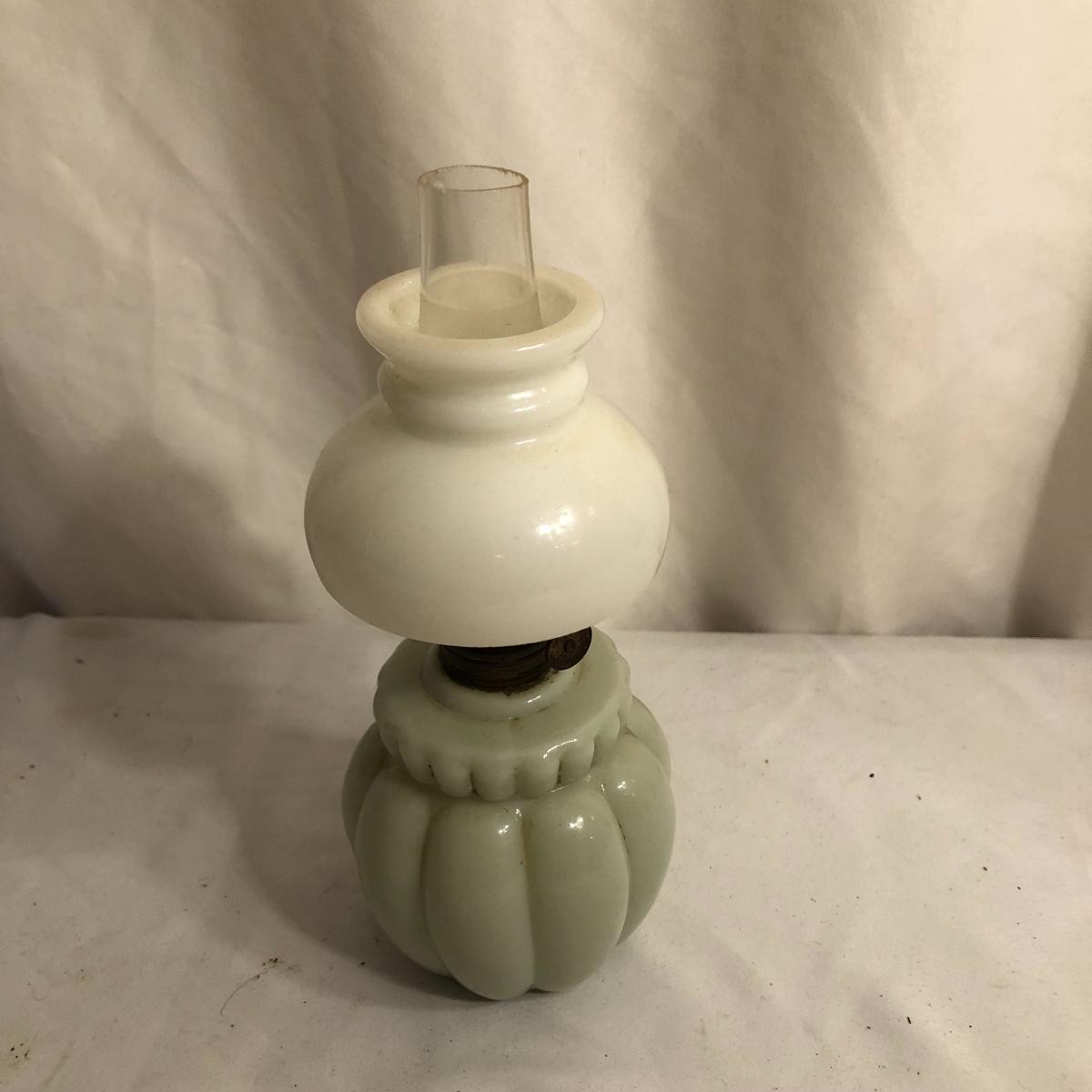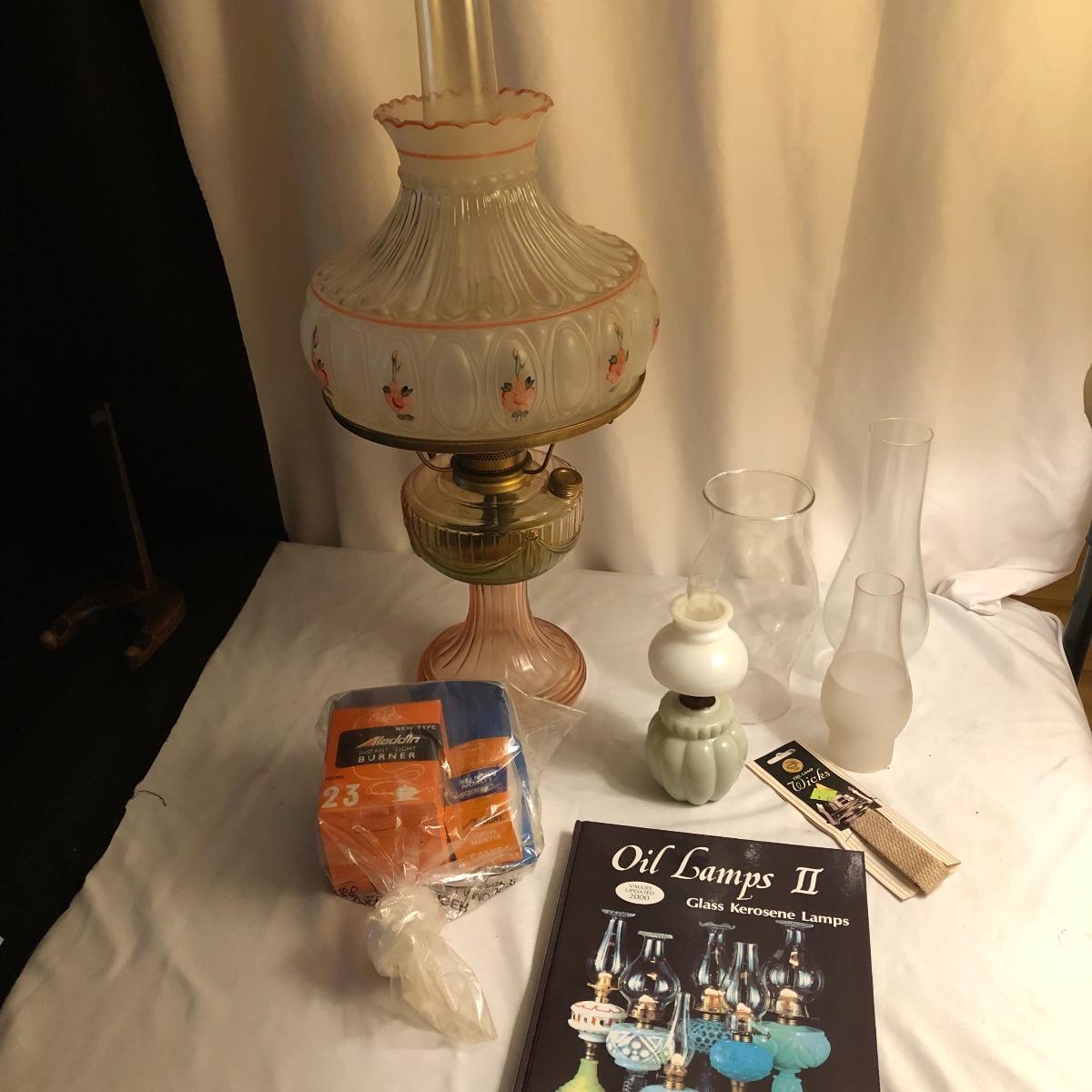 This lot includes two oil lamps, three glass shades, wicks, one book and a plastic bag including a burner and mantle. The diameter of the large oil lamp is about 11” and 25” tall. The small white and green oil lamp is 8” tall. The tallest glass shade is 10” tall and 2.5” wide at the base. The widest shade is 8.5” tall and 3.5” wide at the base. Shipping Available.