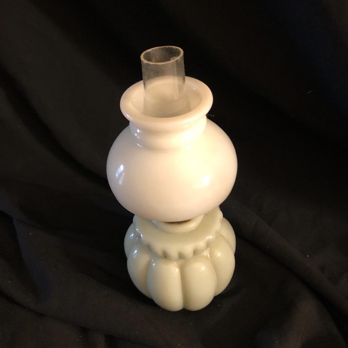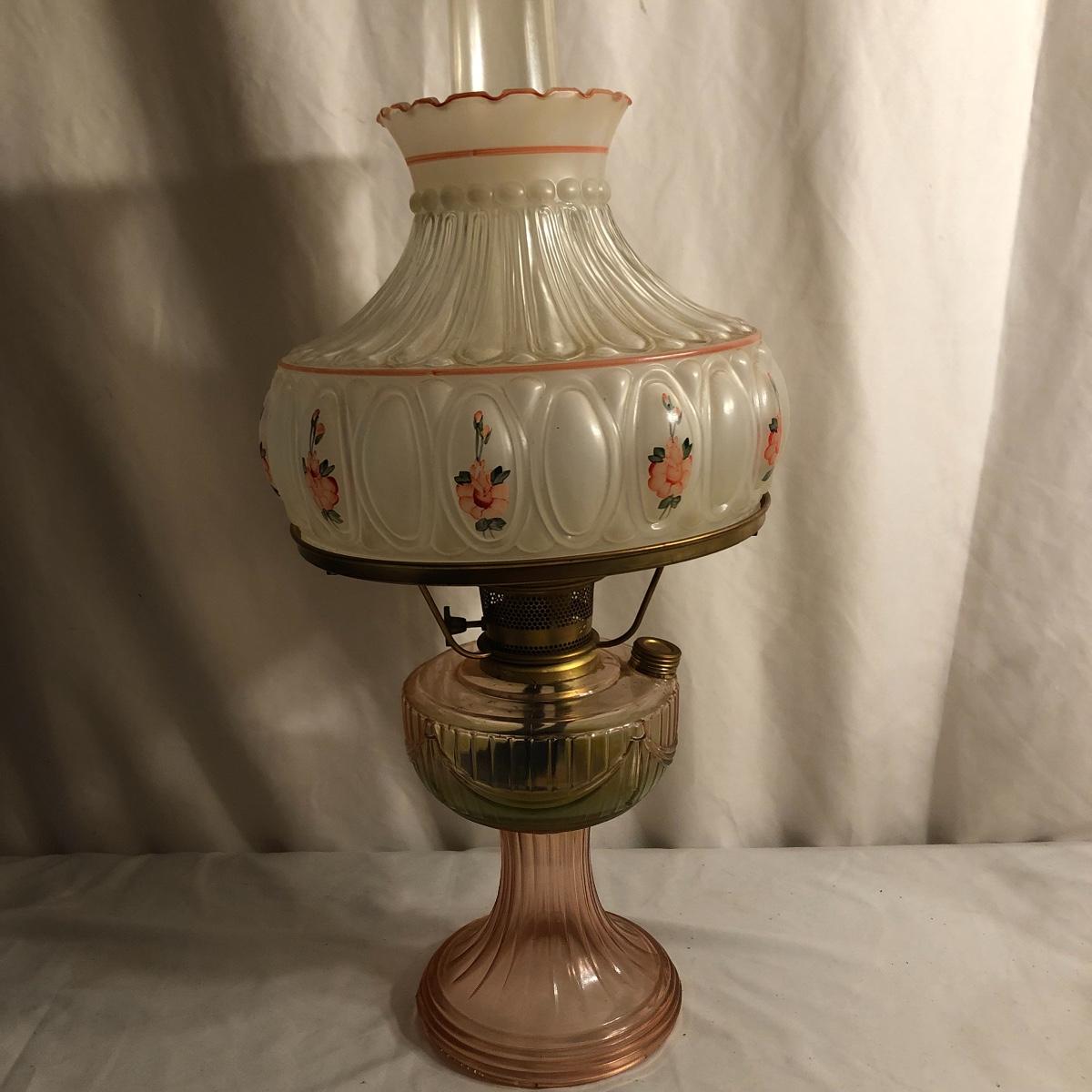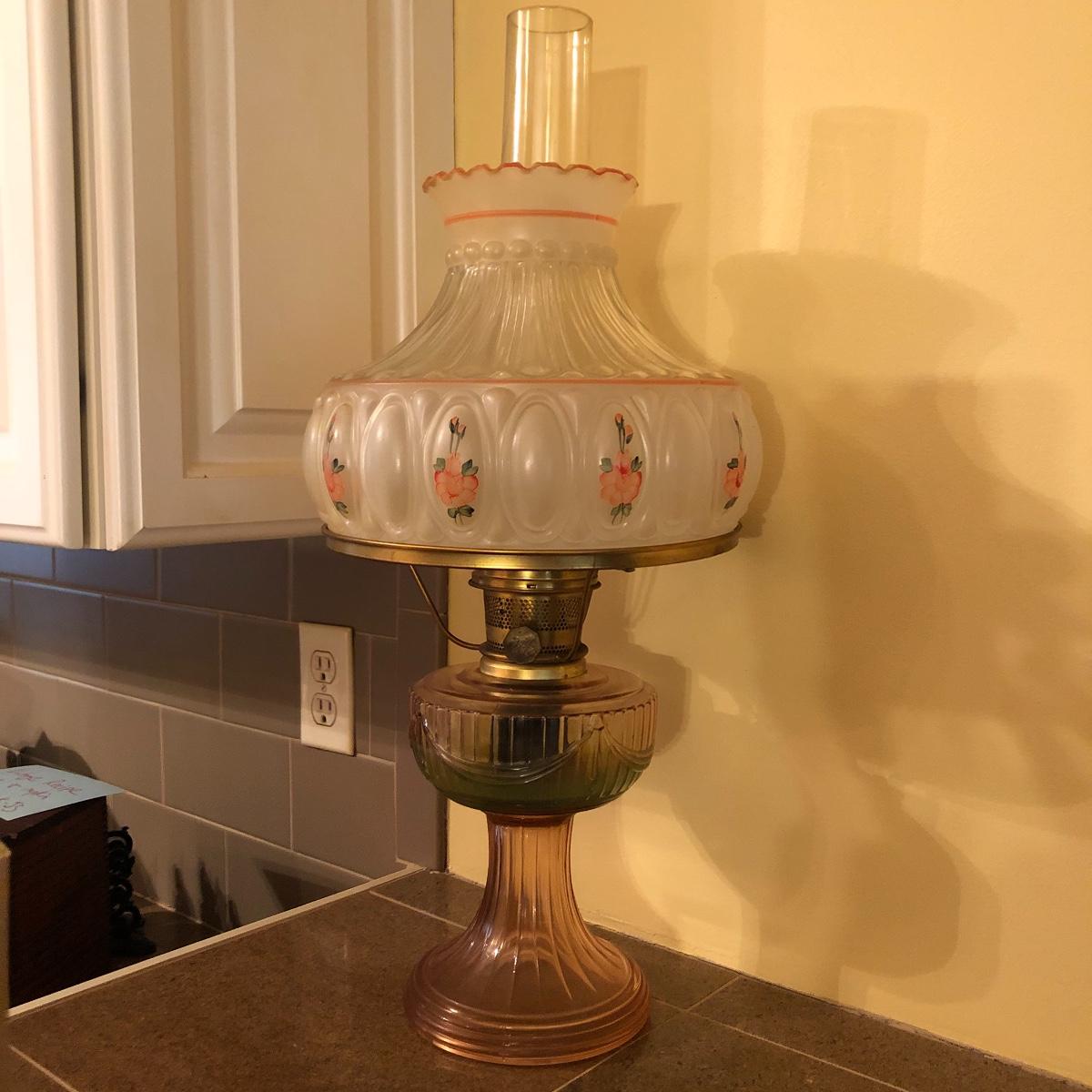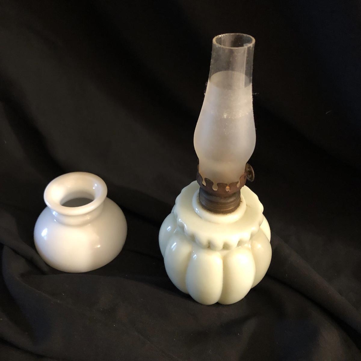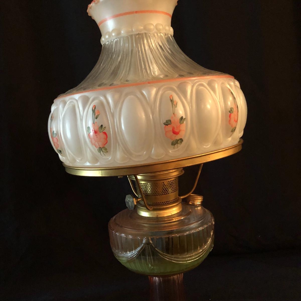 This lot includes two oil lamps, three glass shades, wicks, one book and a plastic bag including a burner and mantle. The diameter of the large oil lamp is about 11” and 25” tall. The small white and green oil lamp is 8” tall. The tallest glass shade is 10” tall and 2.5” wide at the base. The widest shade is 8.5” tall and 3.5” wide at the base. Shipping Available.