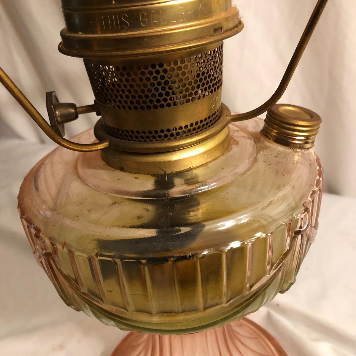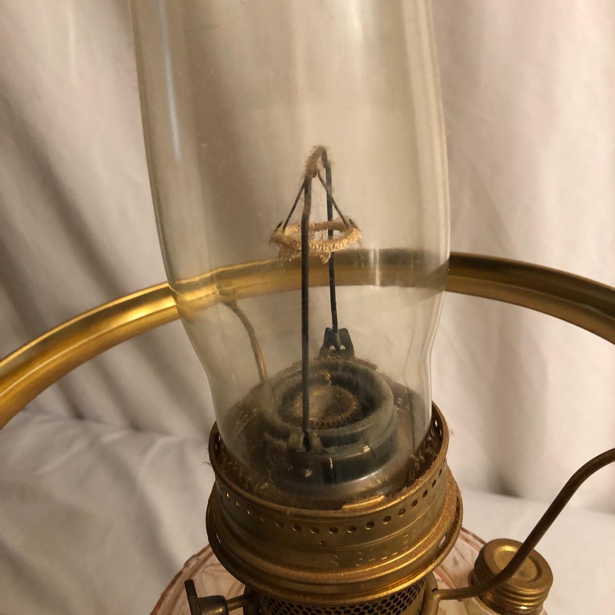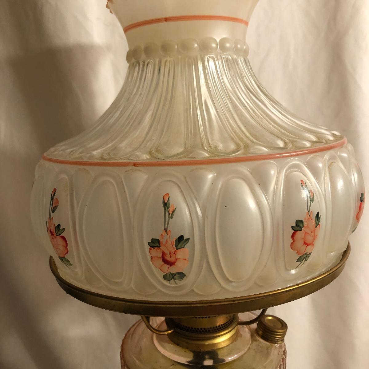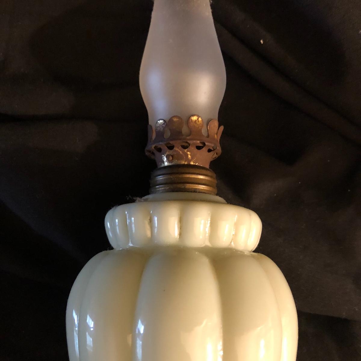 This lot includes two oil lamps, three glass shades, wicks, one book and a plastic bag including a burner and mantle. The diameter of the large oil lamp is about 11” and 25” tall. The small white and green oil lamp is 8” tall. The tallest glass shade is 10” tall and 2.5” wide at the base. The widest shade is 8.5” tall and 3.5” wide at the base. Shipping Available.