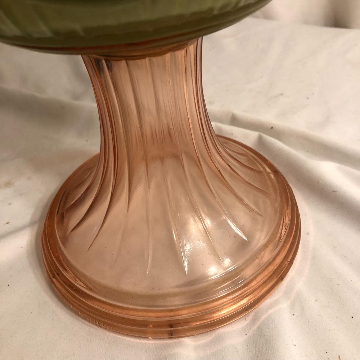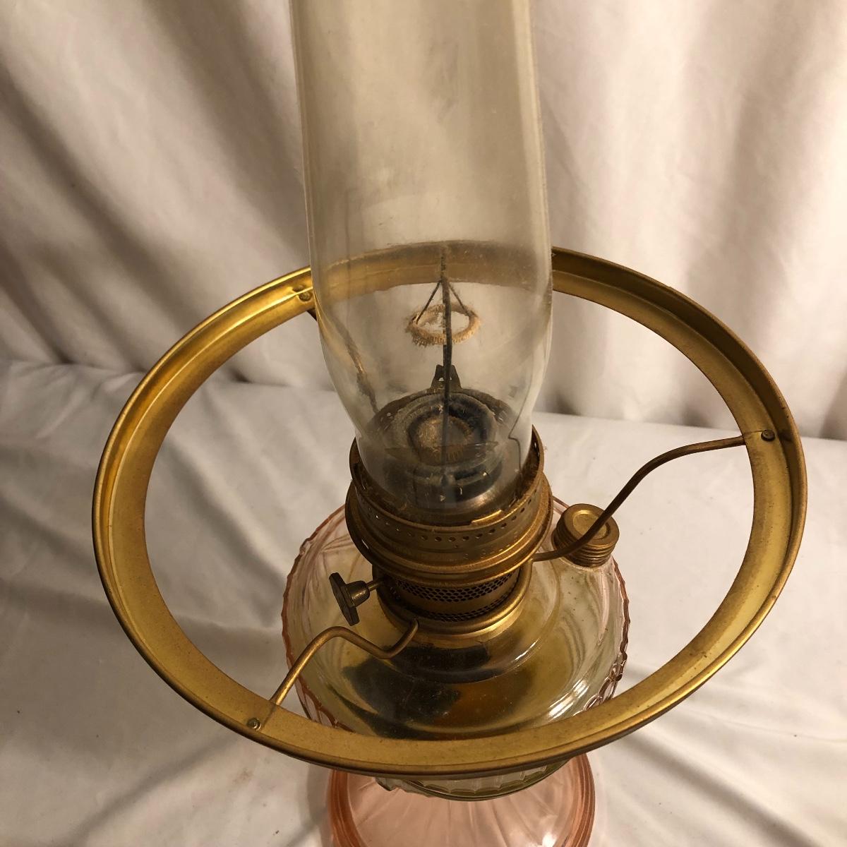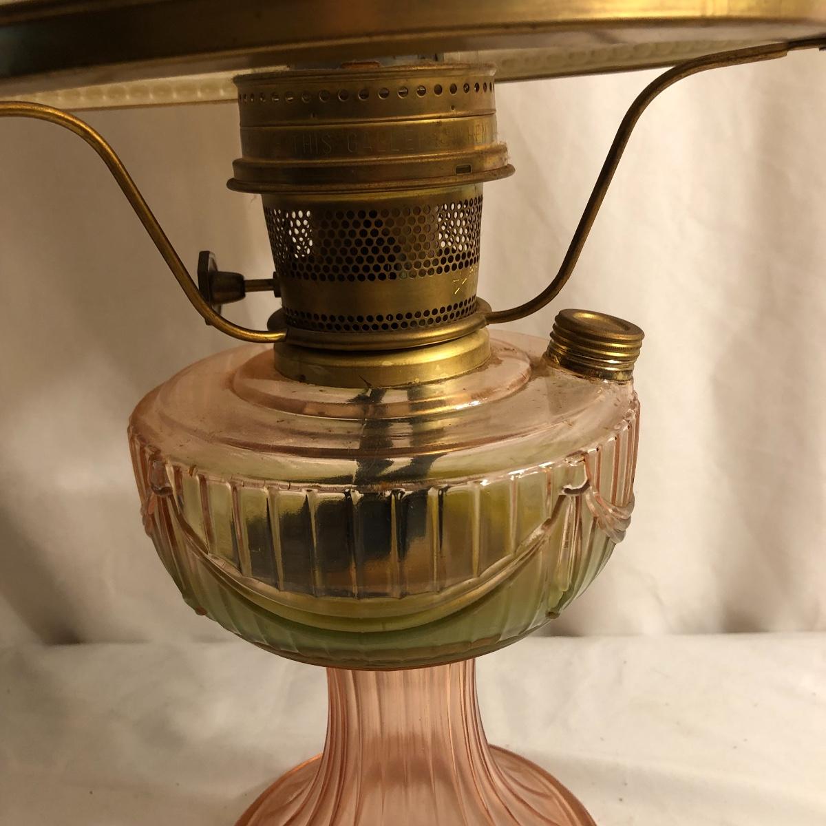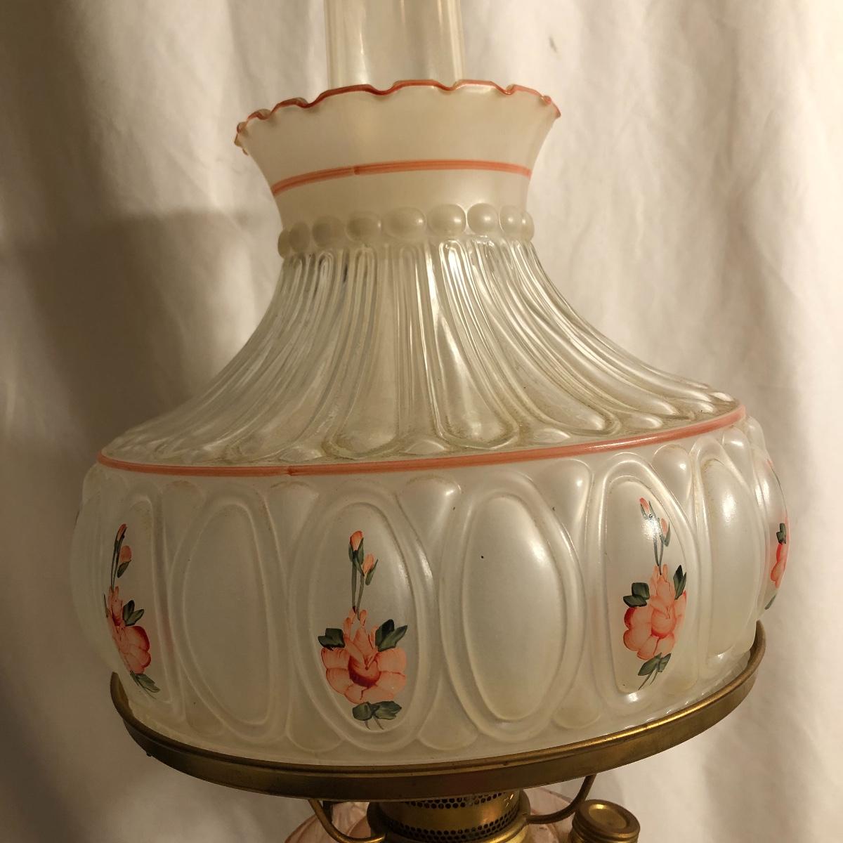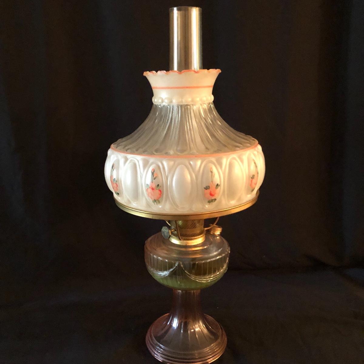 This lot includes two oil lamps, three glass shades, wicks, one book and a plastic bag including a burner and mantle. The diameter of the large oil lamp is about 11” and 25” tall. The small white and green oil lamp is 8” tall. The tallest glass shade is 10” tall and 2.5” wide at the base. The widest shade is 8.5” tall and 3.5” wide at the base. Shipping Available.