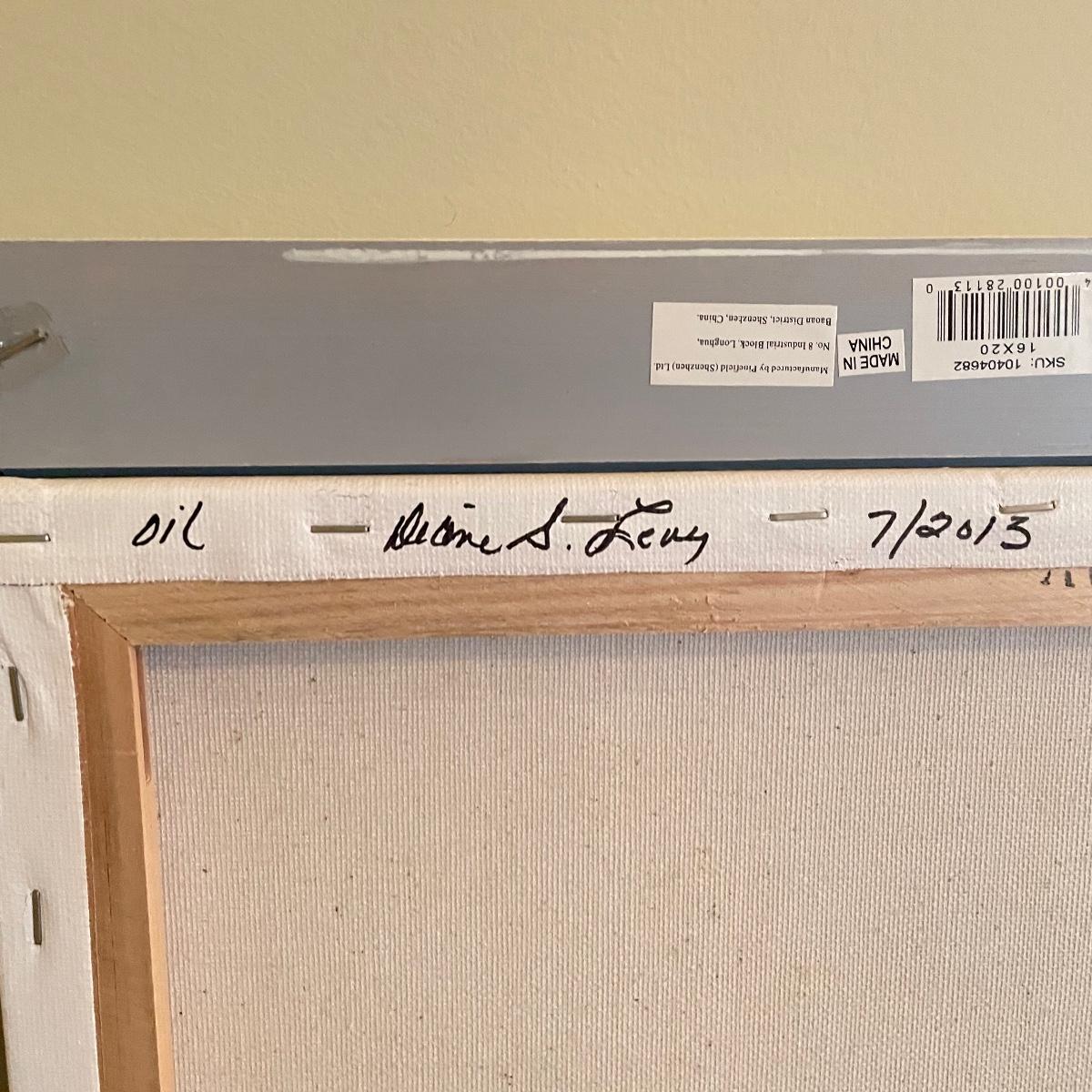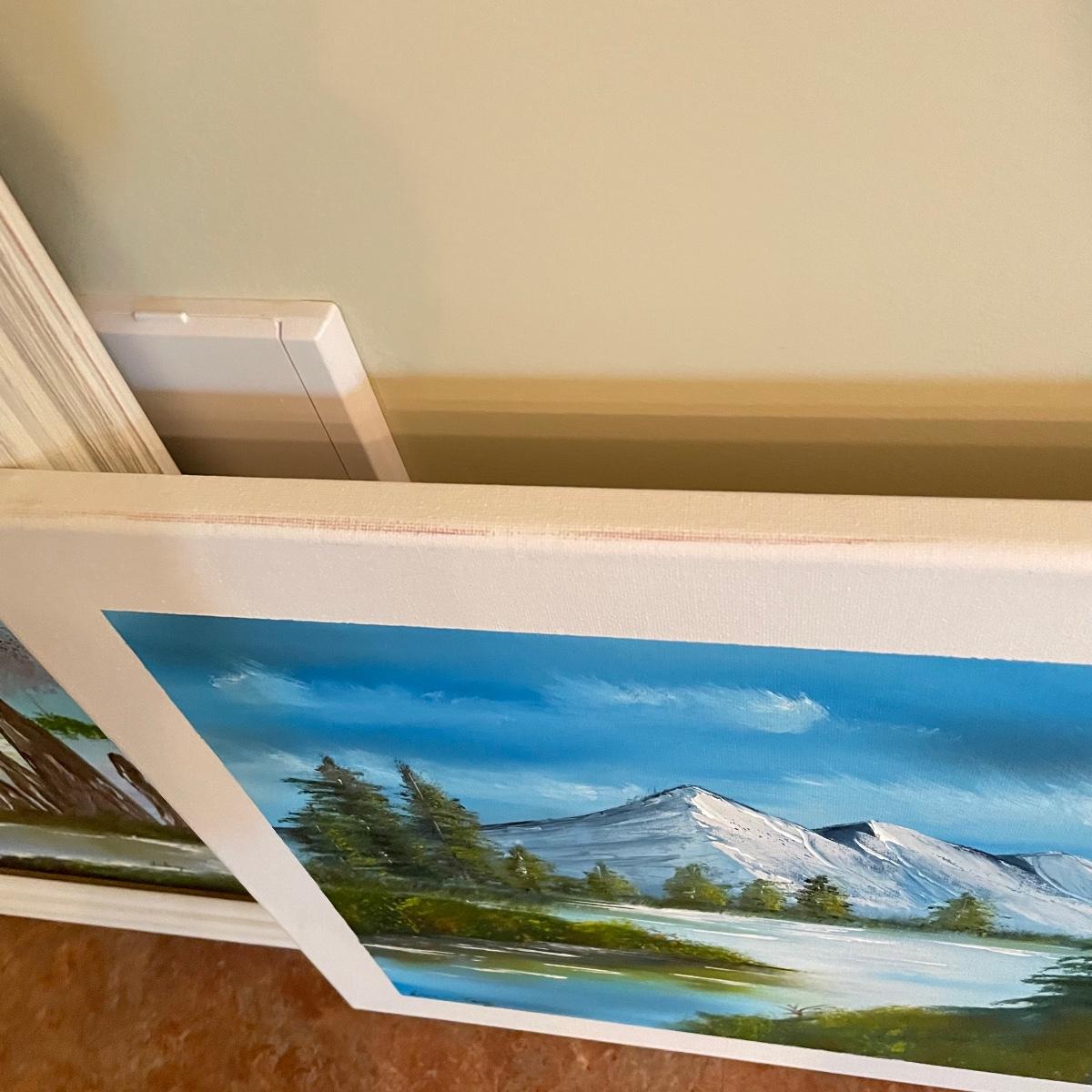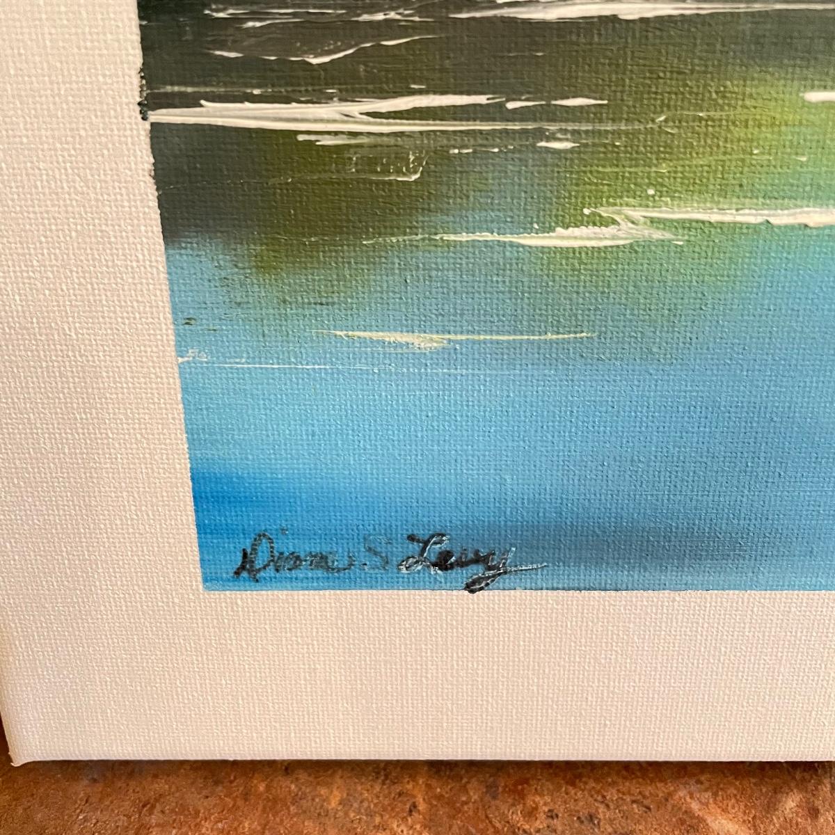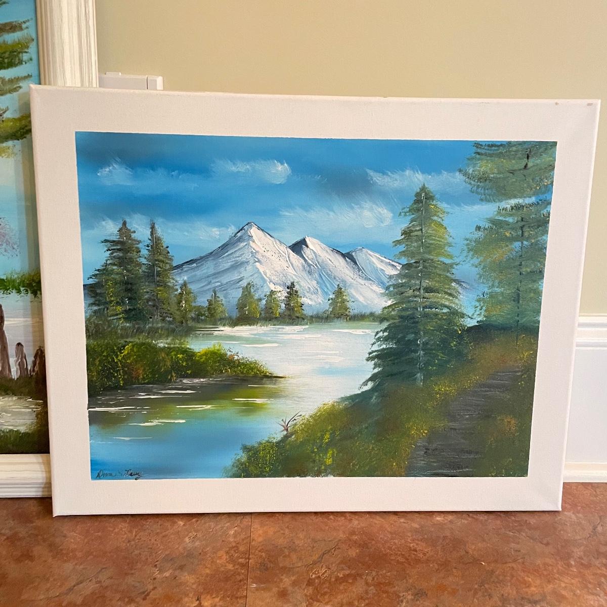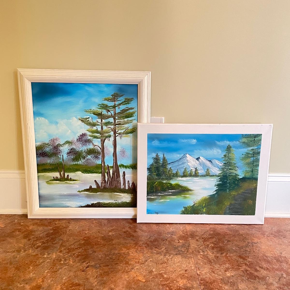 Beautiful mountain lake scene is an oil on canvas stretched over a wood frame measuring 20” x 16”. The next white wooden framed piece measures 19.5” x 23.5”. Both signed by the estate owner, Diane Levy. Shipping available. Please call UPS with dimensions at 828-252-6930 for a shipping quote prior to bidding.