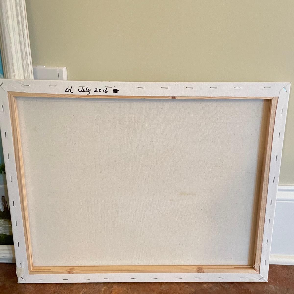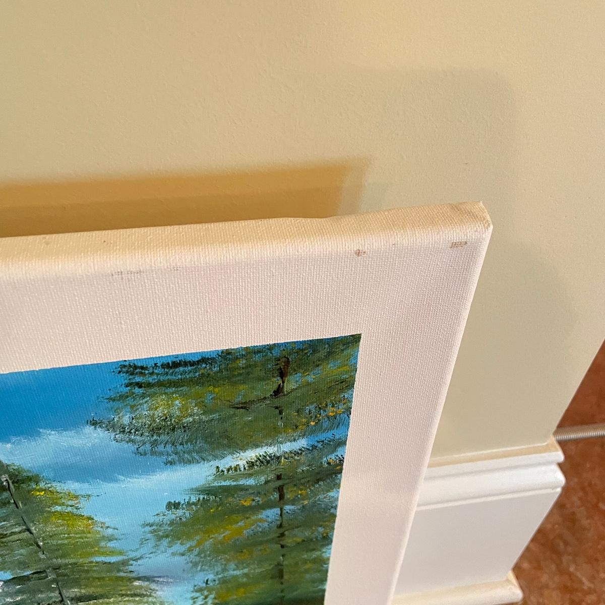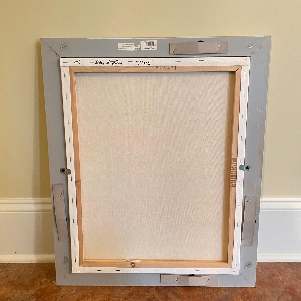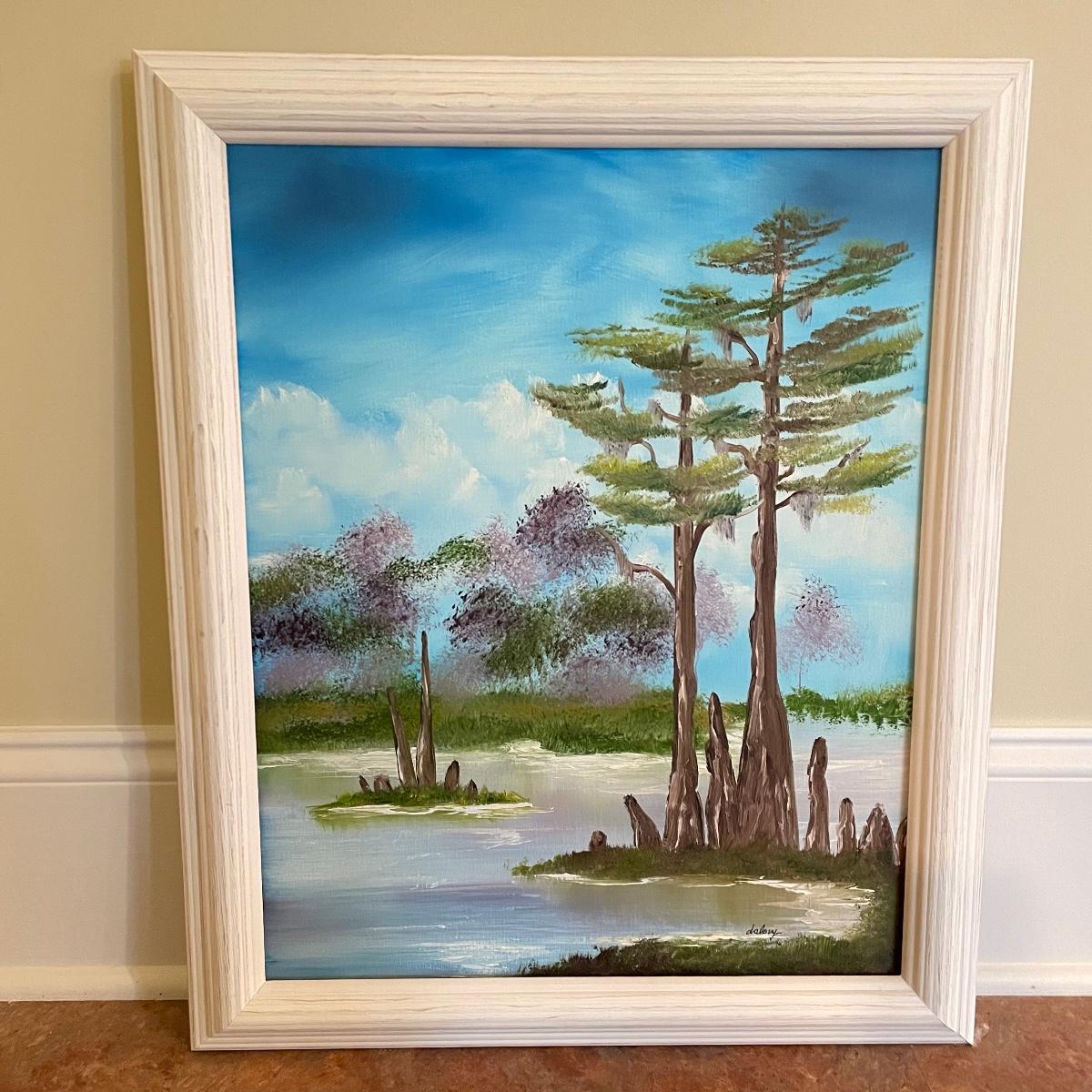 Beautiful mountain lake scene is an oil on canvas stretched over a wood frame measuring 20” x 16”. The next white wooden framed piece measures 19.5” x 23.5”. Both signed by the estate owner, Diane Levy. Shipping available. Please call UPS with dimensions at 828-252-6930 for a shipping quote prior to bidding.