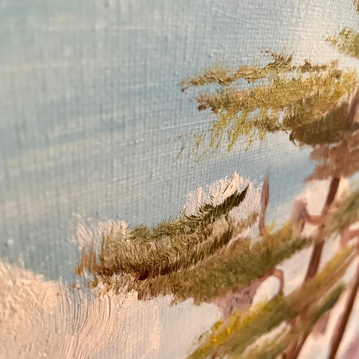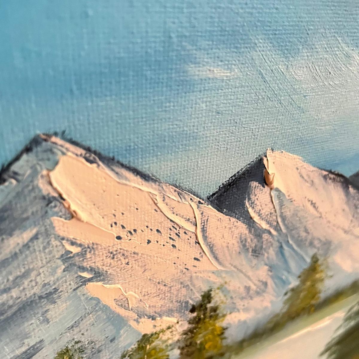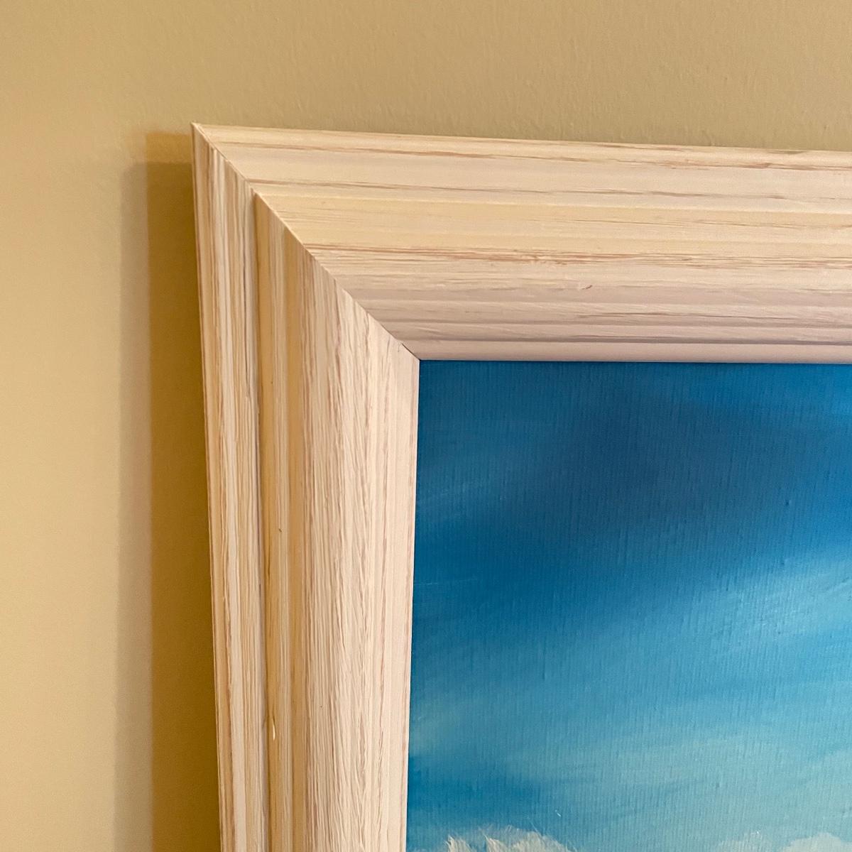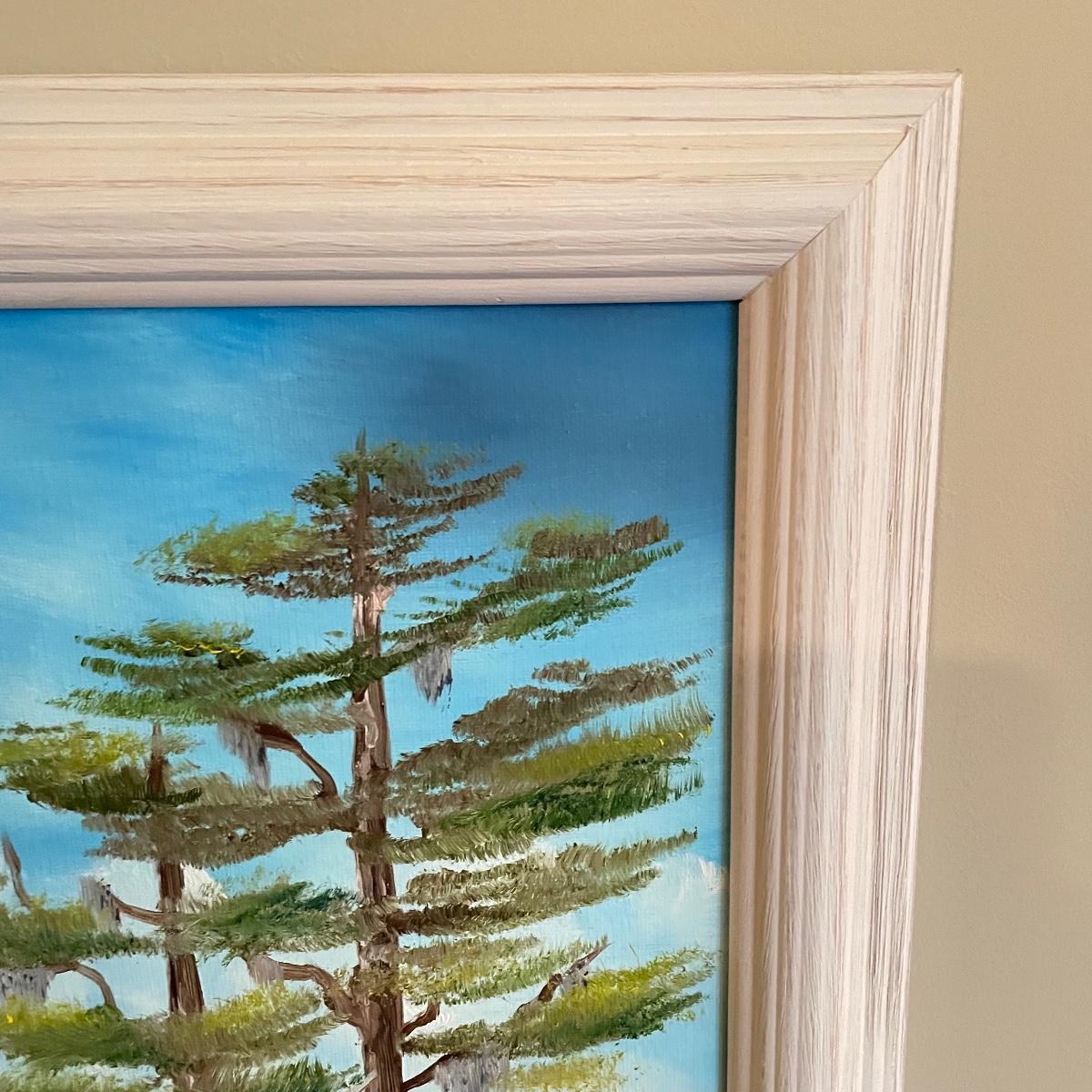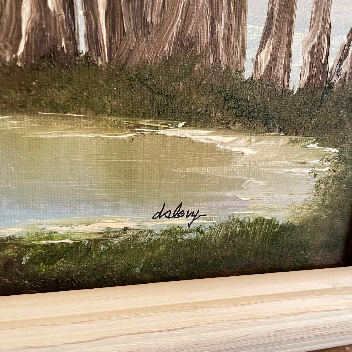 Beautiful mountain lake scene is an oil on canvas stretched over a wood frame measuring 20” x 16”. The next white wooden framed piece measures 19.5” x 23.5”. Both signed by the estate owner, Diane Levy. Shipping available. Please call UPS with dimensions at 828-252-6930 for a shipping quote prior to bidding.