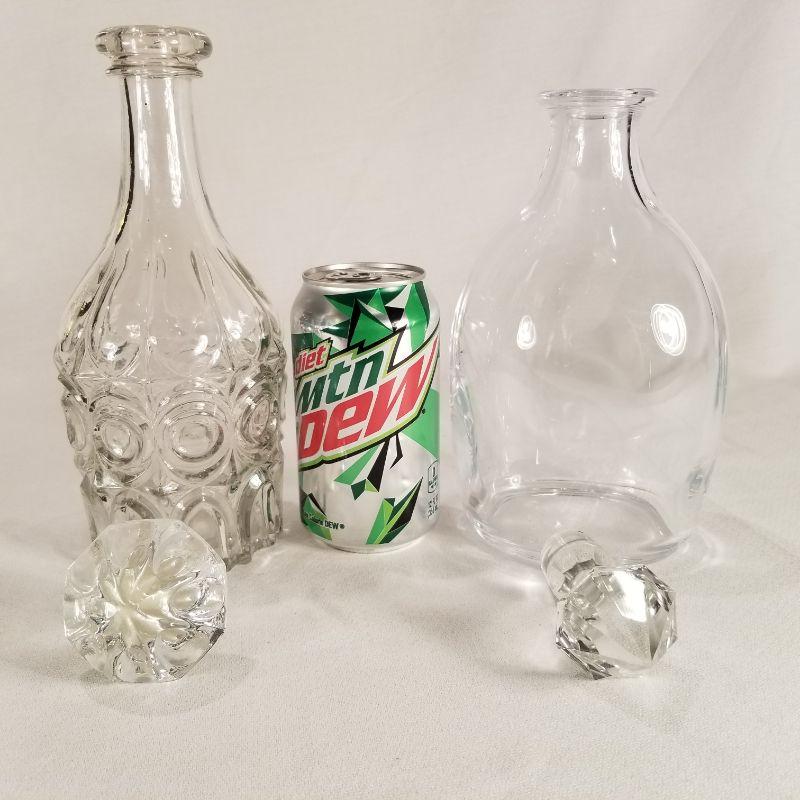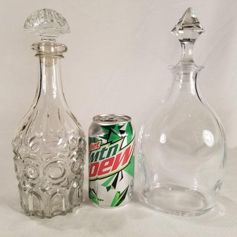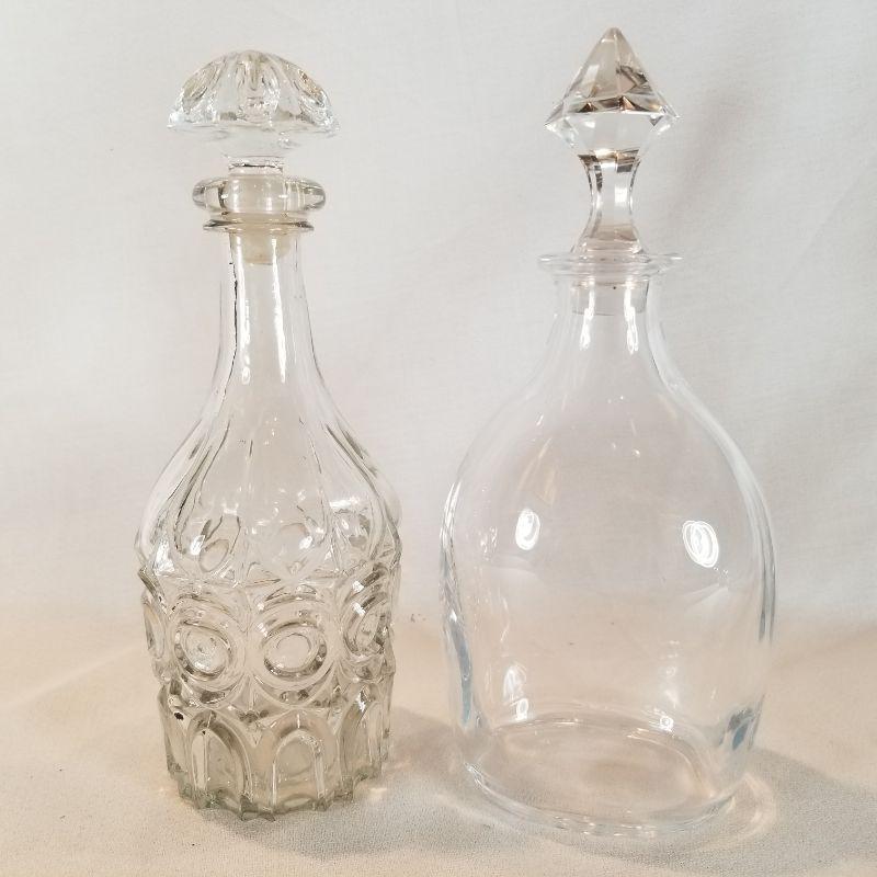 These Glass Decanters will bring joy to your bar or party cart. The thumbprint decanter is thought to be consistent with other examples from the late 1800s. The simple decanter is newer but impressive. Both are in very good condition consistent with age. Both have stoppers that are snug.