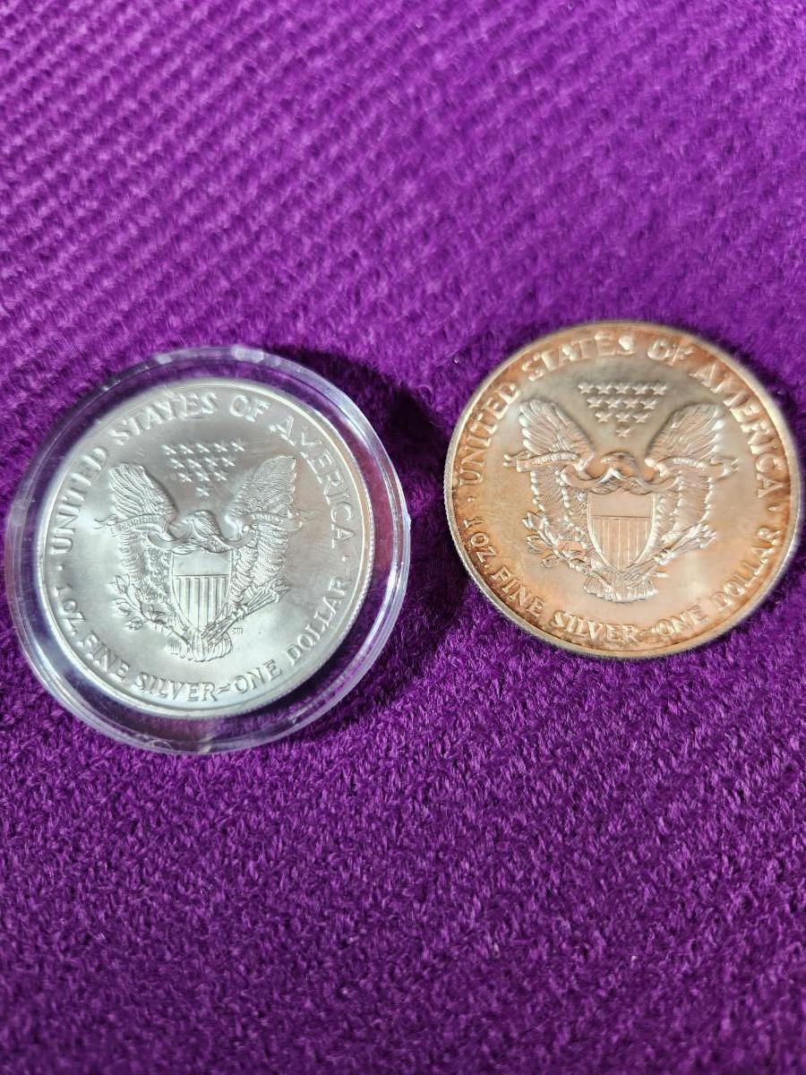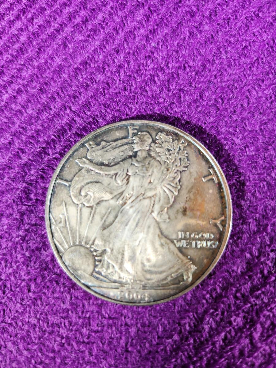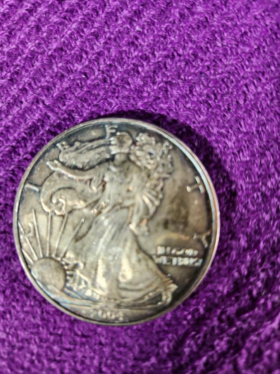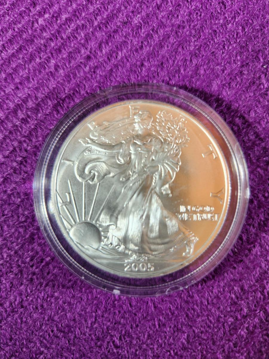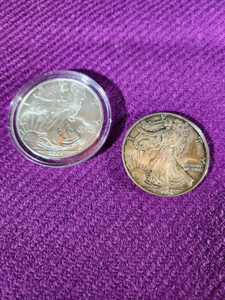 This auction lot is for Two One Dollar Silver Eagles. The 2005 coin is encased in a plastic keeper. The 2004 has been circulated and handled. Each coin is 1 ounce of silver.
