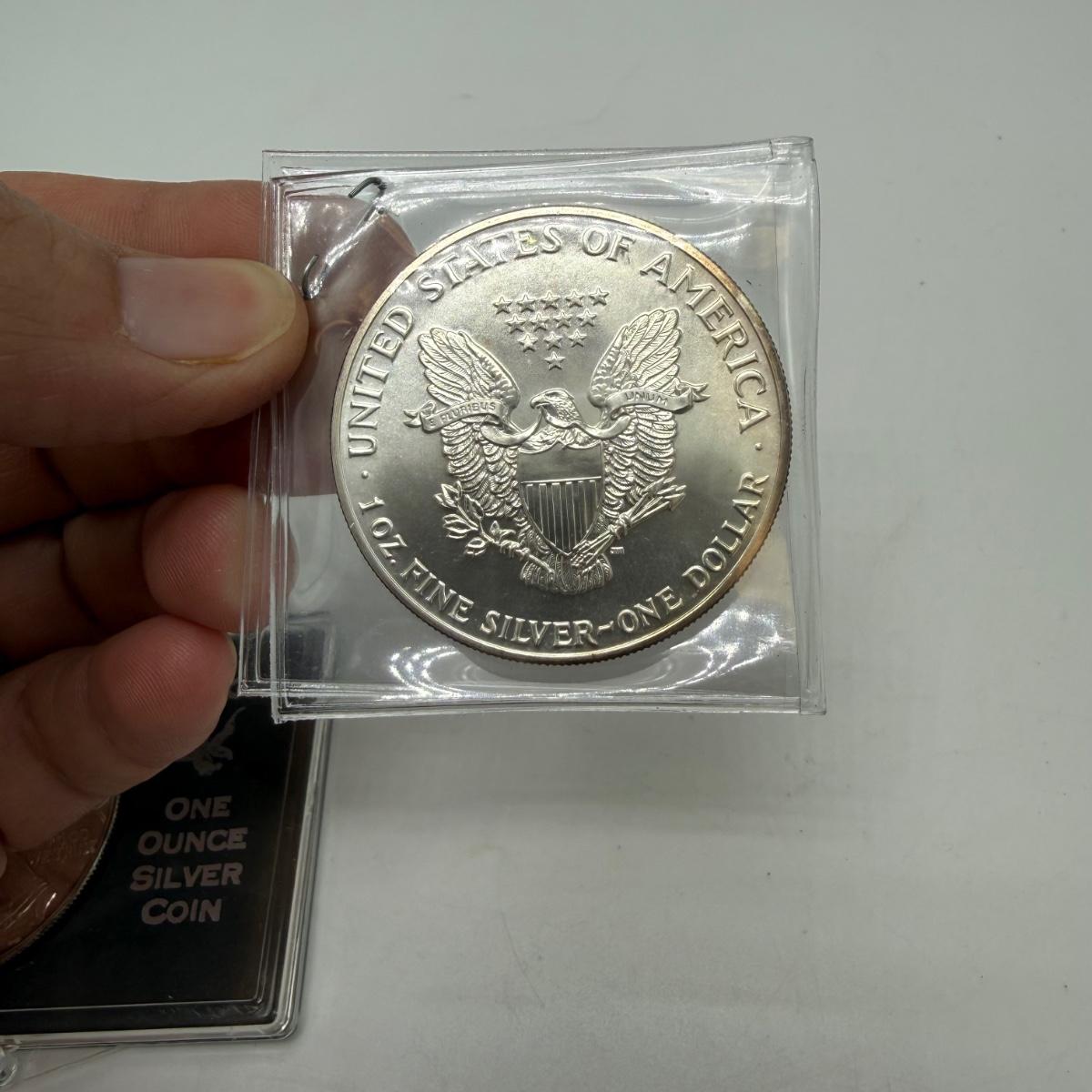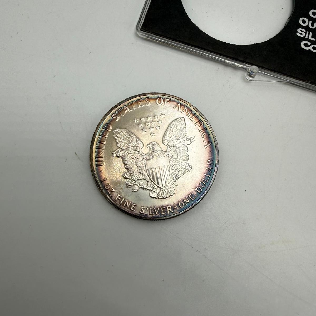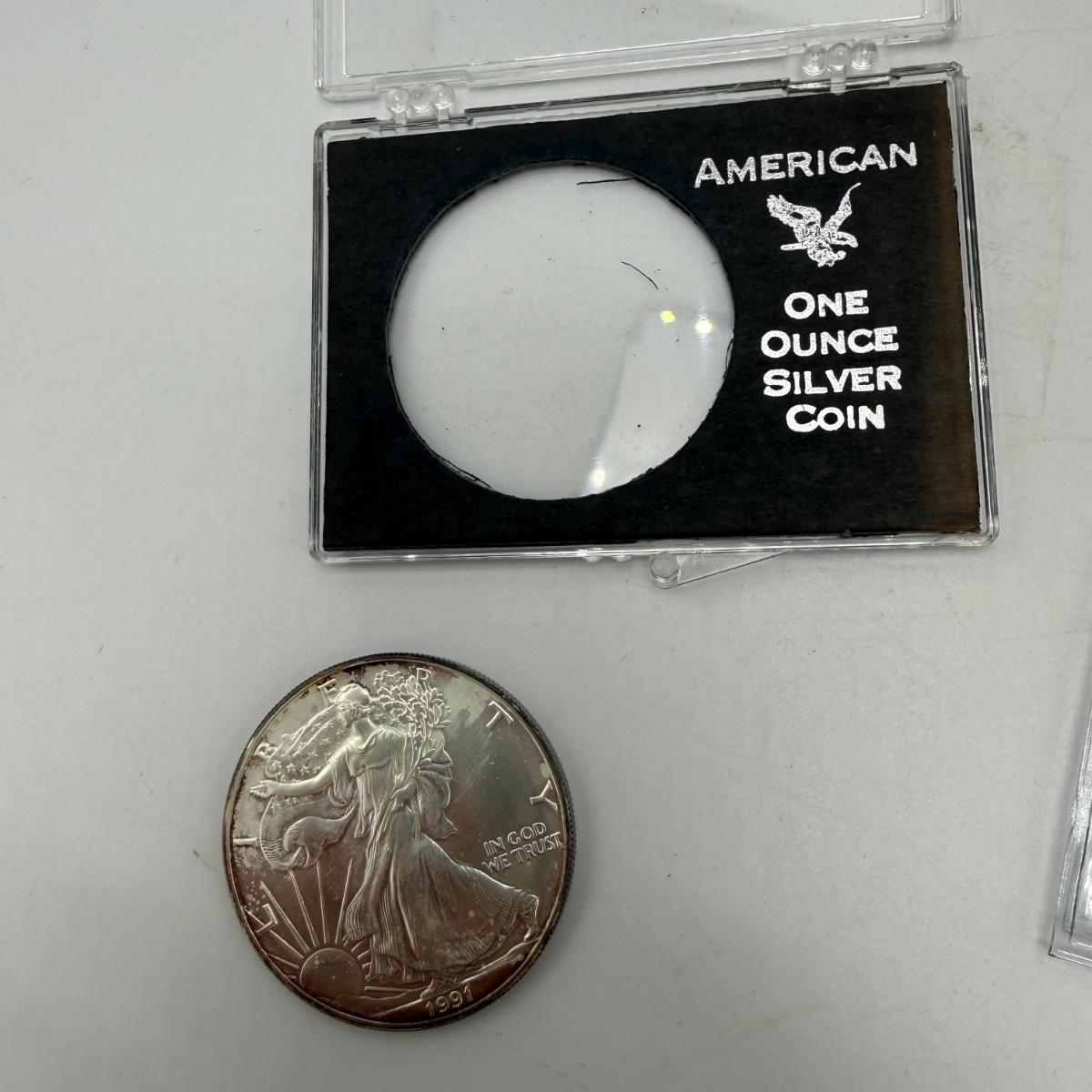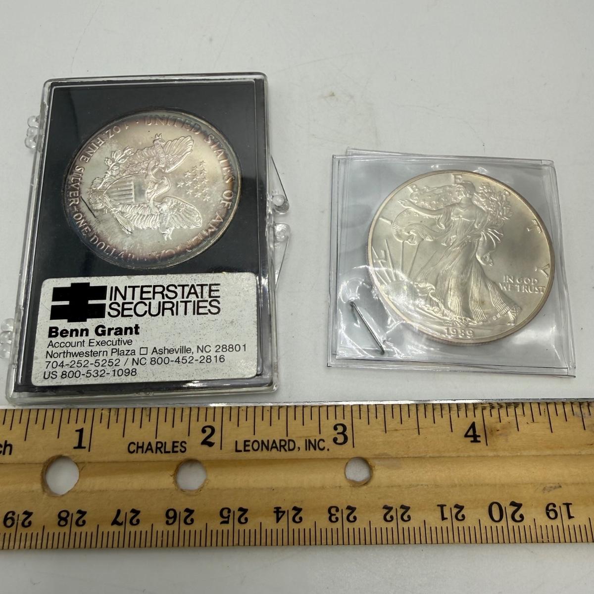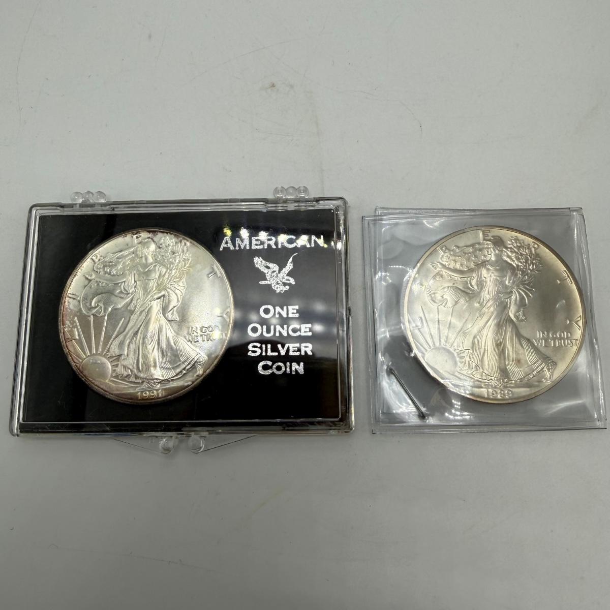 1989 and 1991 one Troy ounce Silver Eagle dollar coins. The 1991 coin is in a case and has some black and other toning. All sales are final. No returns or refunds. Please bid accordingly. Shipping available.