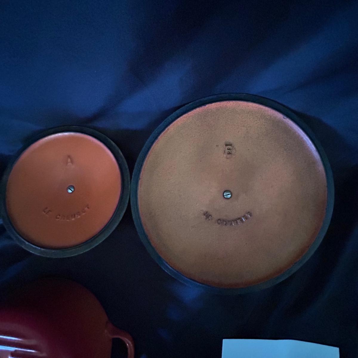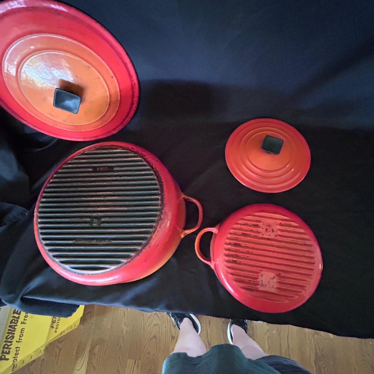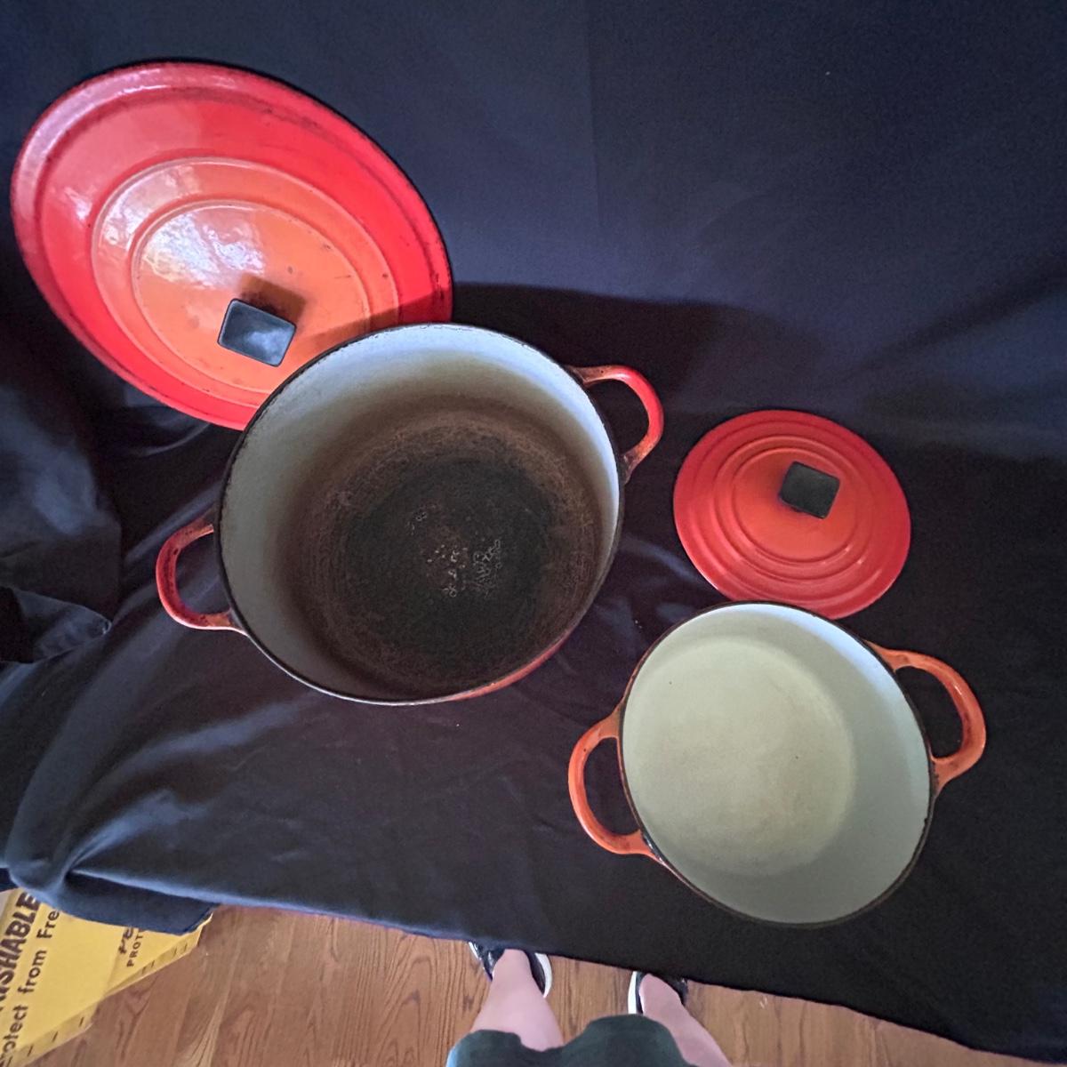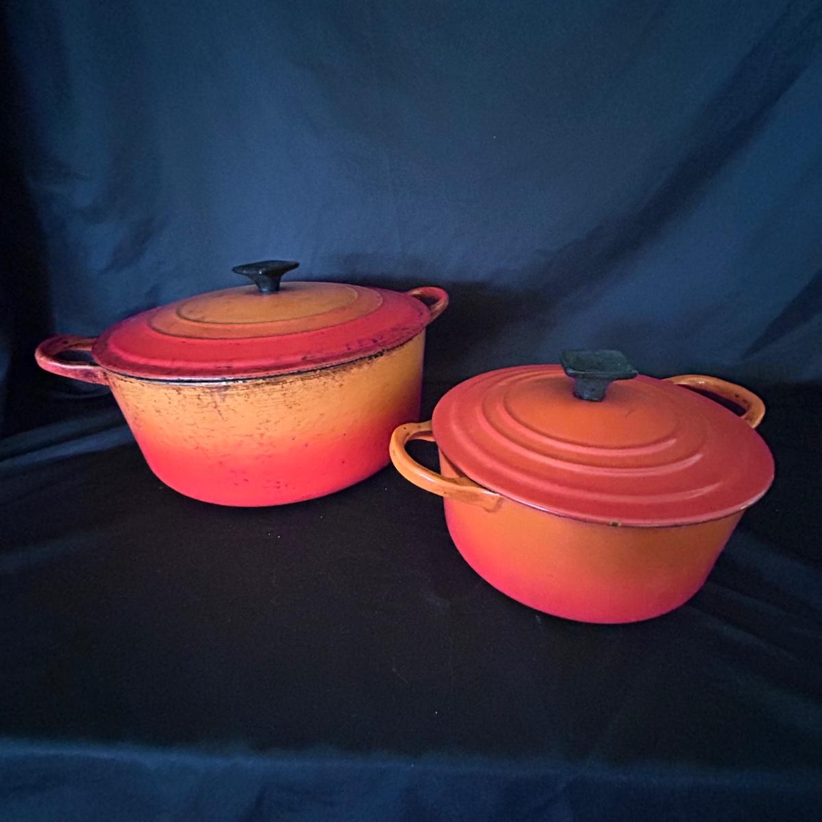 Two Le Creuset Dutch ovens in Flame style with lids. The large one is well worn. Sizes E and A. Local pick up only.