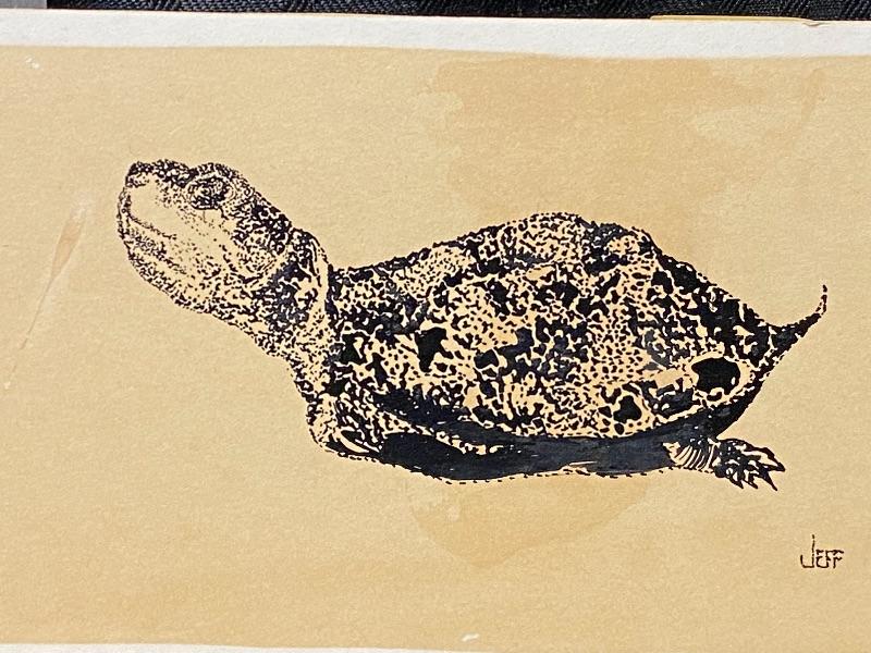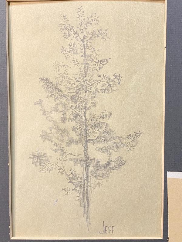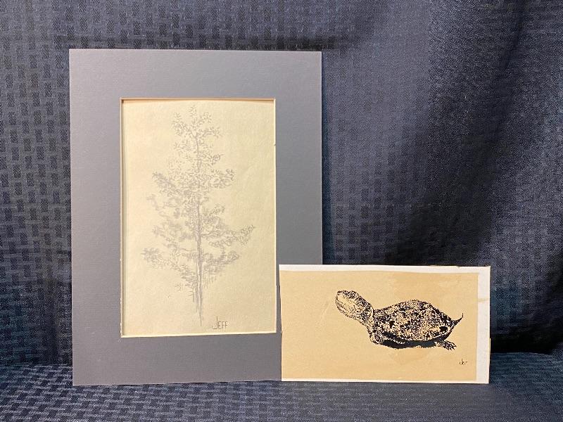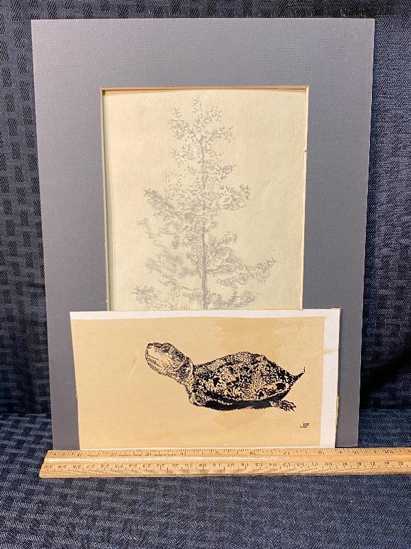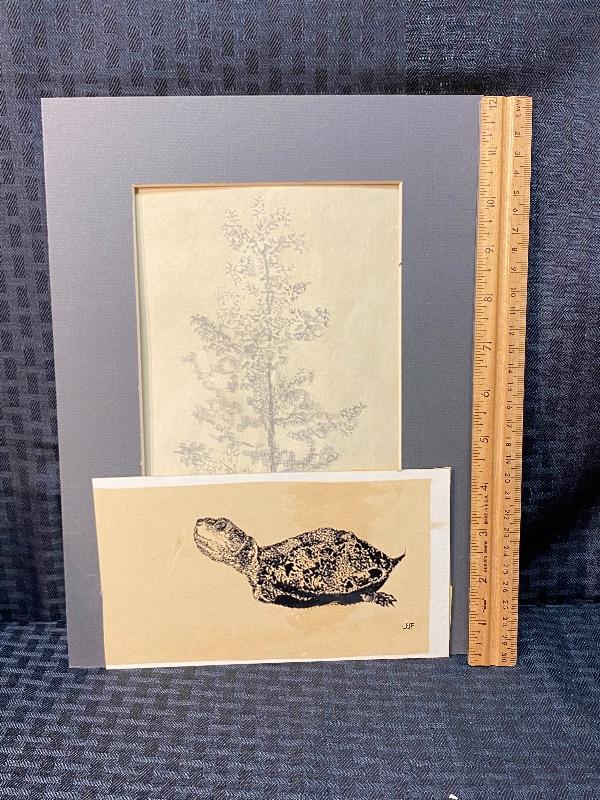 Pair of original art pieces by Jeff. Unsure who Jeff is but these are originals, not prints. The turtle is a stamped etching, there is texture to the ink. The tree is done in pencil. Tree is 9"x12"matted, the turtle is about 7.5"x4".Slight discoloration from age and storage.