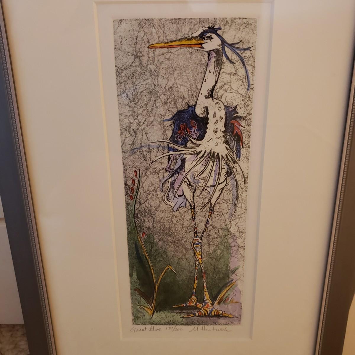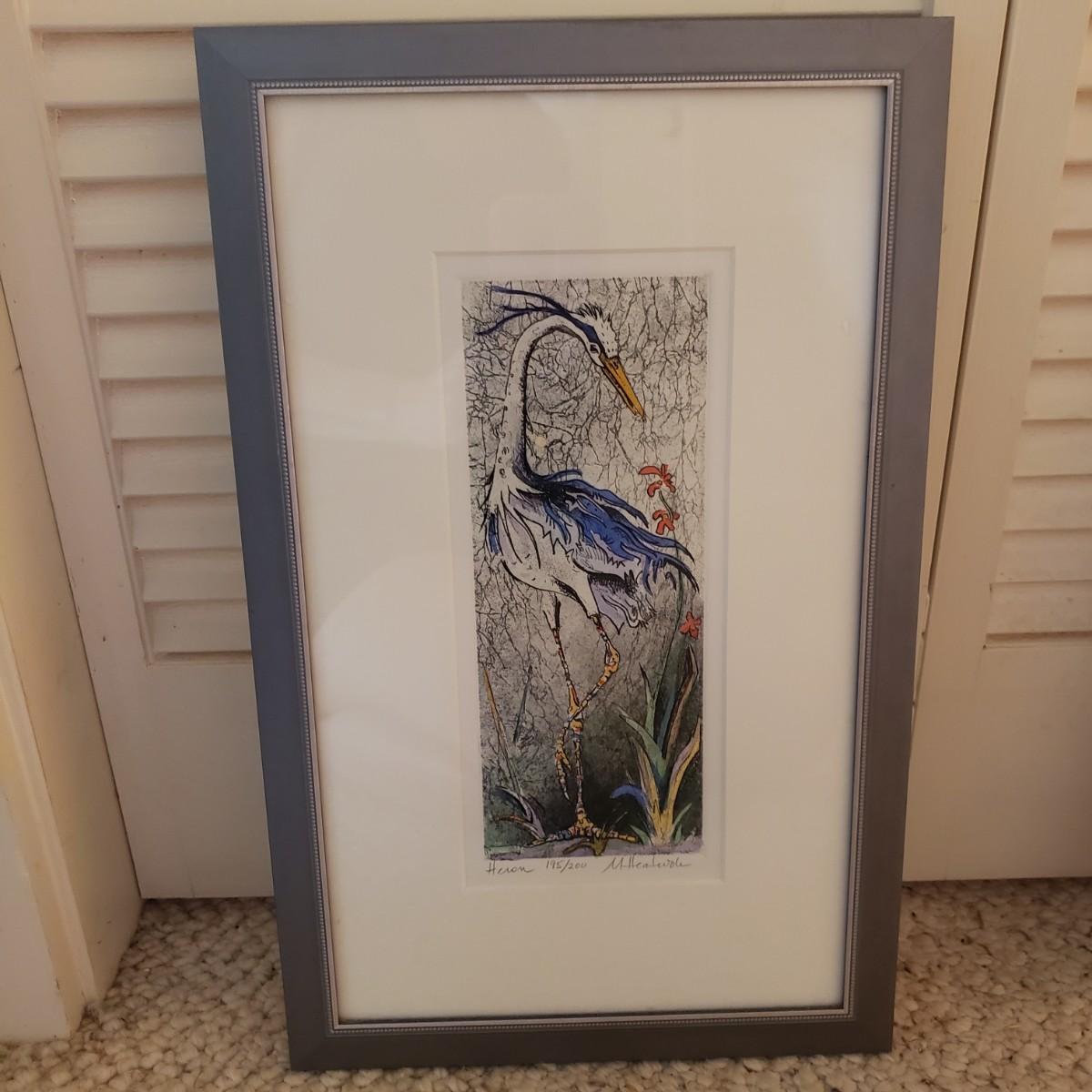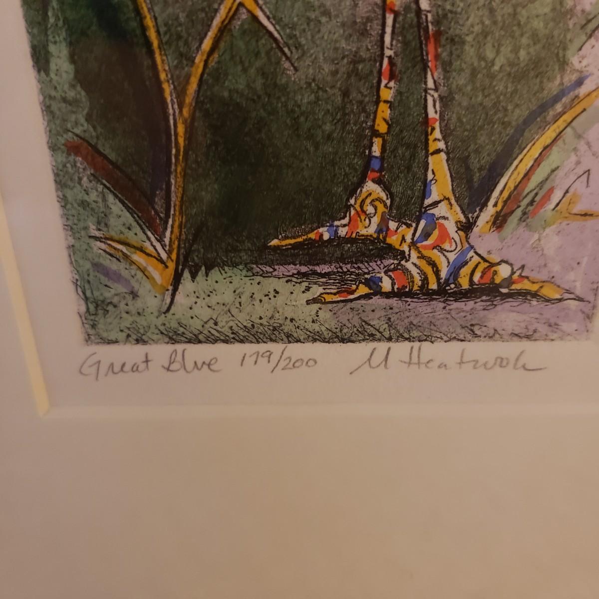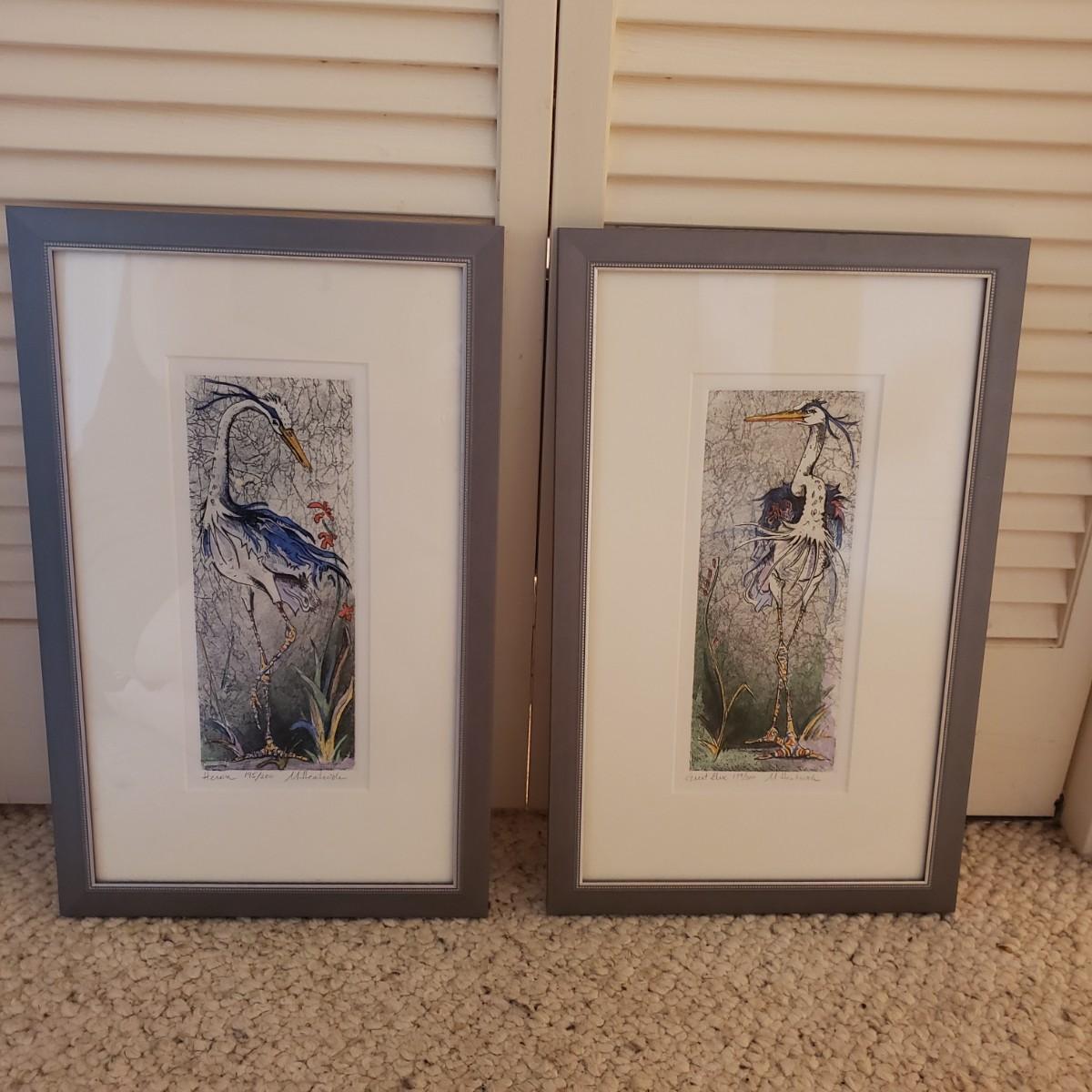 These two original etchings "Heron" #195/200 and " Great Blue" #179/200 are made by Marsha Heatwole. See Statement of Authenticity for details. Under glass and in two matching metal, matted frames measure 11" x 17.5"H.