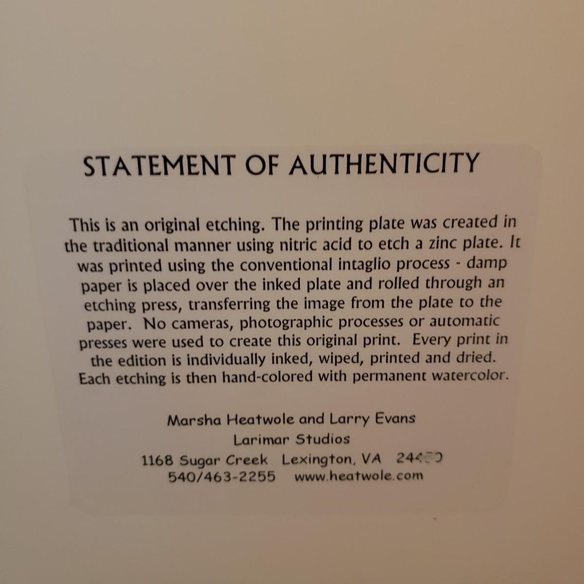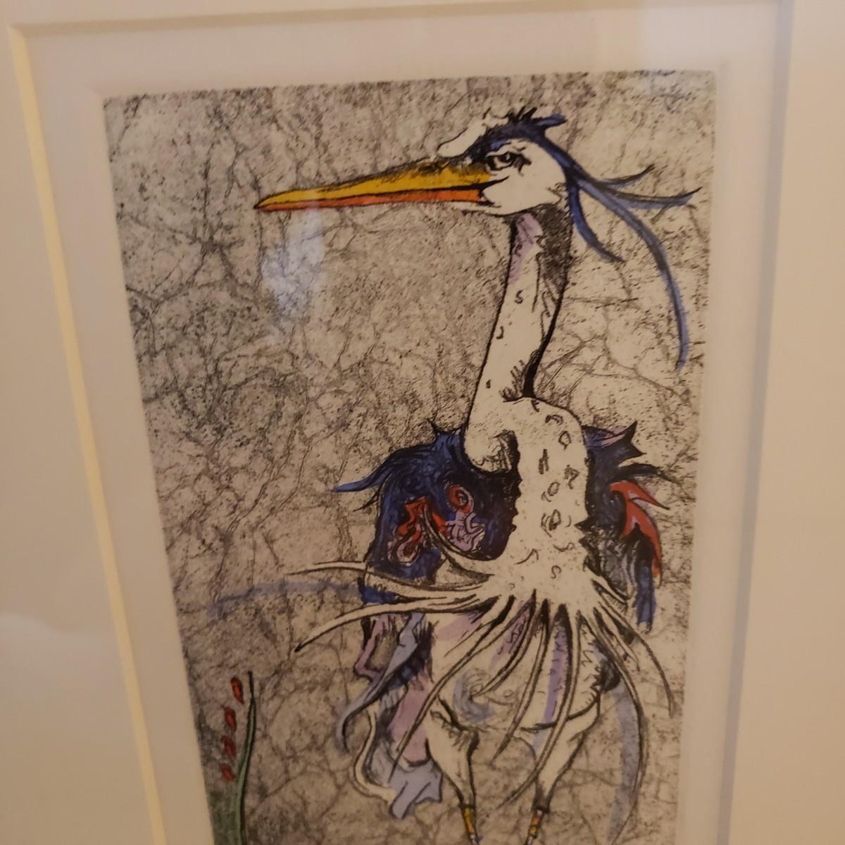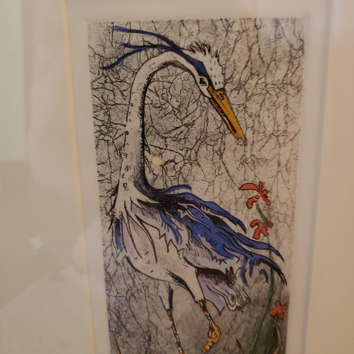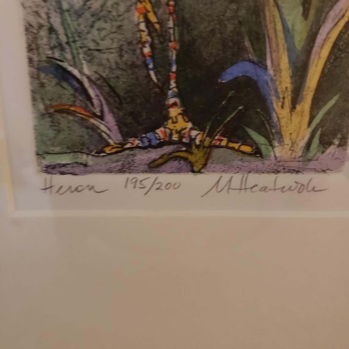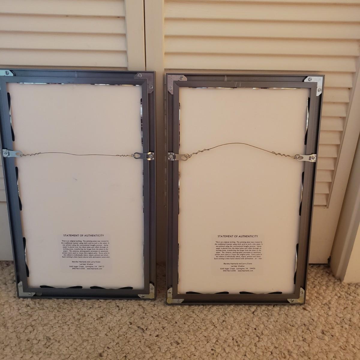 These two original etchings "Heron" #195/200 and " Great Blue" #179/200 are made by Marsha Heatwole. See Statement of Authenticity for details. Under glass and in two matching metal, matted frames measure 11" x 17.5"H.