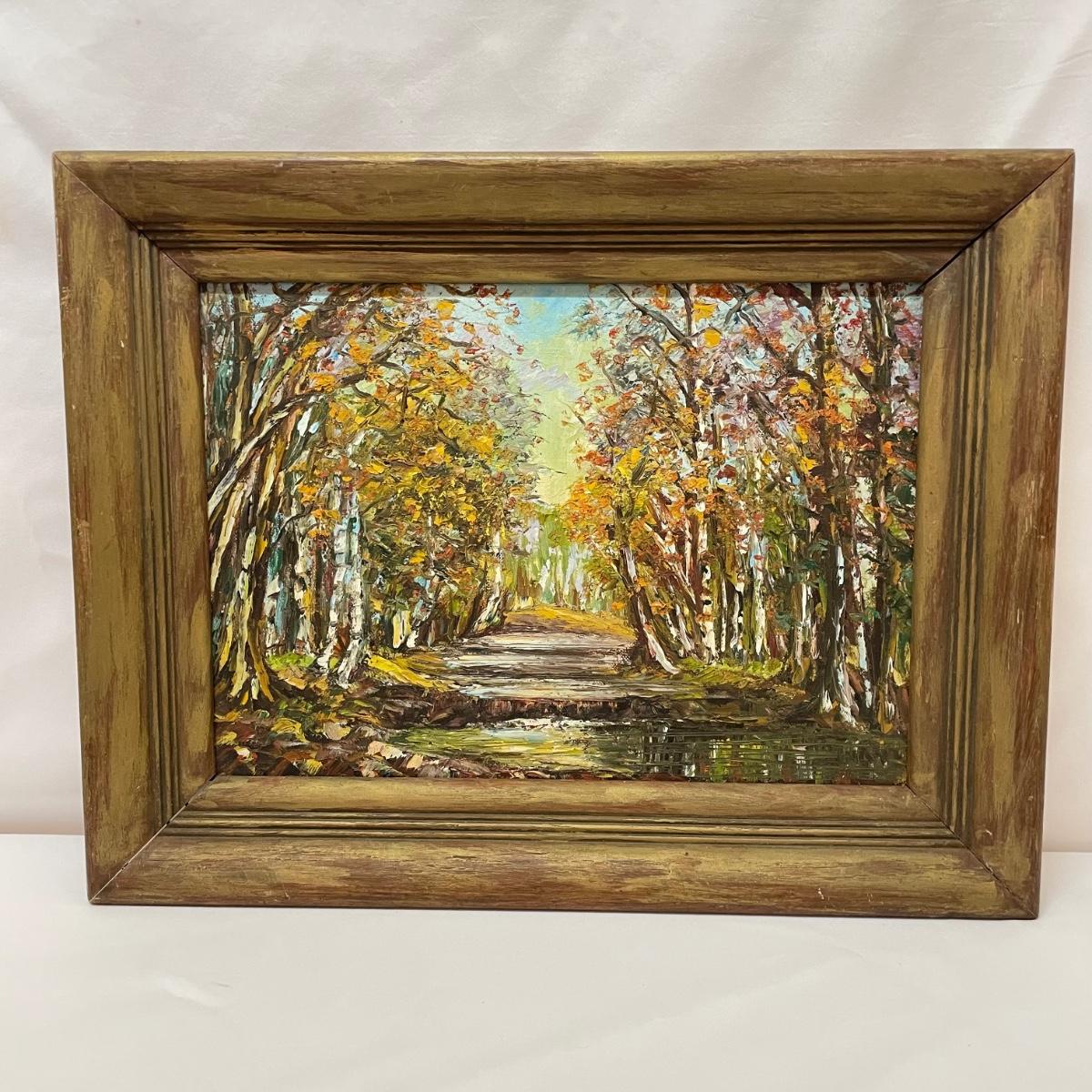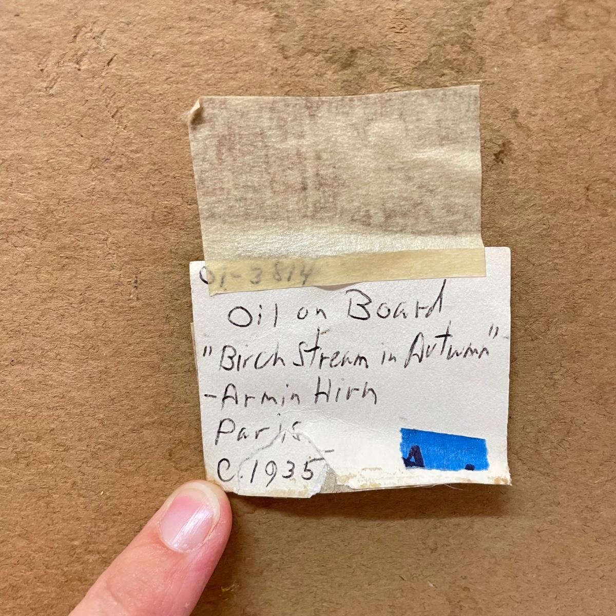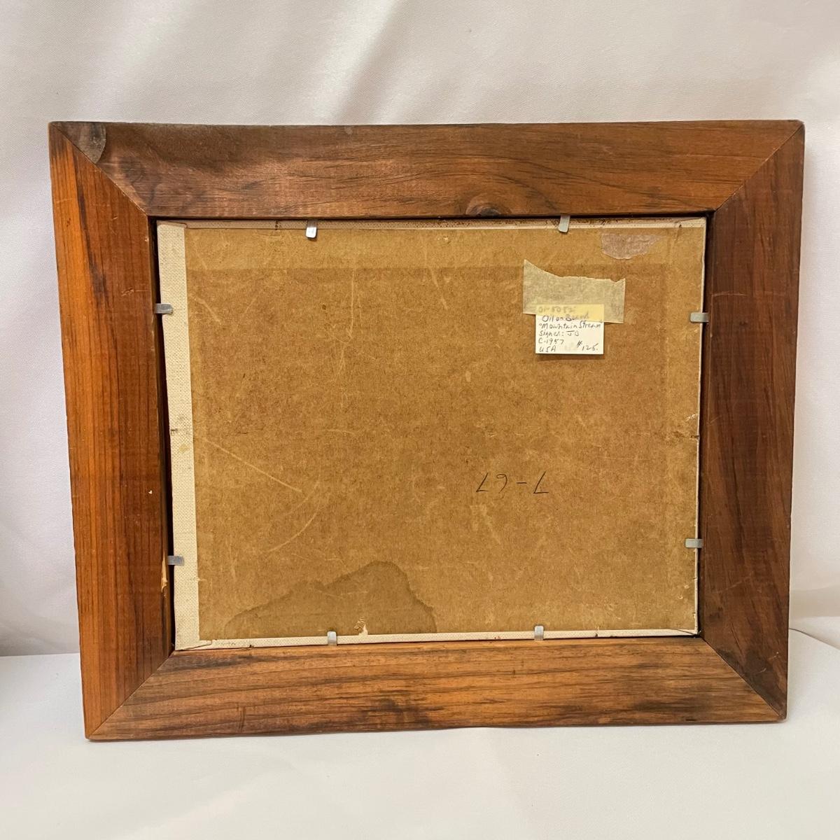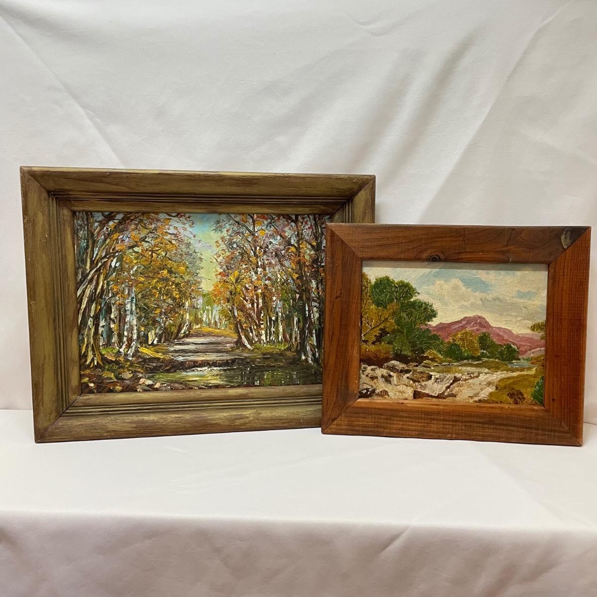 Two framed pieces of art with labels stating “Oil on Board”. The smaller river scene appears to have a signature obscured by the wooden frame. Its label says it’s called “Mountain Stream” and “signed JD”. Frame measures 13.5” x 11.25”H. The larger art’s label states “Birch Stream in Autumn - Armin Hirn”. This art shows more texture and has a wood frame (18” x 14”H) with distressed golden accents. Shipping available. Shipping can be costly. We suggest contacting our preferred local shipping provider, Postage Express, with dimensions and getting an estimate before bidding: (828) 255-9250 or email shipping@postageexpressnc.com