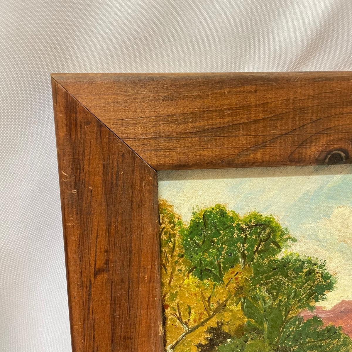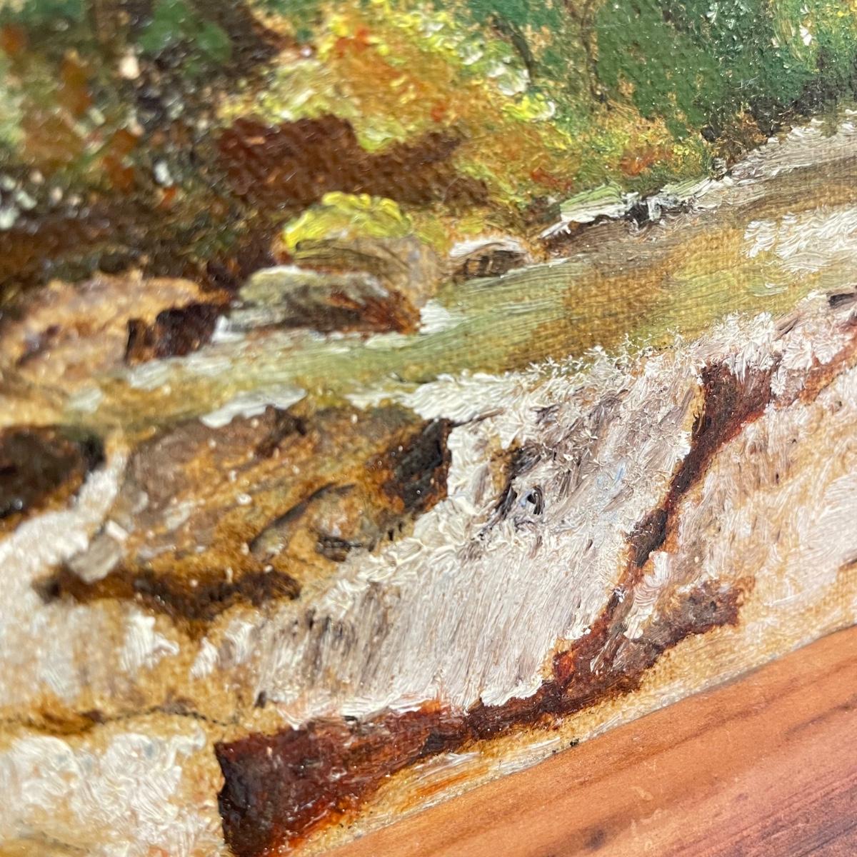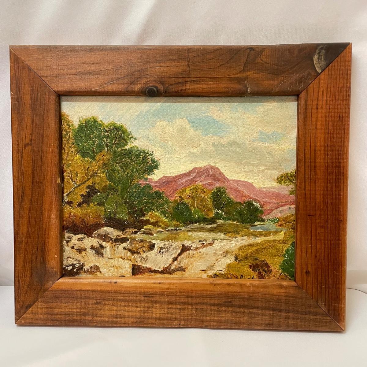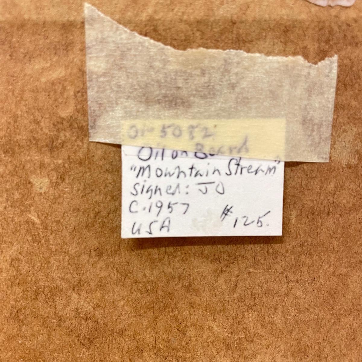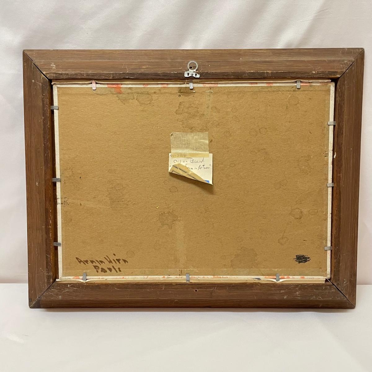 Two framed pieces of art with labels stating “Oil on Board”. The smaller river scene appears to have a signature obscured by the wooden frame. Its label says it’s called “Mountain Stream” and “signed JD”. Frame measures 13.5” x 11.25”H. The larger art’s label states “Birch Stream in Autumn - Armin Hirn”. This art shows more texture and has a wood frame (18” x 14”H) with distressed golden accents. Shipping available. Shipping can be costly. We suggest contacting our preferred local shipping provider, Postage Express, with dimensions and getting an estimate before bidding: (828) 255-9250 or email shipping@postageexpressnc.com