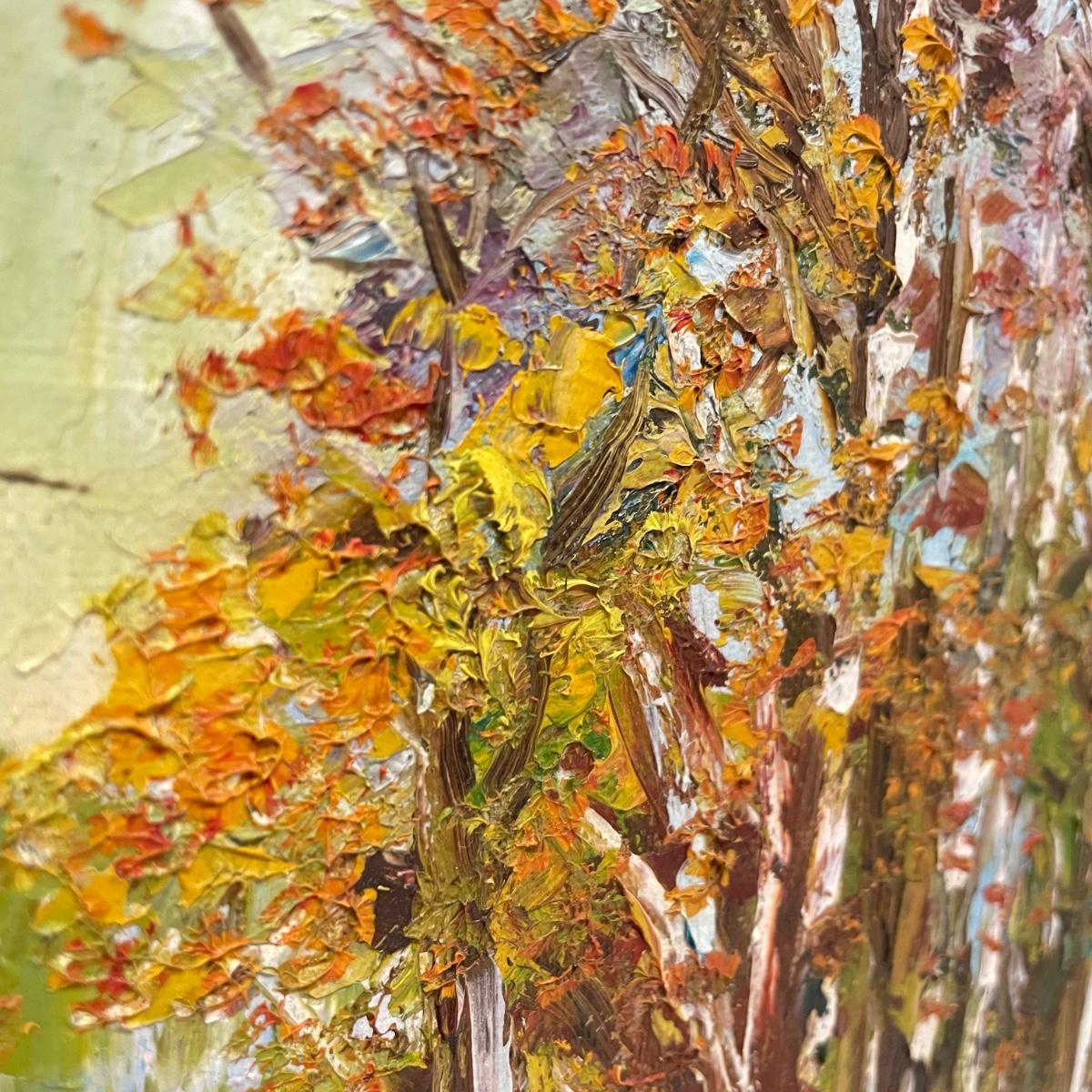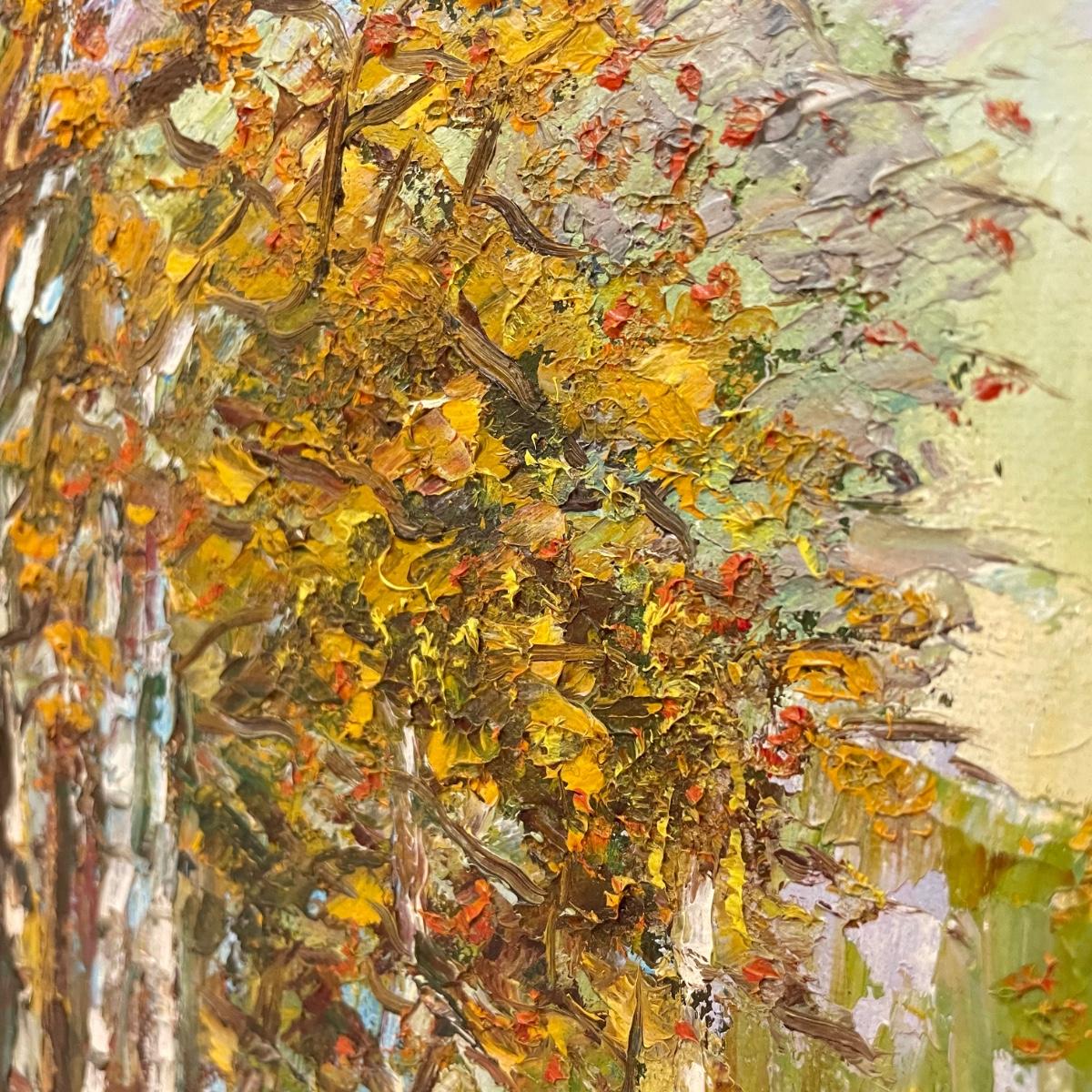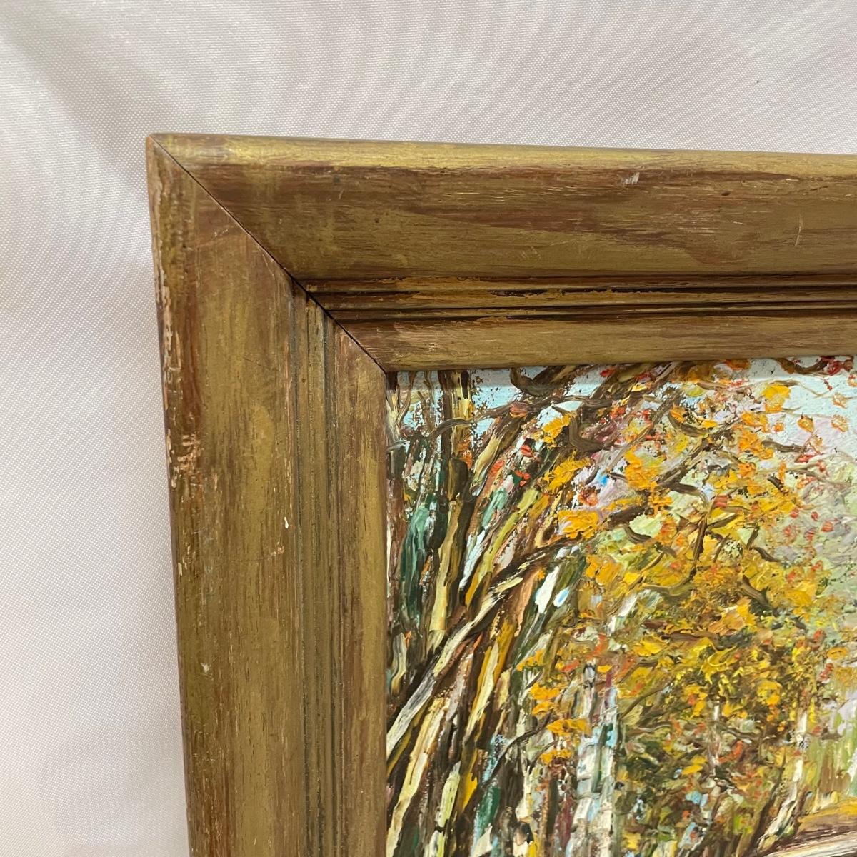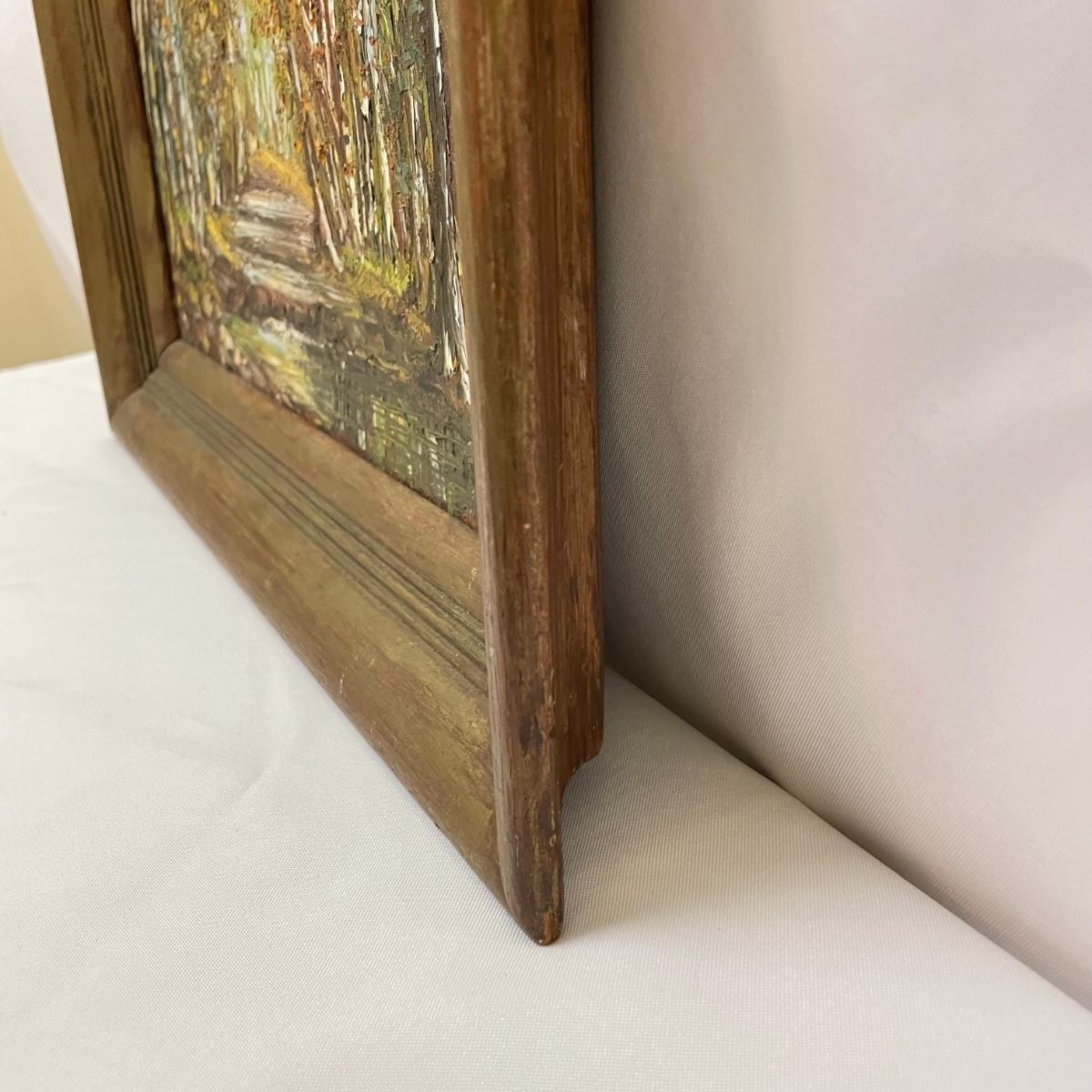 Two framed pieces of art with labels stating “Oil on Board”. The smaller river scene appears to have a signature obscured by the wooden frame. Its label says it’s called “Mountain Stream” and “signed JD”. Frame measures 13.5” x 11.25”H. The larger art’s label states “Birch Stream in Autumn - Armin Hirn”. This art shows more texture and has a wood frame (18” x 14”H) with distressed golden accents. Shipping available. Shipping can be costly. We suggest contacting our preferred local shipping provider, Postage Express, with dimensions and getting an estimate before bidding: (828) 255-9250 or email shipping@postageexpressnc.com