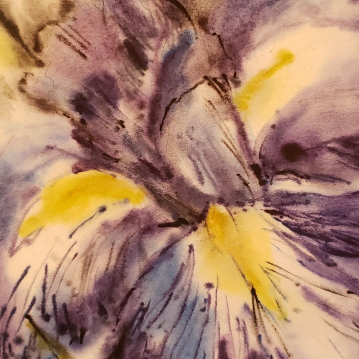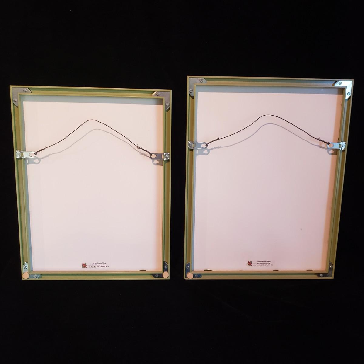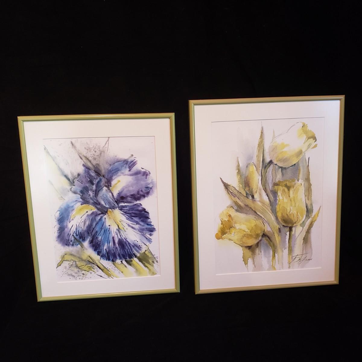 This two piece original watercolor lot depics purple irises and yellow tulips. The artist has signed each painting, yet the name is hard to decifer. The green metal frame was professionally done. The yellow tulip frame measures 12" x 16"H.