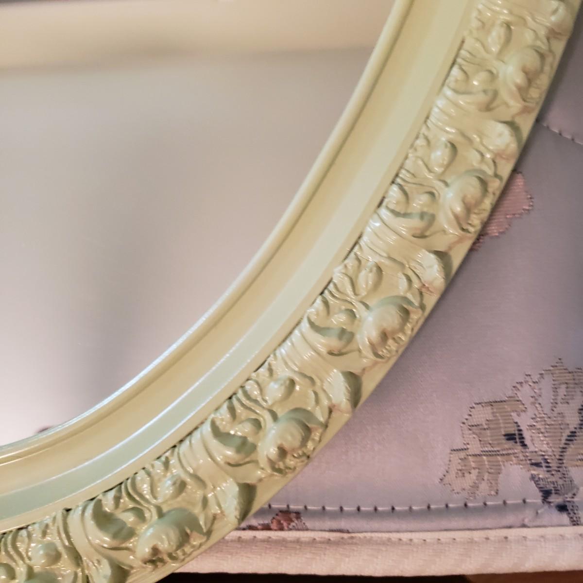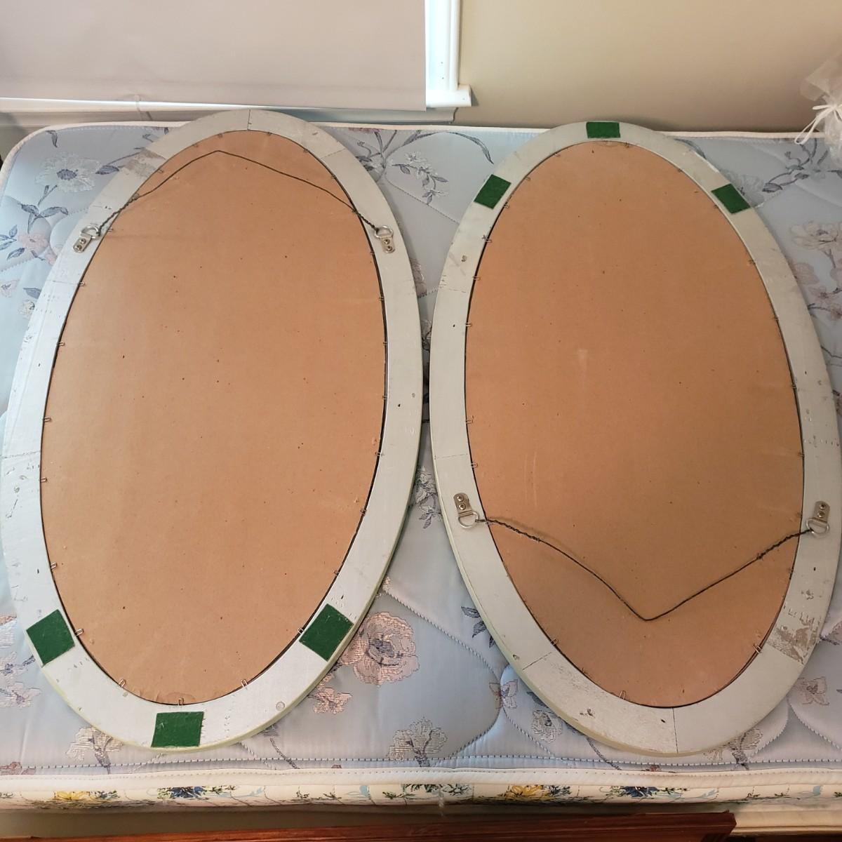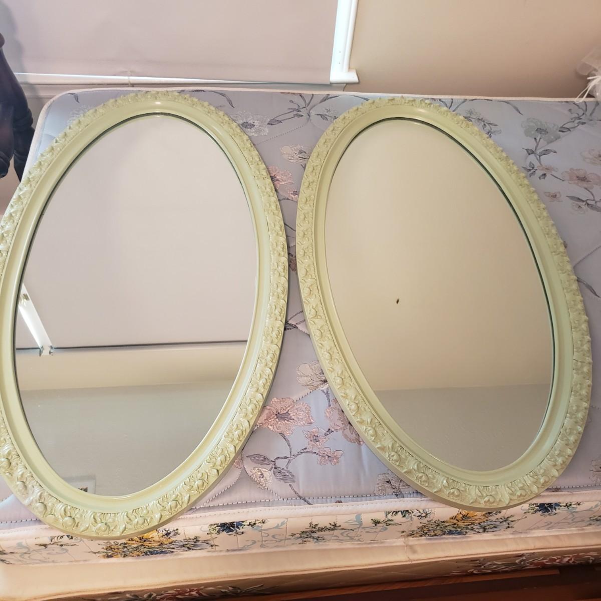 This lot contains two wood framed oval mirrors with a light green floral pattern. The mirrors are heavy. They have a strong wire backing for mounting on a wall. The mirrors measure 19.5" x 36".