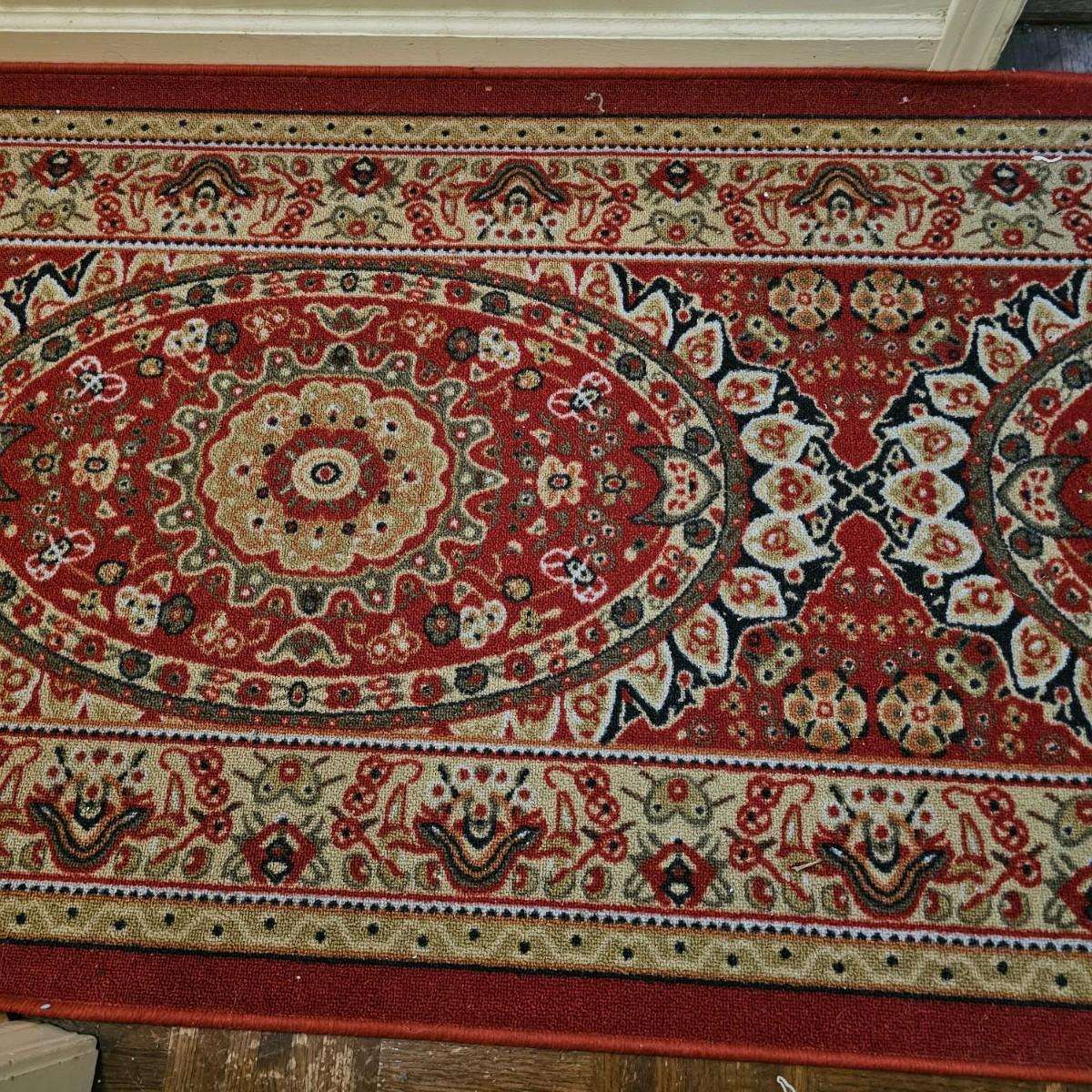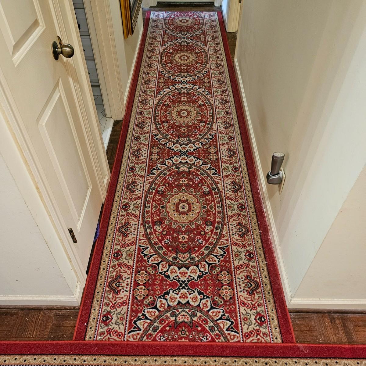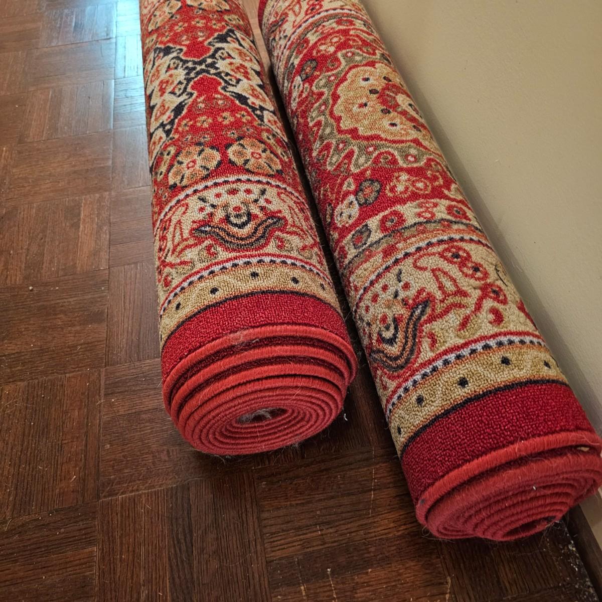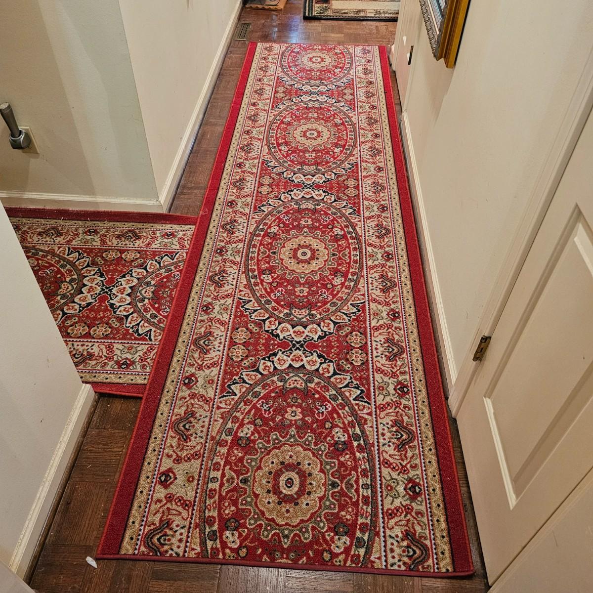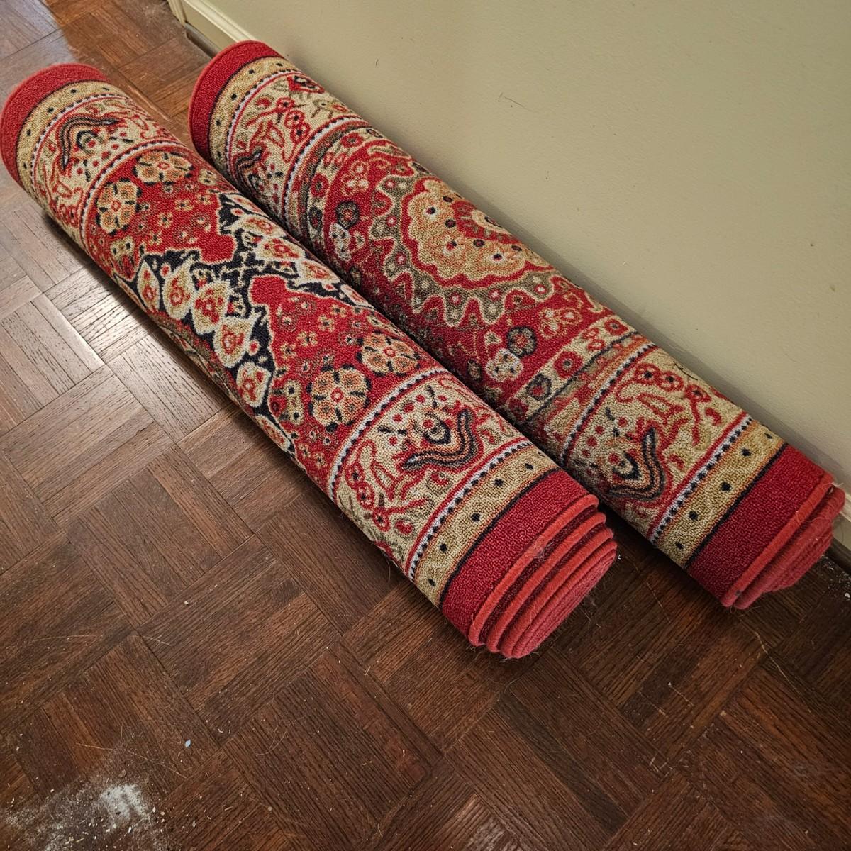 Oval designs in red and tan with border edges, these two runners would look well in an entry or down a hallway. Both pieces are 36" wide. One piece is 11' long and the other is 13'. Some spotted areas on the back of the shorter runner. See photos for details. Local pickup only.