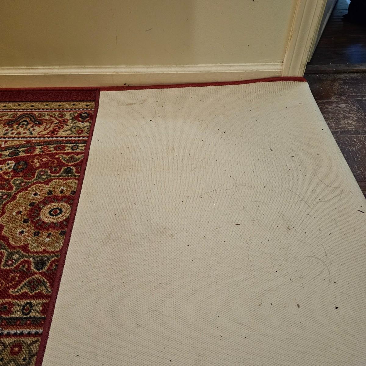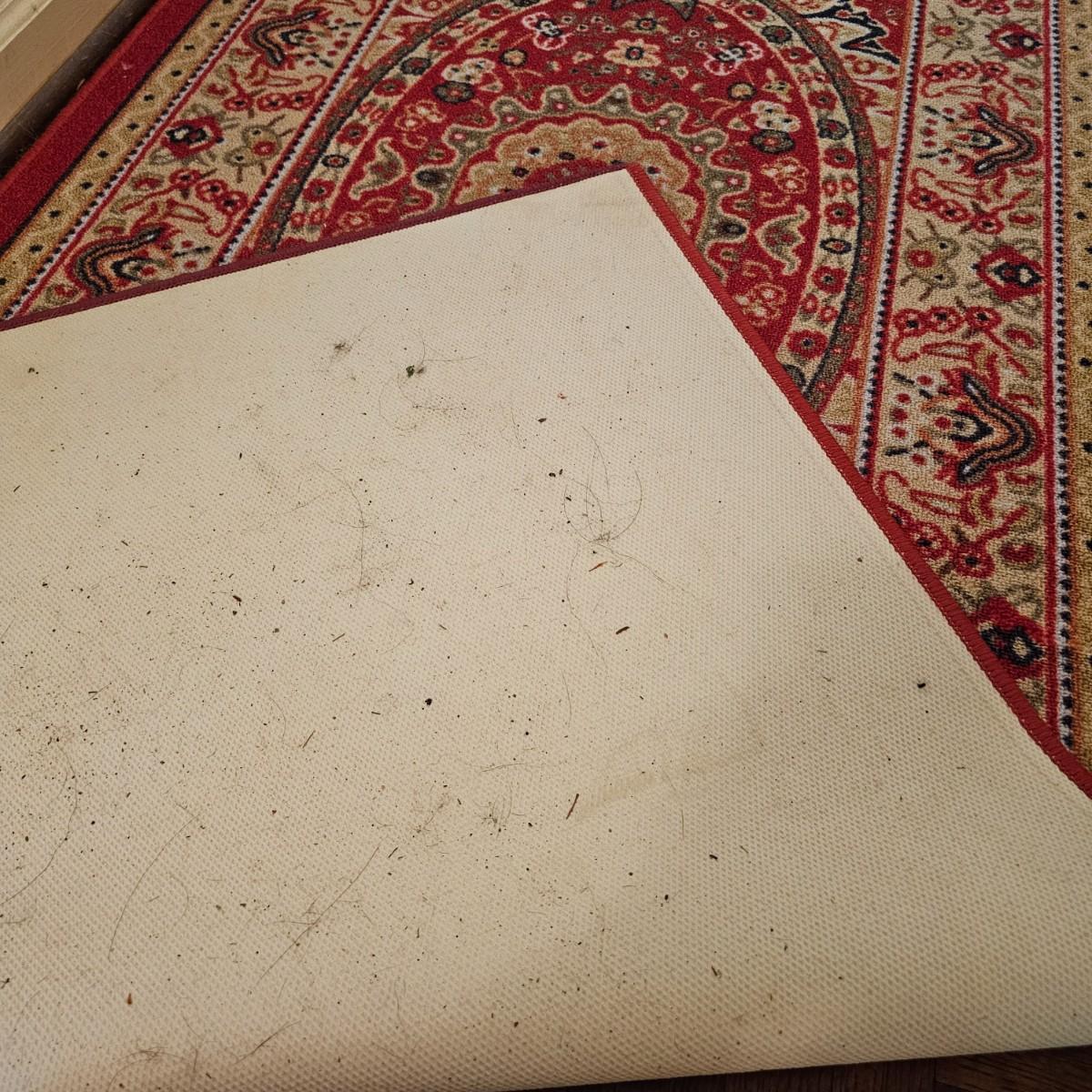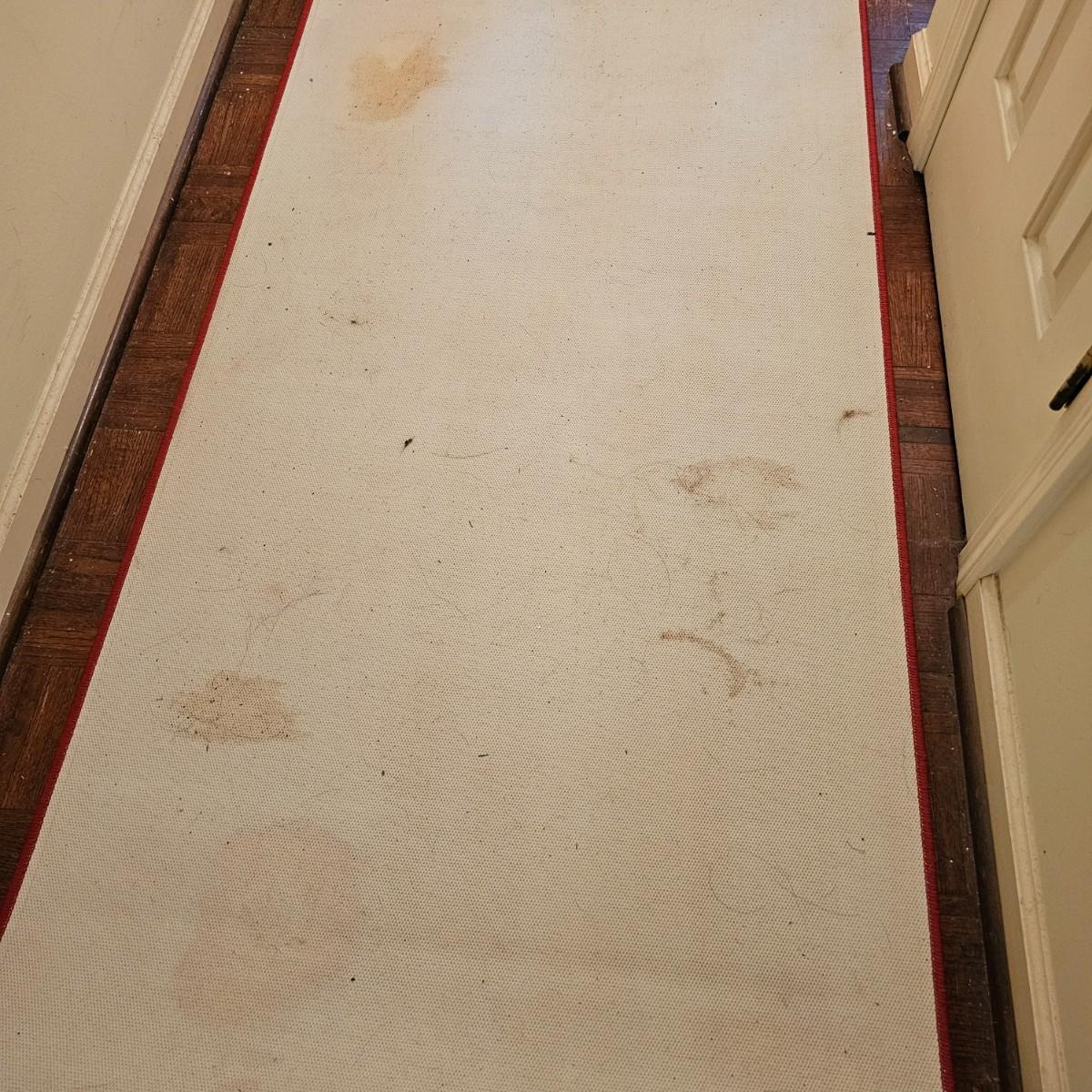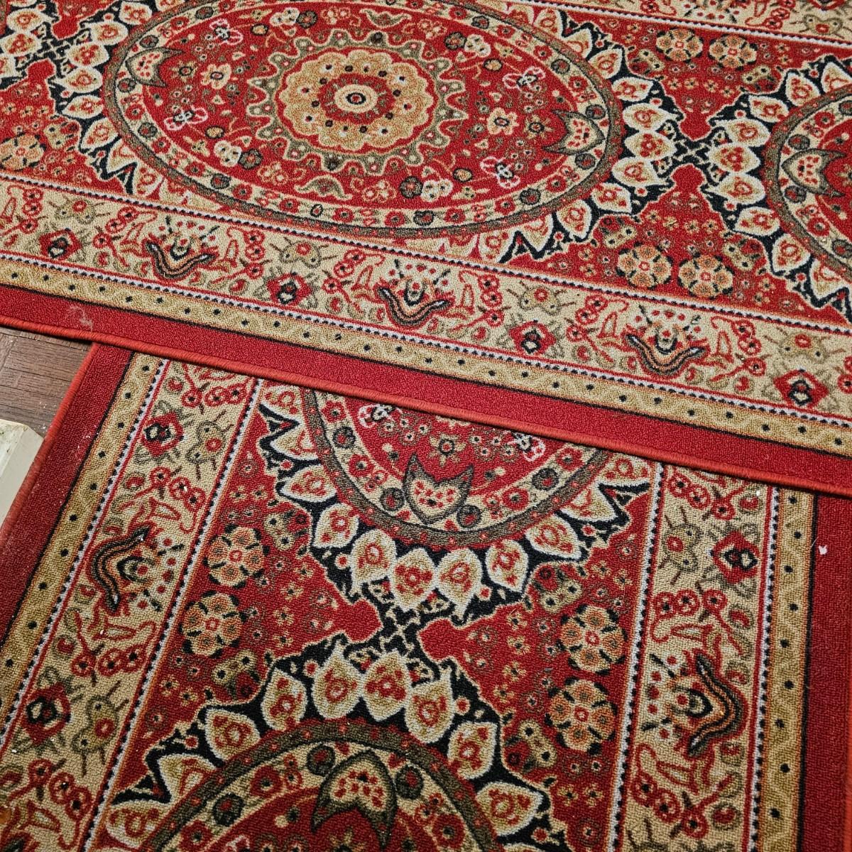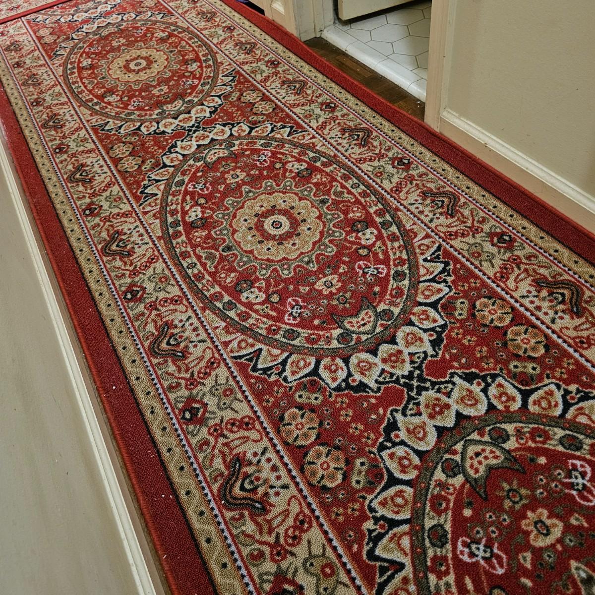 Oval designs in red and tan with border edges, these two runners would look well in an entry or down a hallway. Both pieces are 36" wide. One piece is 11' long and the other is 13'. Some spotted areas on the back of the shorter runner. See photos for details. Local pickup only.
