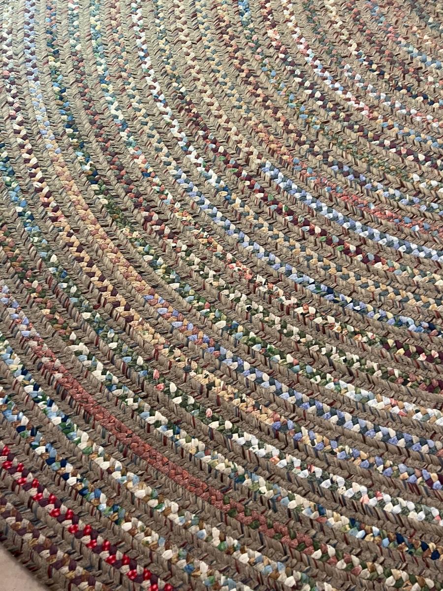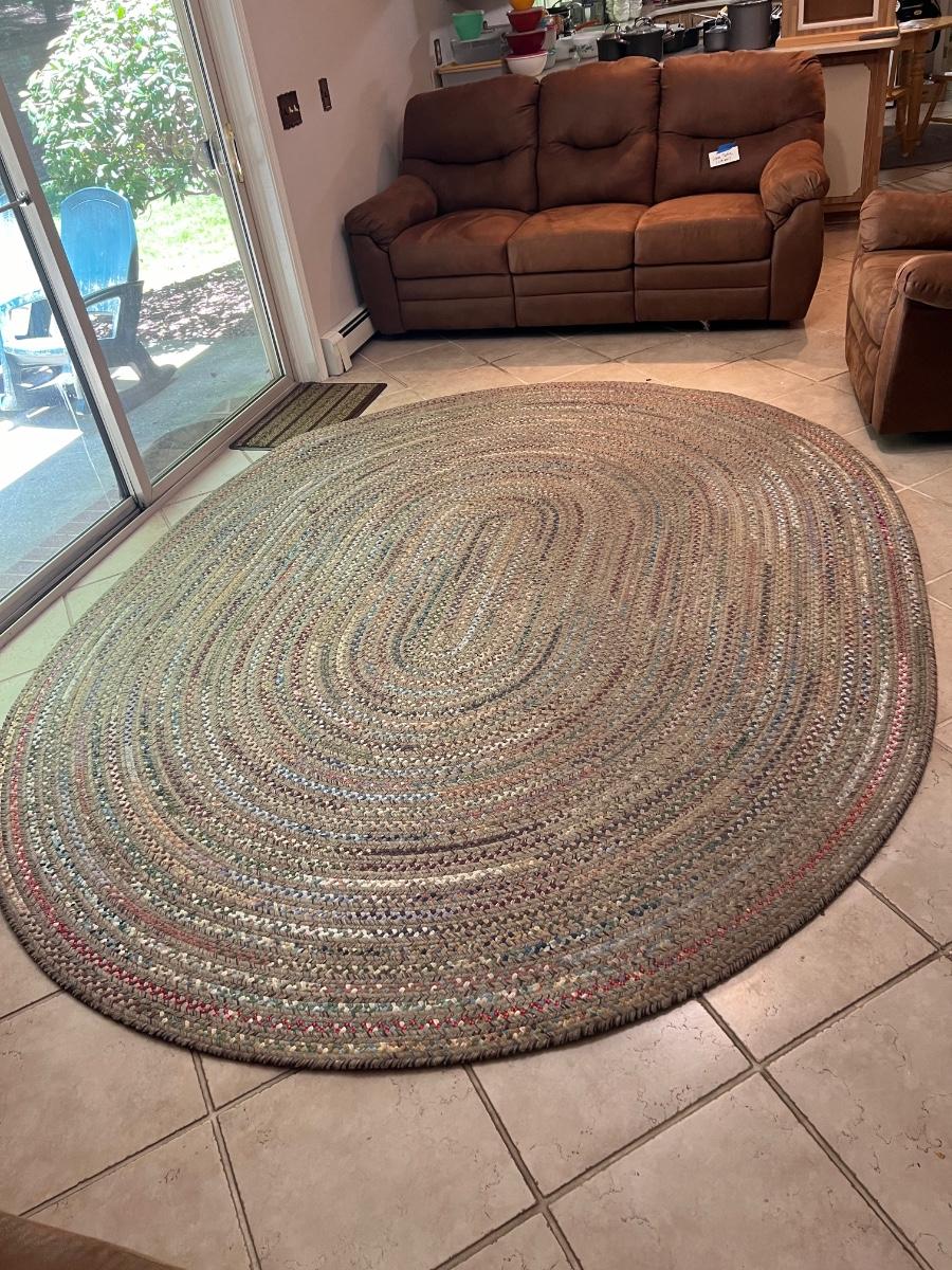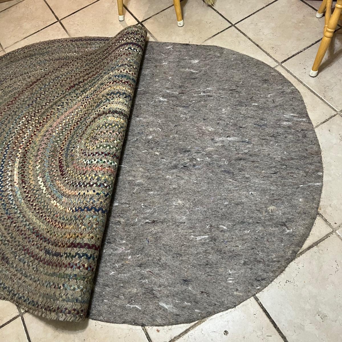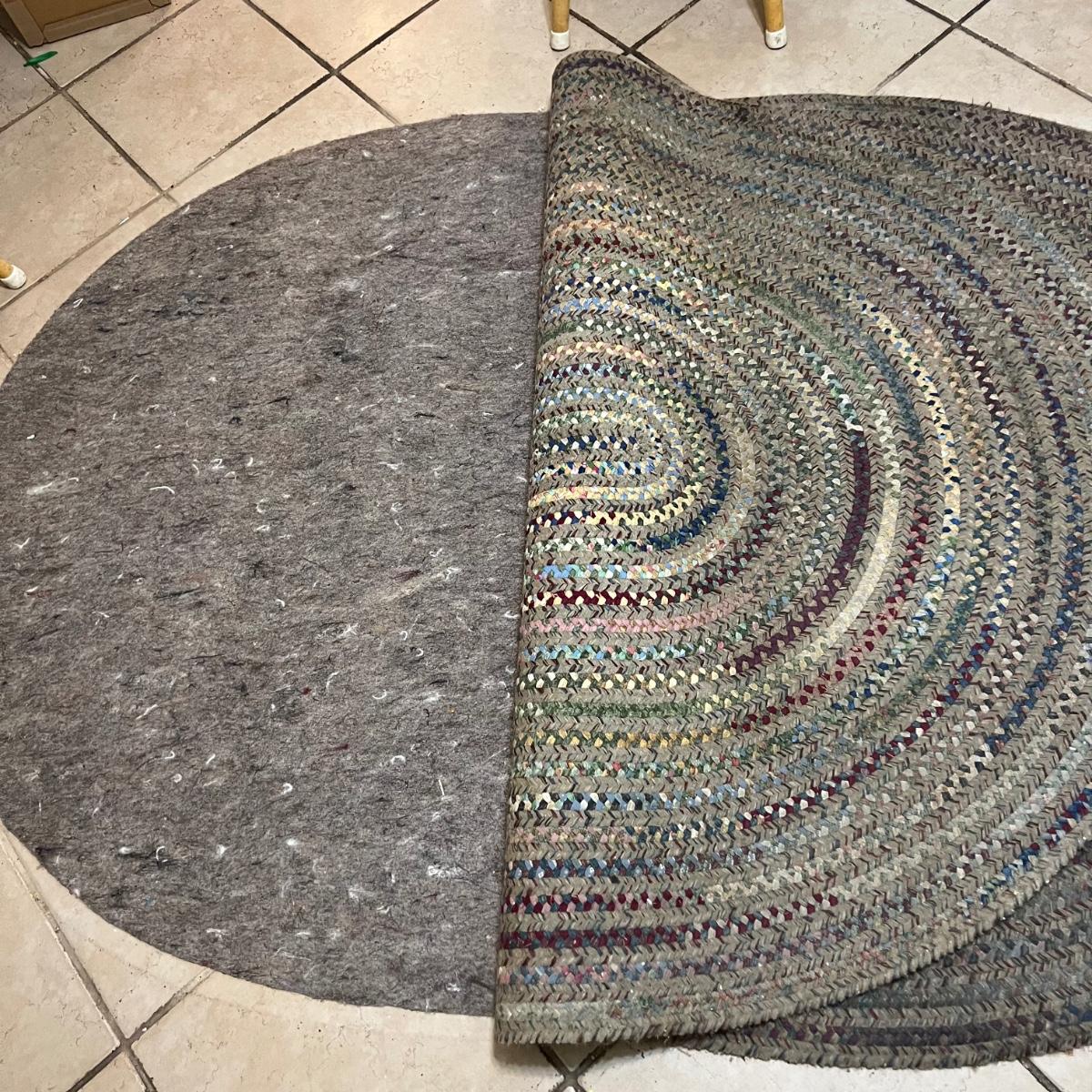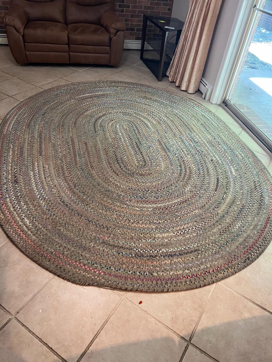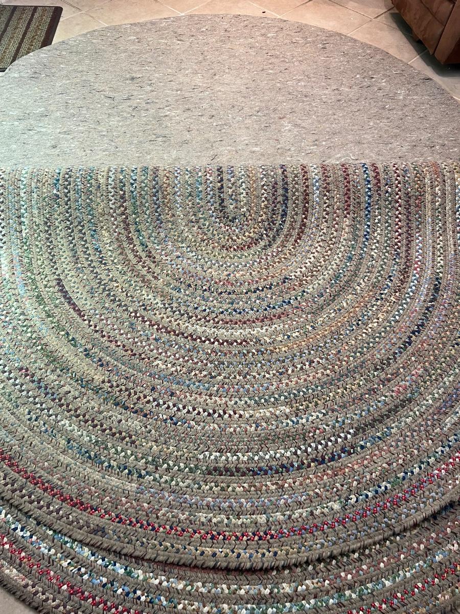 Two braided rag rugs with accompanying wool & rubber backed carpet pads cut to match. The two rugs are the same color/pattern. The larger rug measures 122” x 97” and the smaller rug measures 86” x 60”. Rugs appear to need a good cleaning, see pictures. Local pickup only.