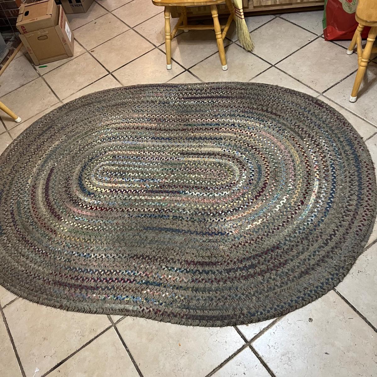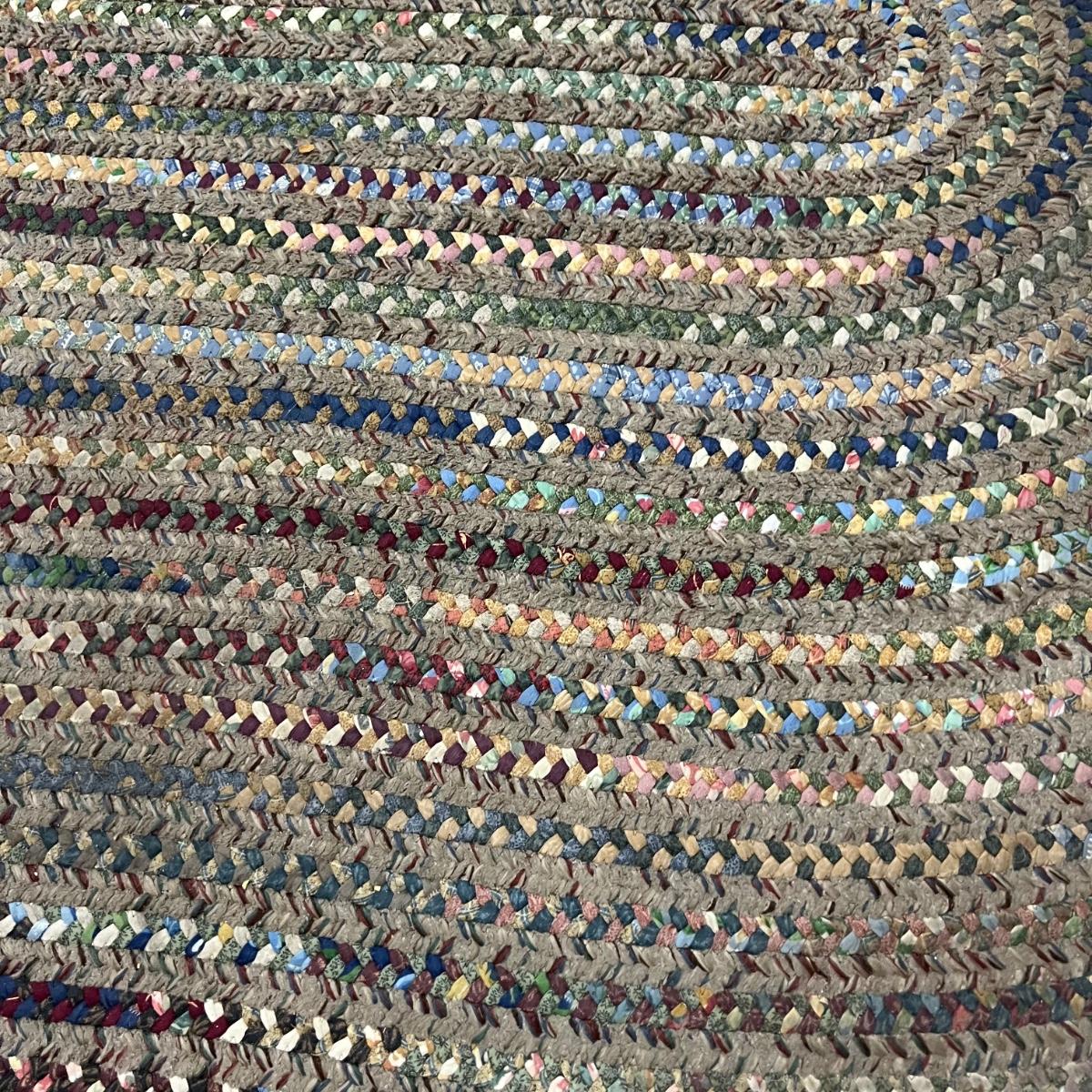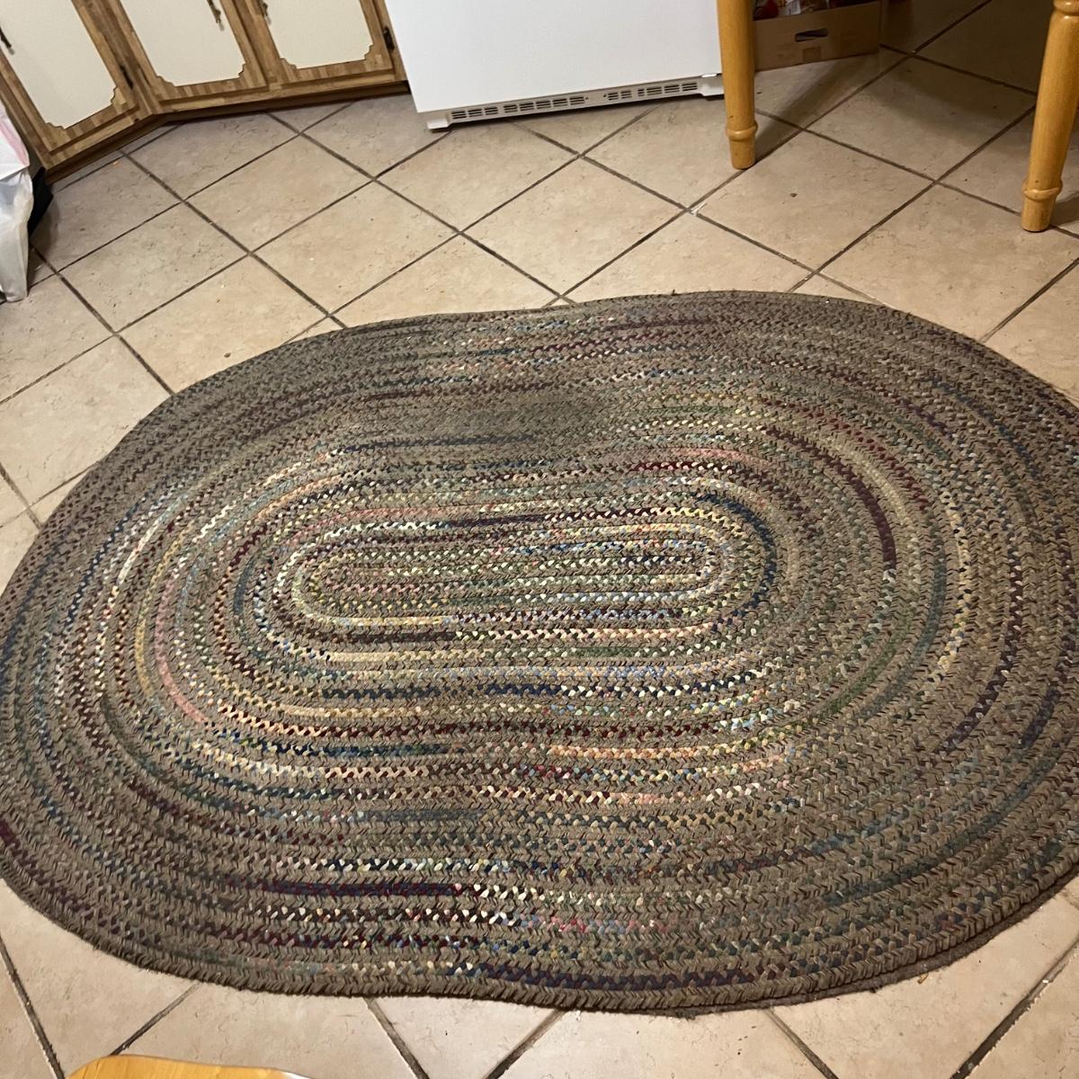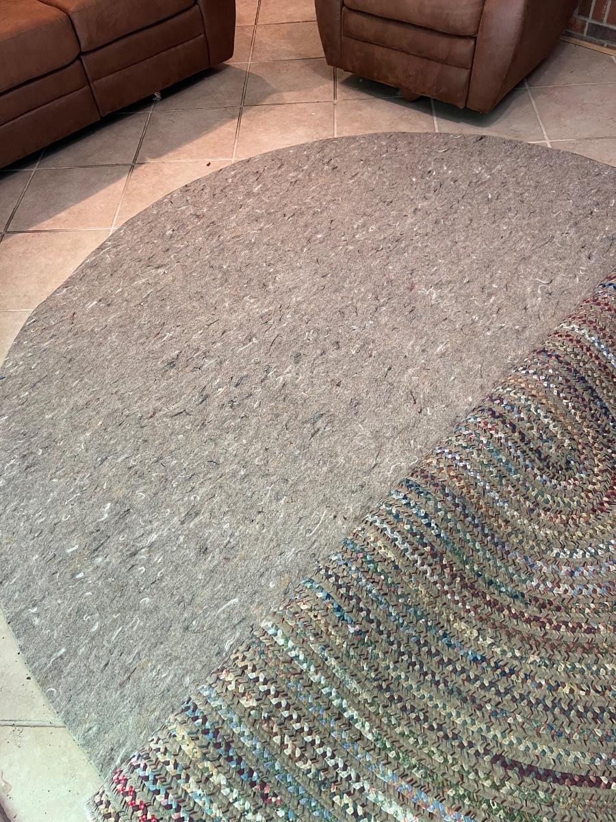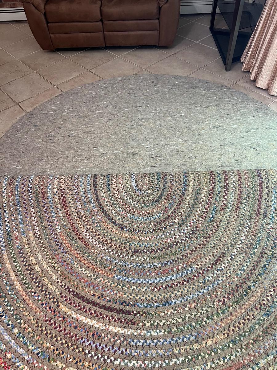 Two braided rag rugs with accompanying wool & rubber backed carpet pads cut to match. The two rugs are the same color/pattern. The larger rug measures 122” x 97” and the smaller rug measures 86” x 60”. Rugs appear to need a good cleaning, see pictures. Local pickup only.