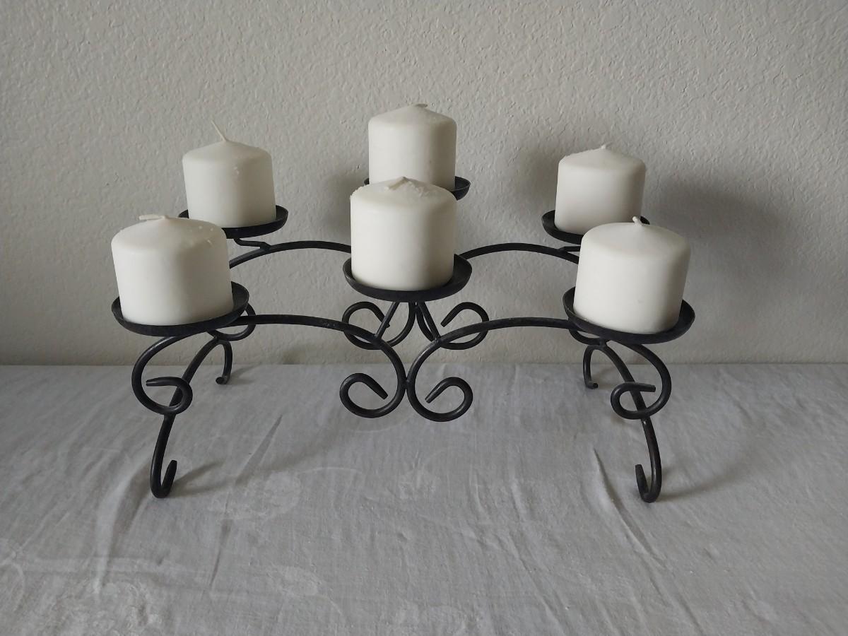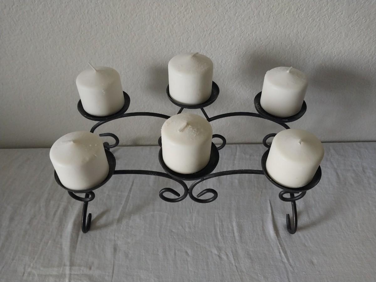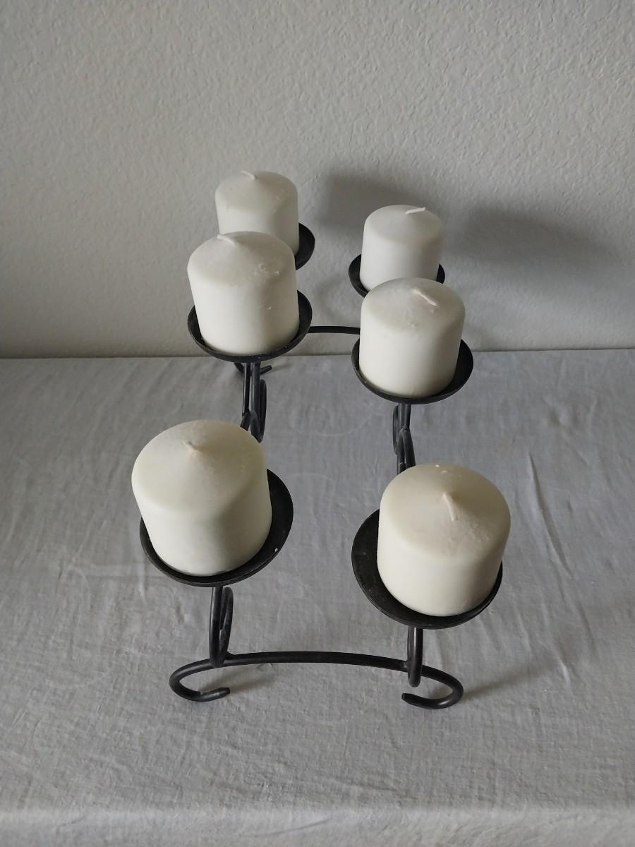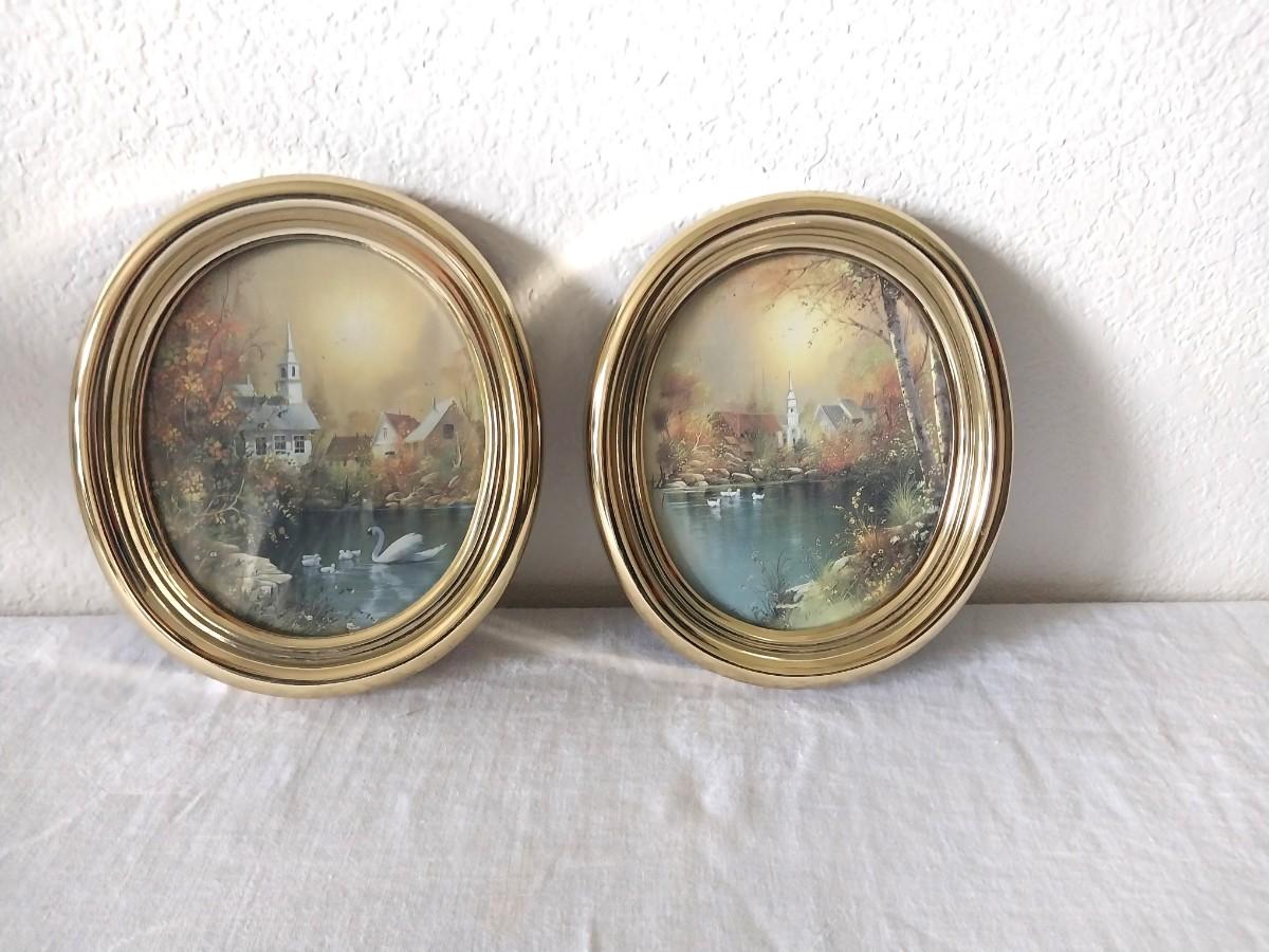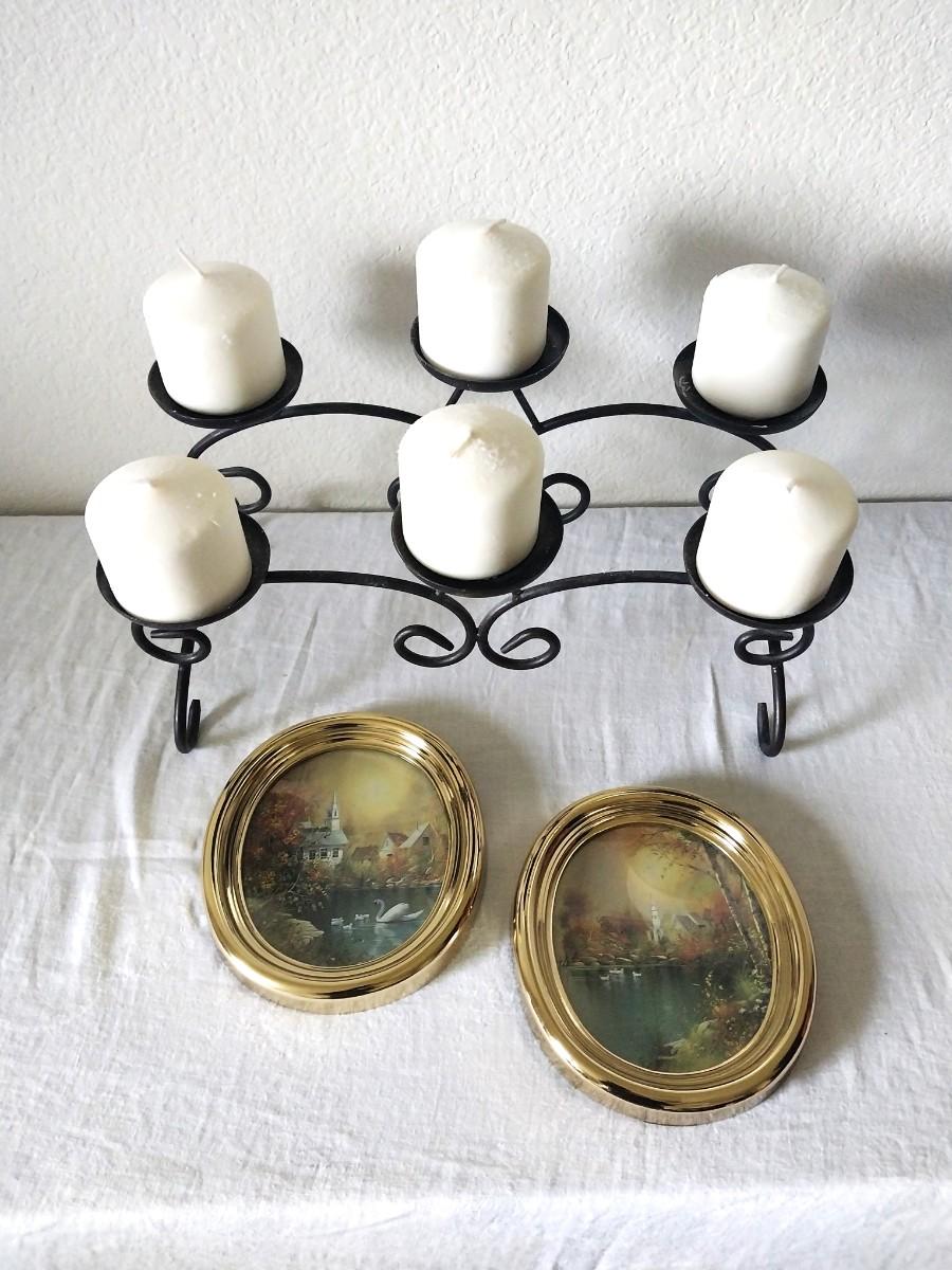 Two Oval Scenery Pictures & Black Candle Holder of Six
