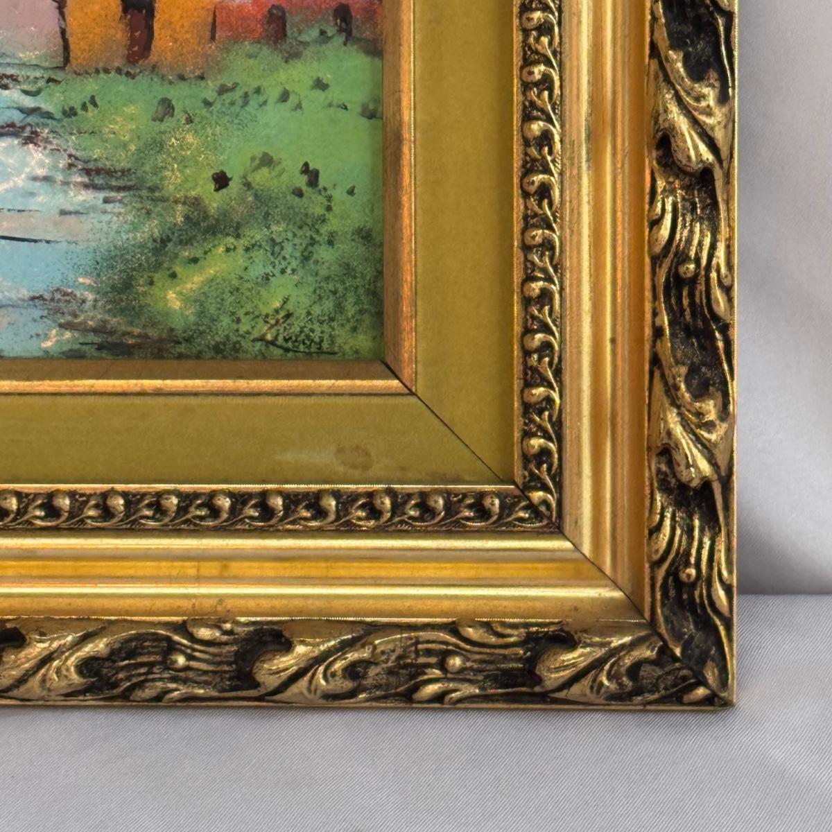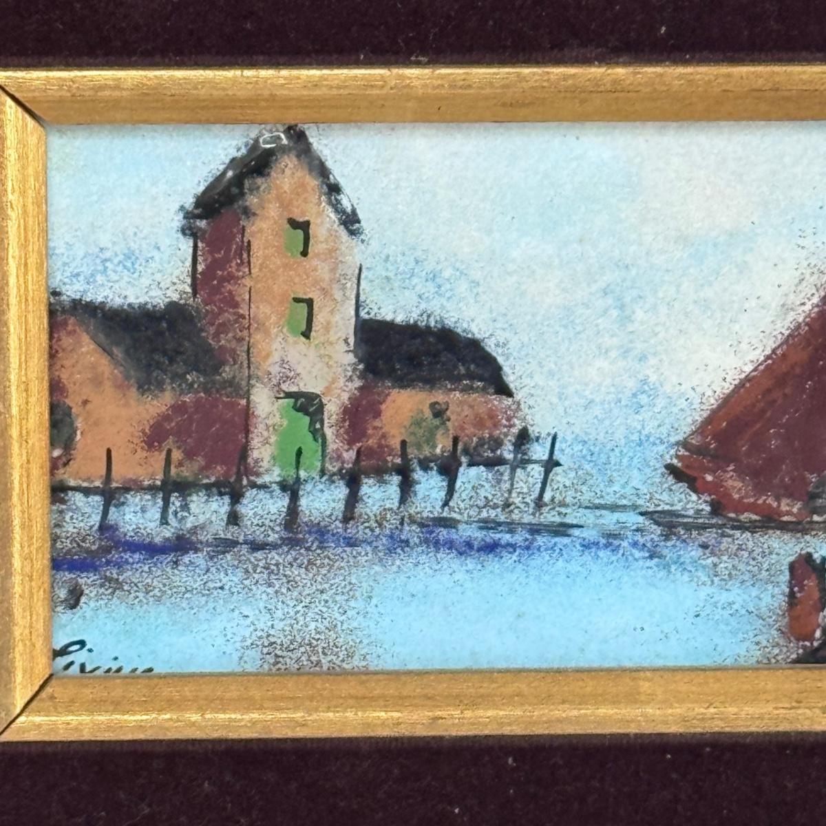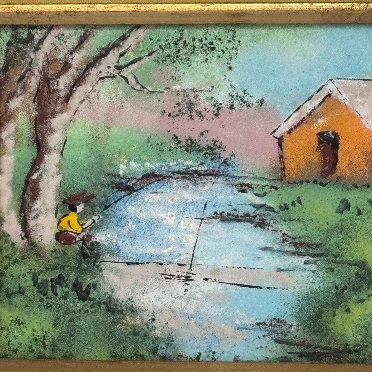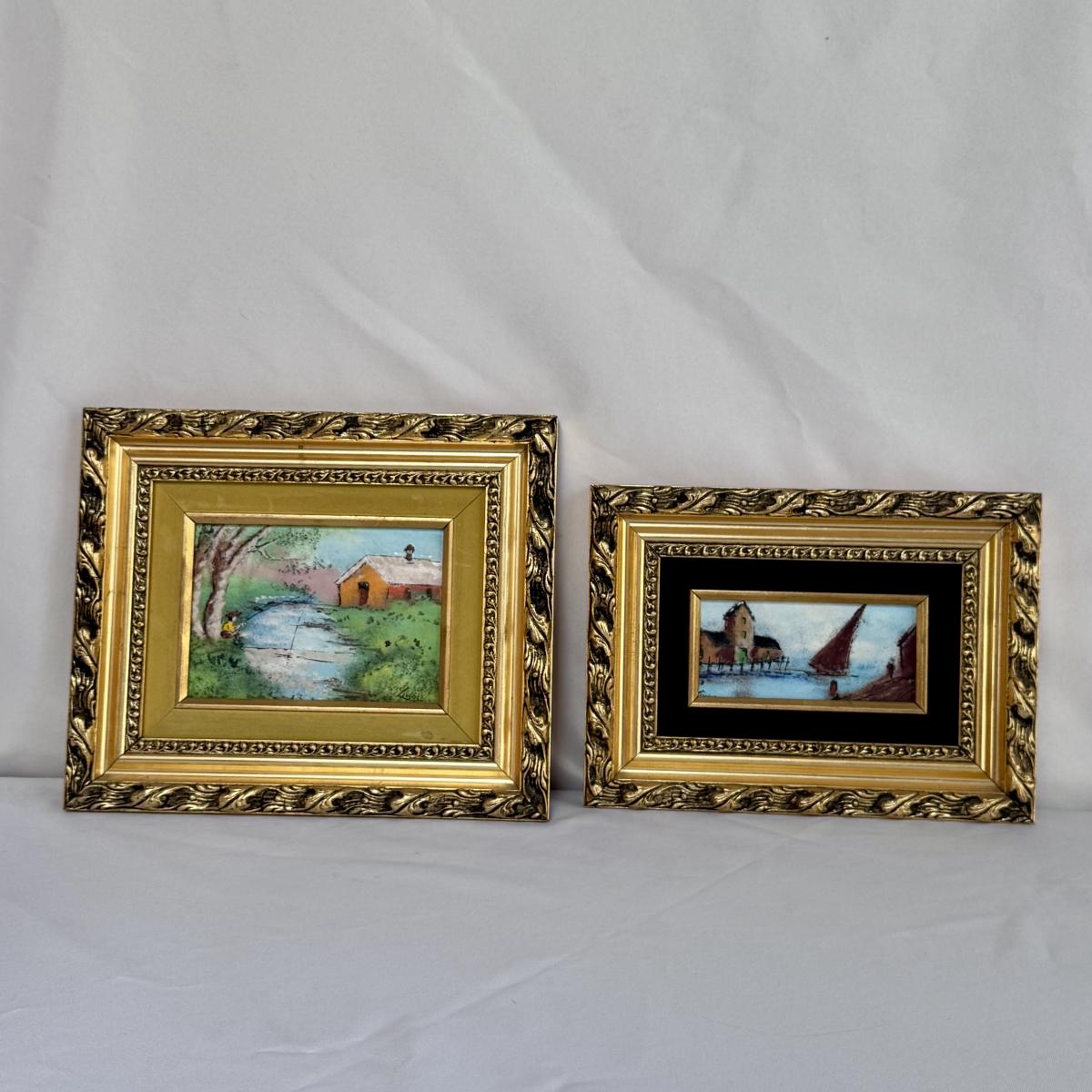This lot includes two sweet paintings depicting water scenes. Both are framed in unique, wooden gold-colored frames with a double matting. They both appear to be signed by the same artist. The larger frame measures 12” x 10”H. Shipping available.