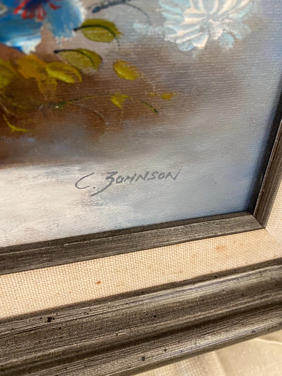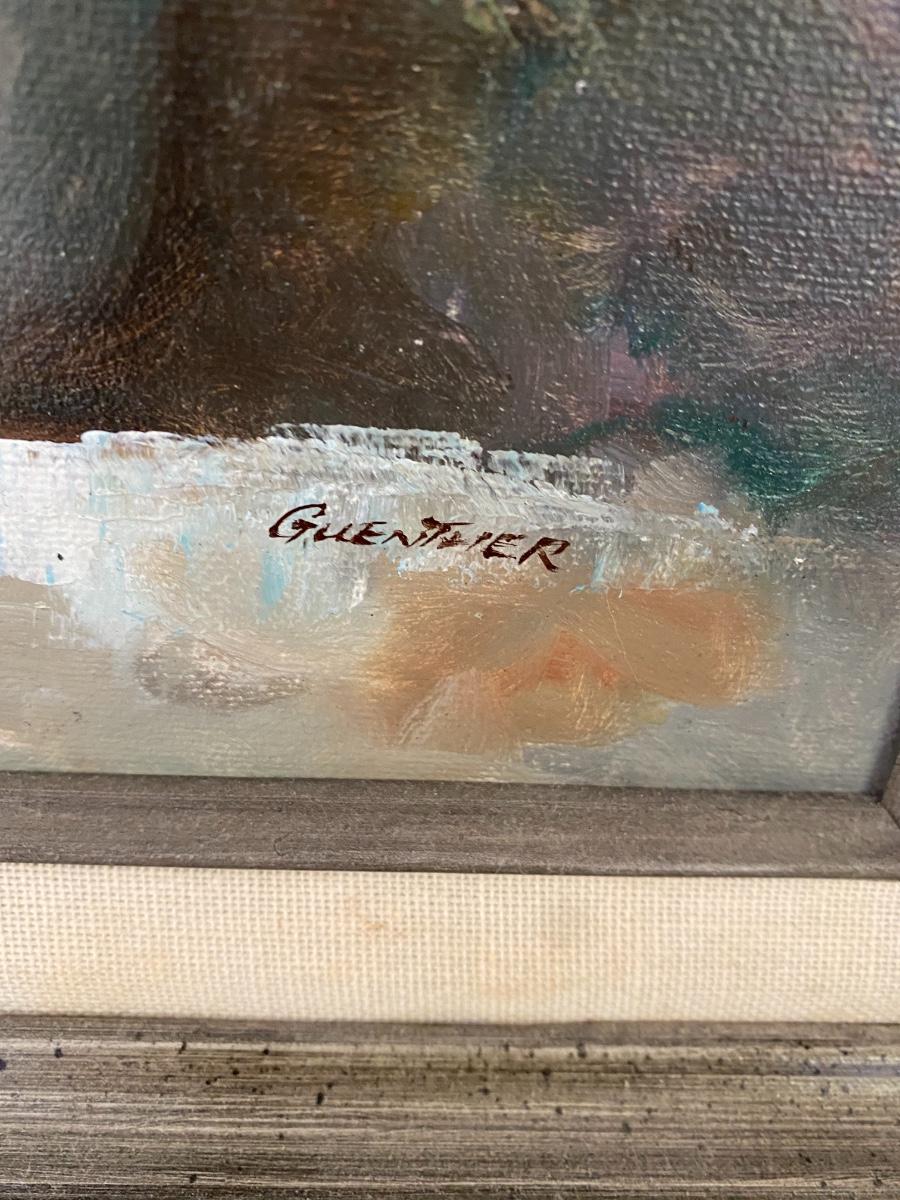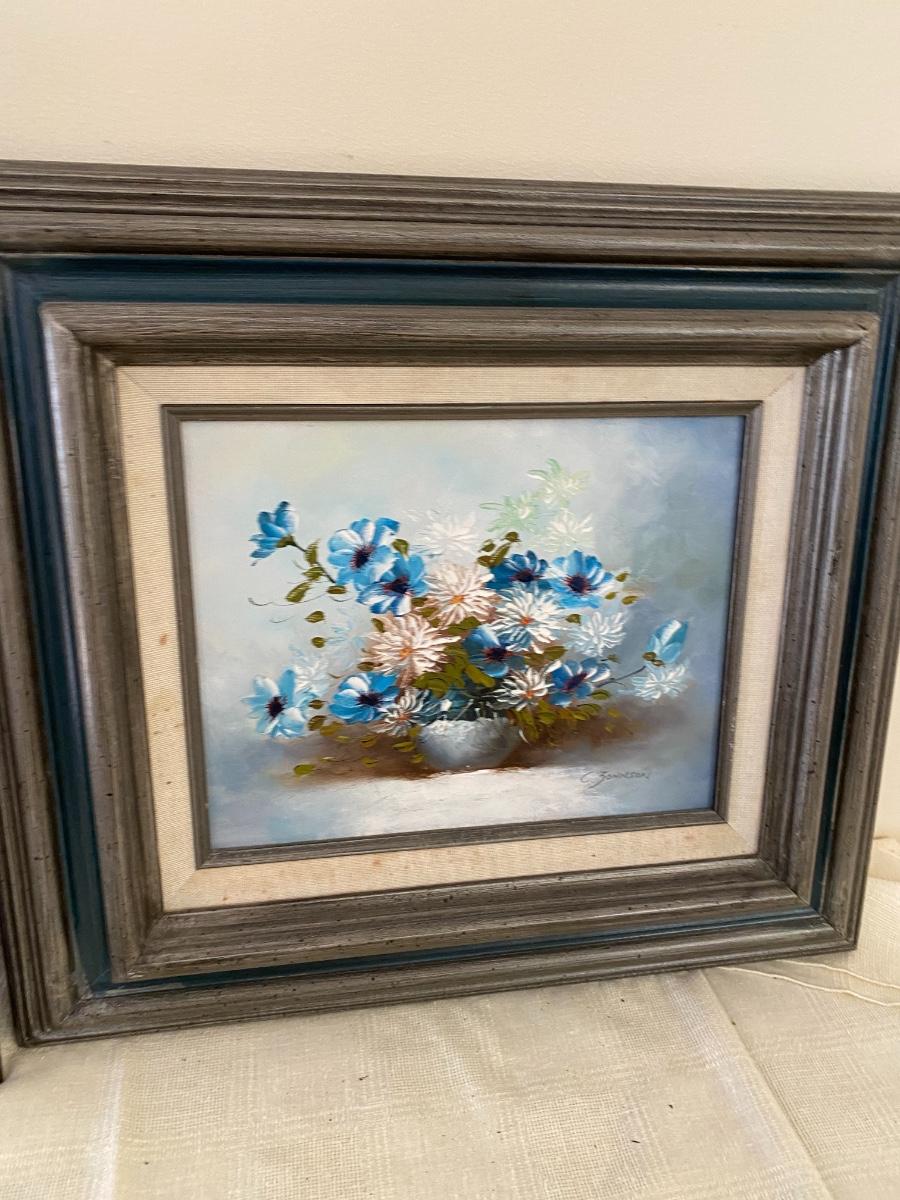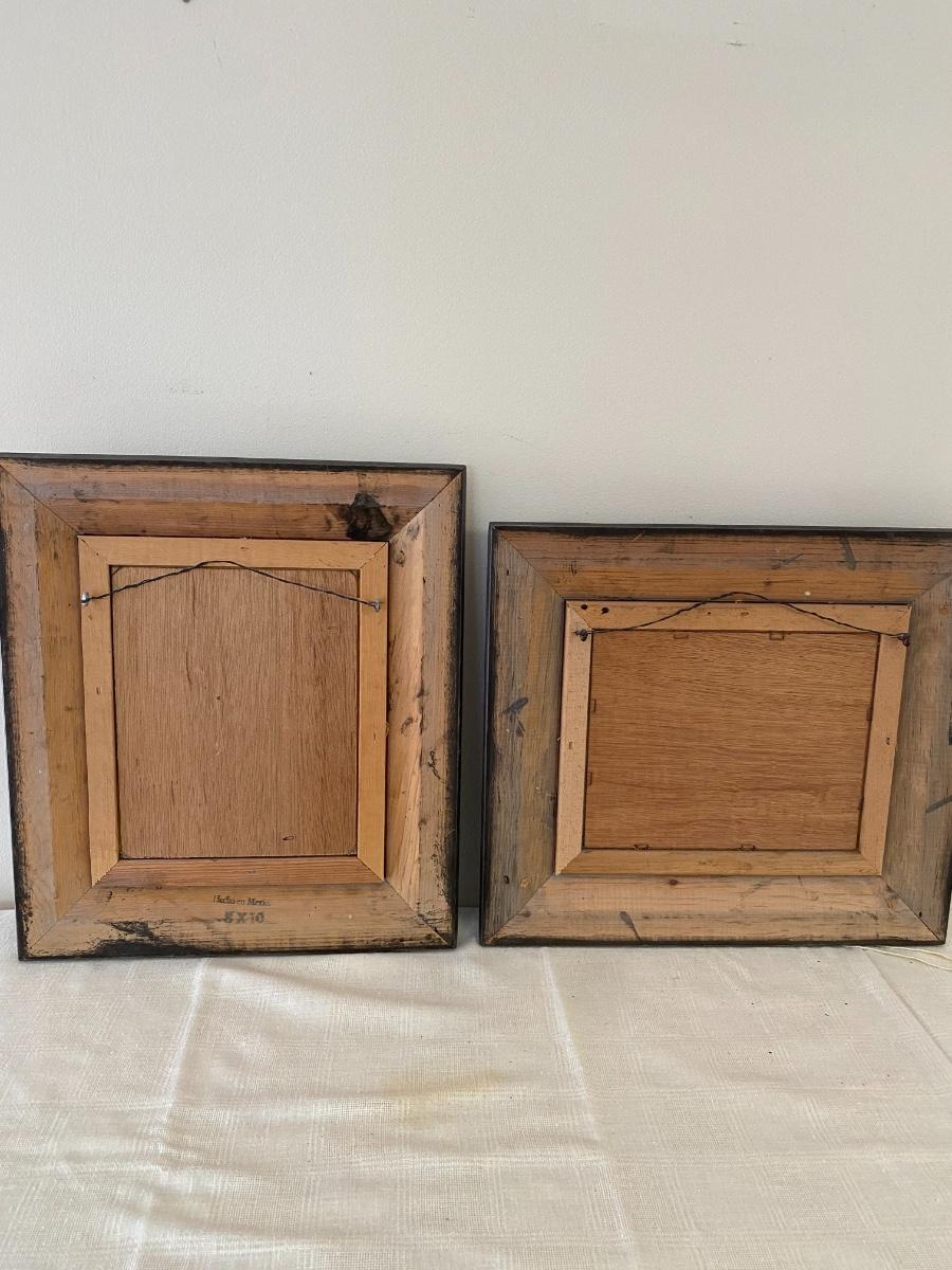 One is signed it say Johnson and measures 16 x 17 1/2“ framed. The other is signed Guenther And measures 18 x 15” Framed. These appear to be oil on board paintings. They are on the kitchen counter to the left of the sink.