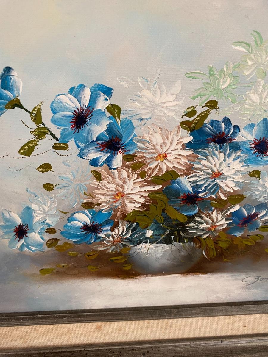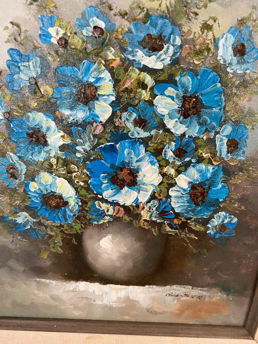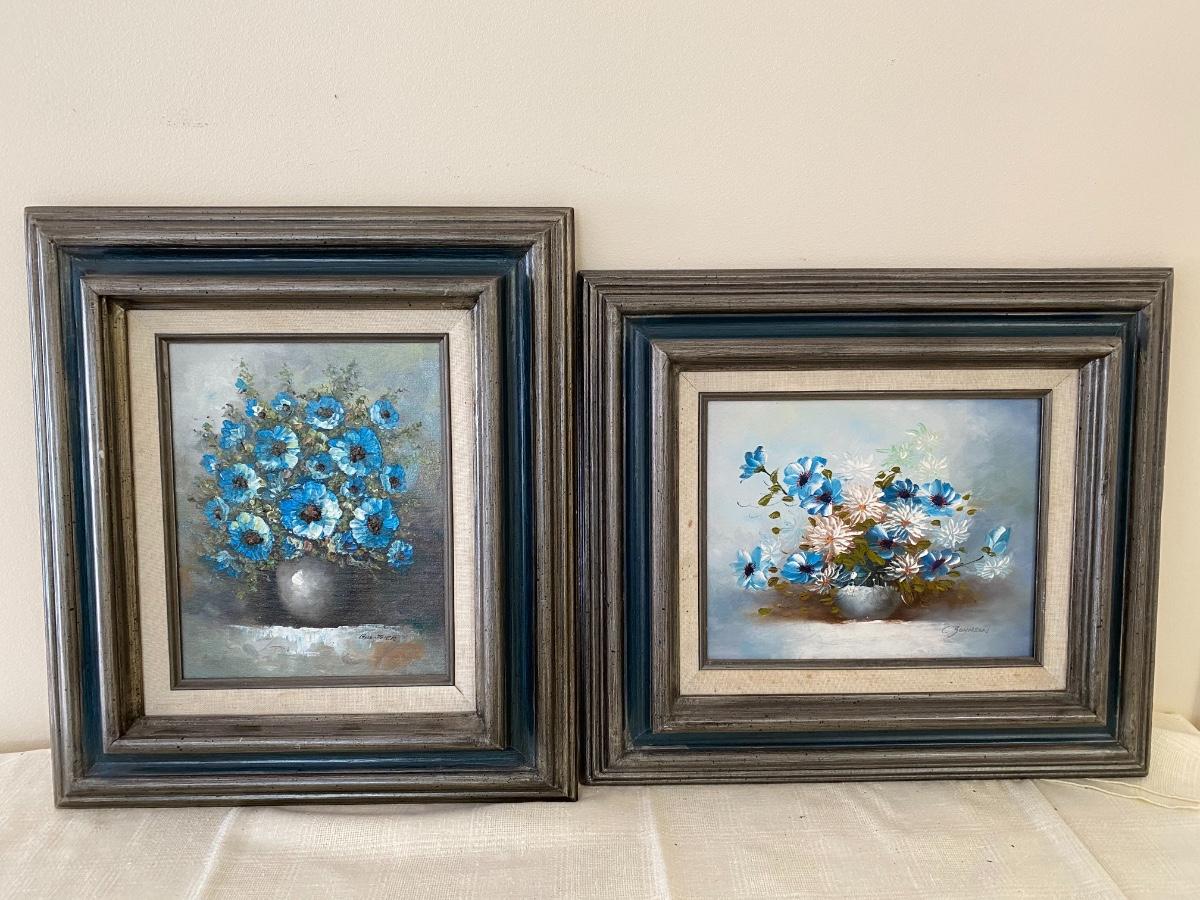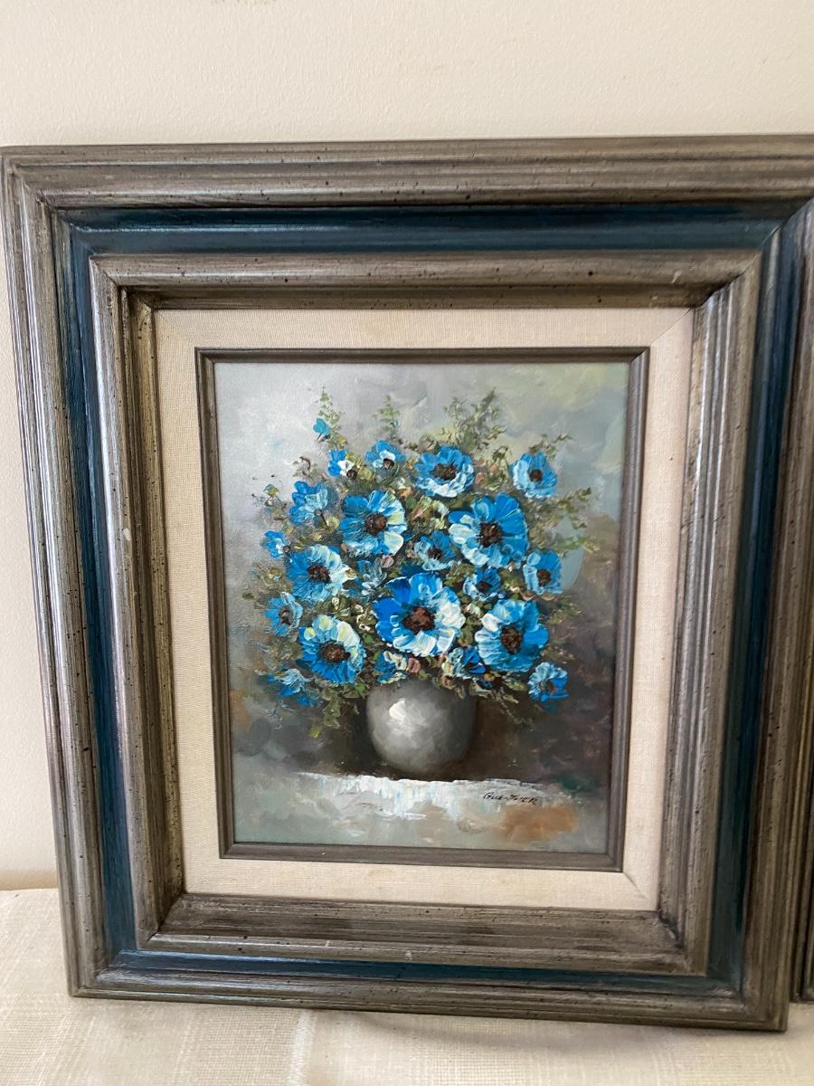 One is signed it say Johnson and measures 16 x 17 1/2“ framed. The other is signed Guenther And measures 18 x 15” Framed. These appear to be oil on board paintings. They are on the kitchen counter to the left of the sink.