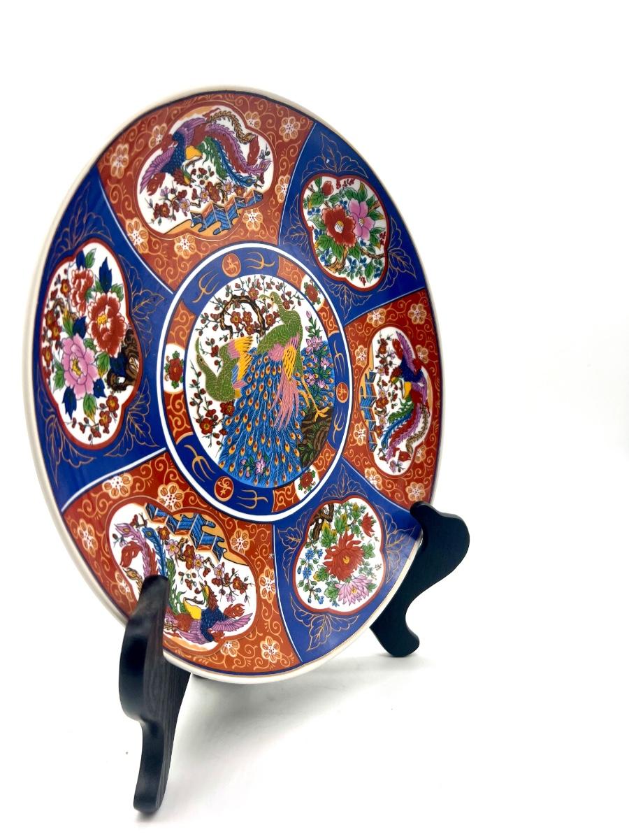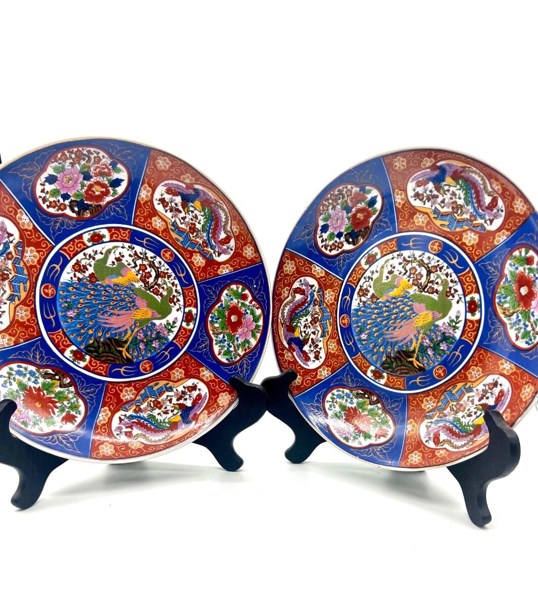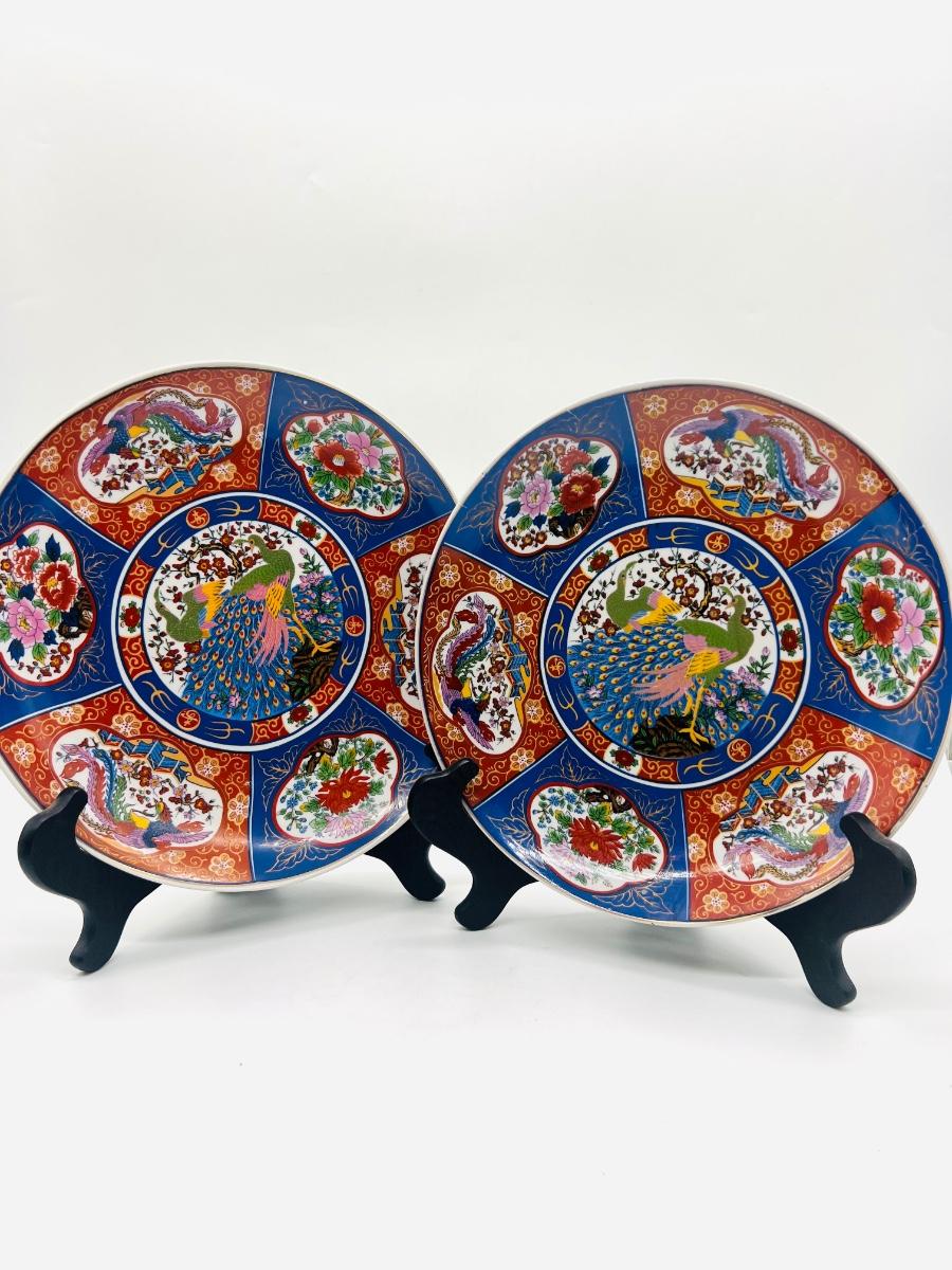 Two Moroccan Taous Plates With stands. Beautiful peacock center. Measures 12 inches round.