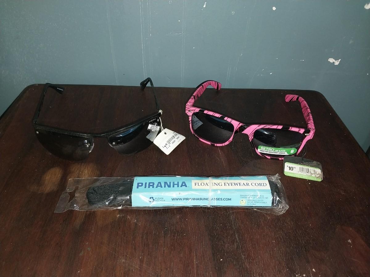 TWO PAIR NEW SUNGLASSES WITH TAGS AND PIRANHA EYEWARE CORD