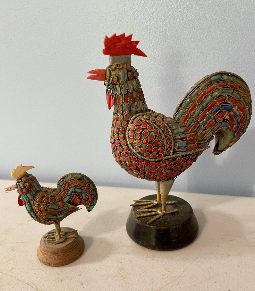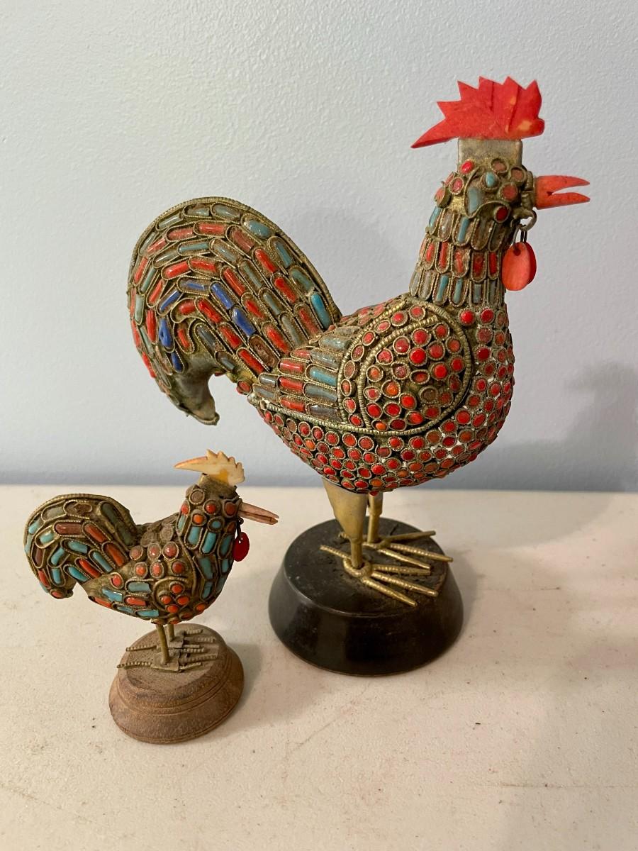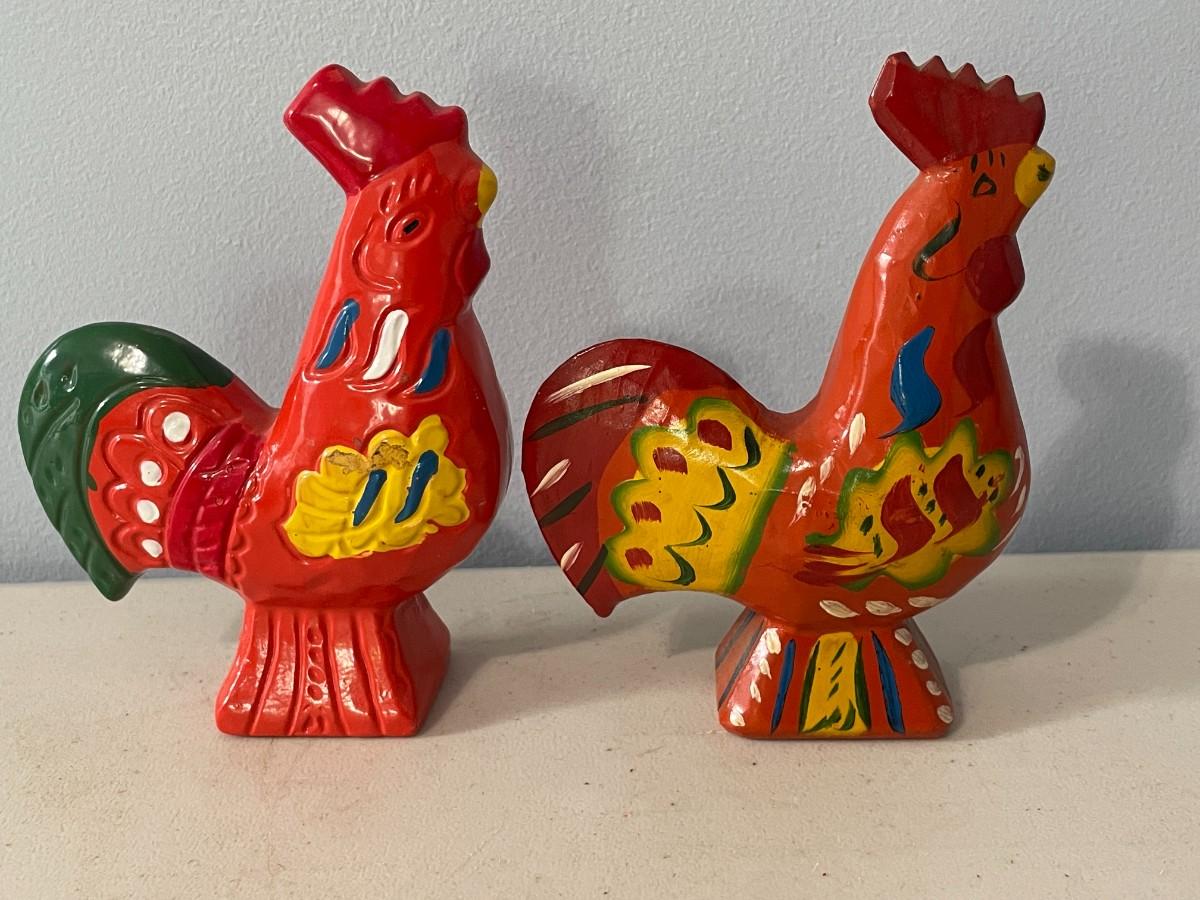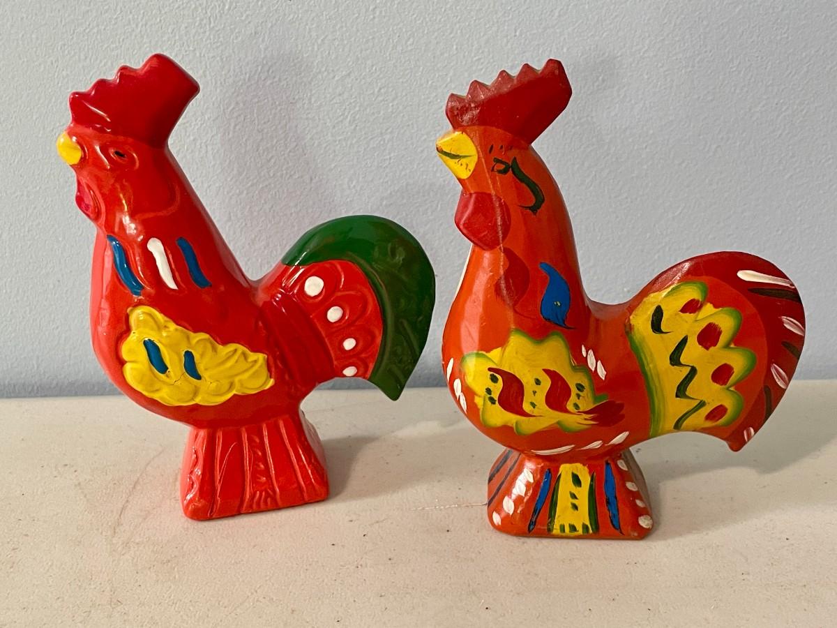 Includes a pair of beaded and a pair of painted pottery roosters.
