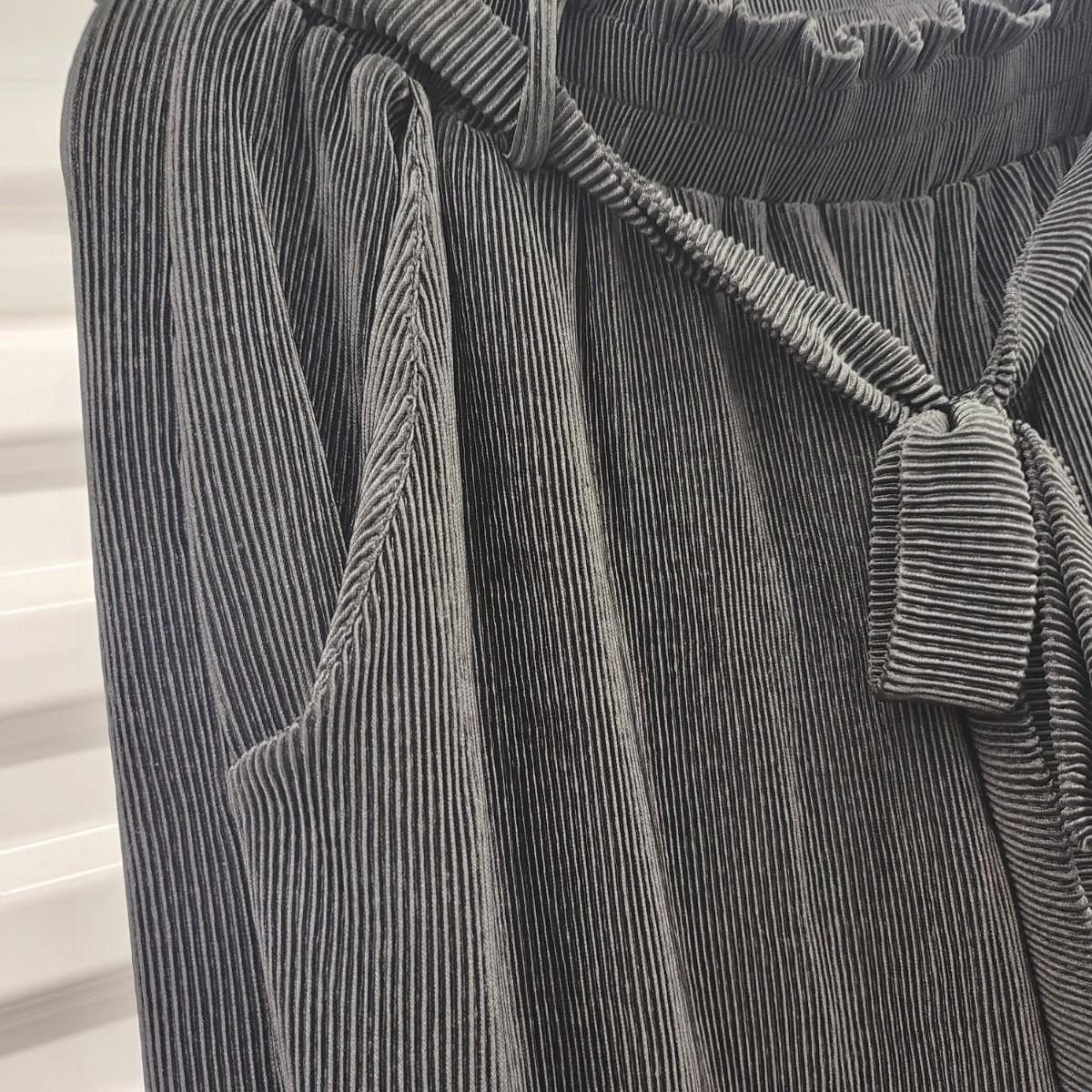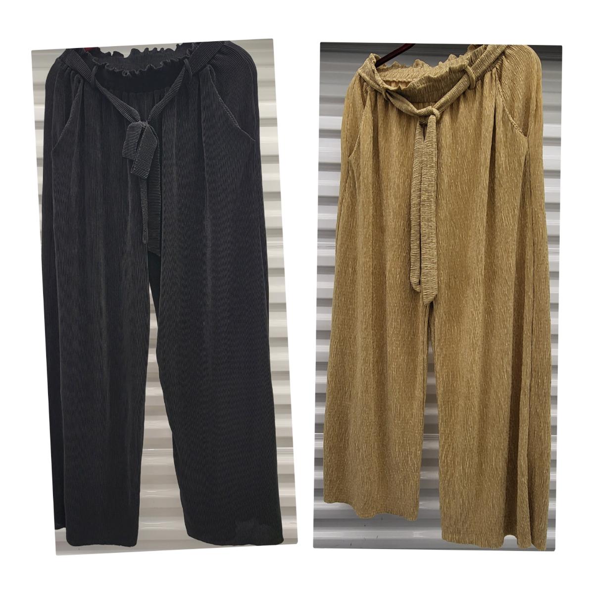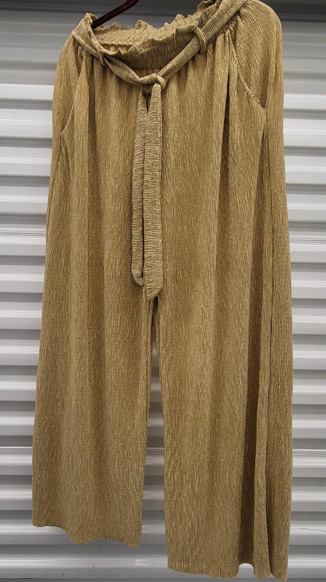 Pull-on, elastic top, flare leg flowing crepe dress pants with belt ties. One pair is black, one pair is Taupe. They are both size small with 28" inseam.