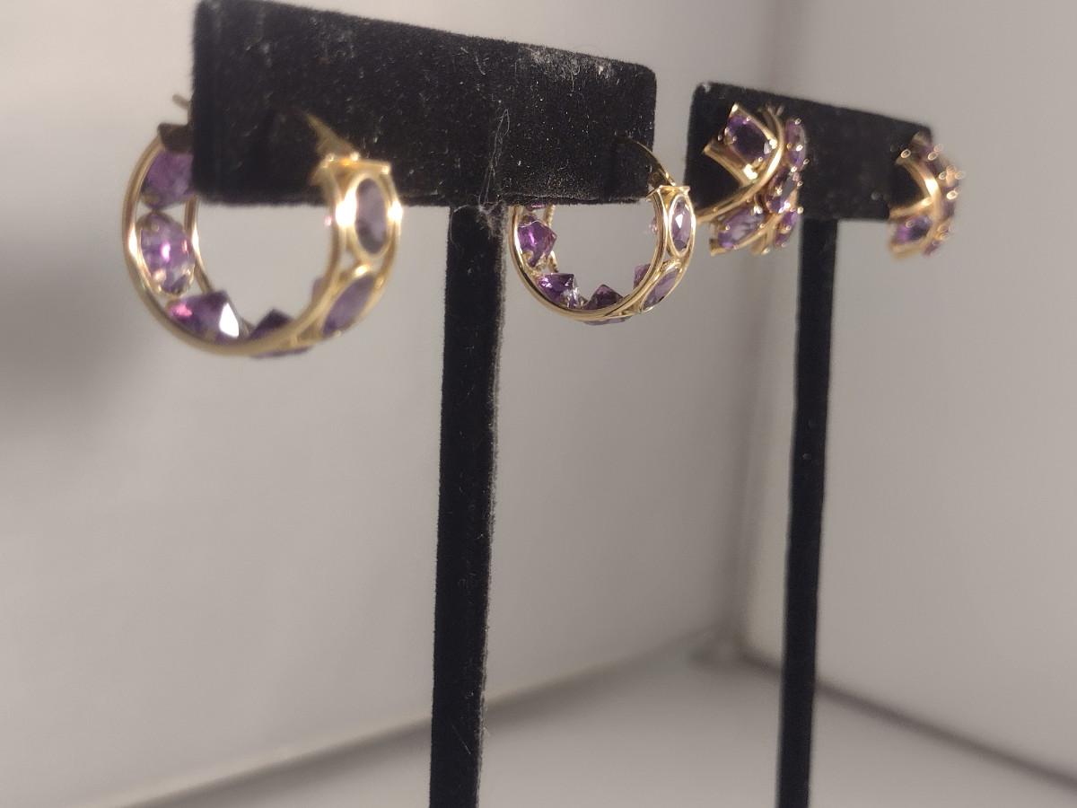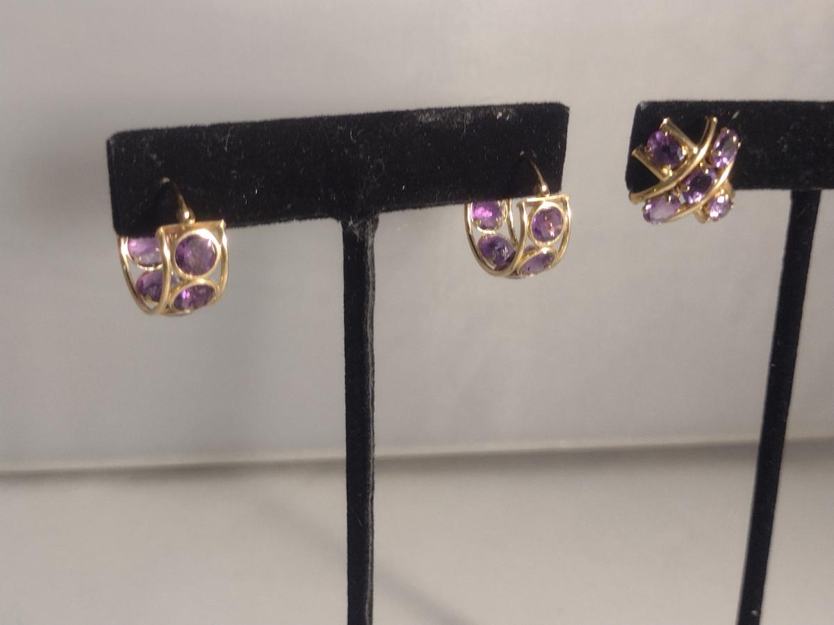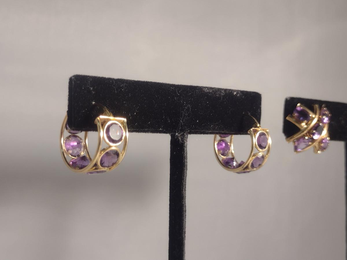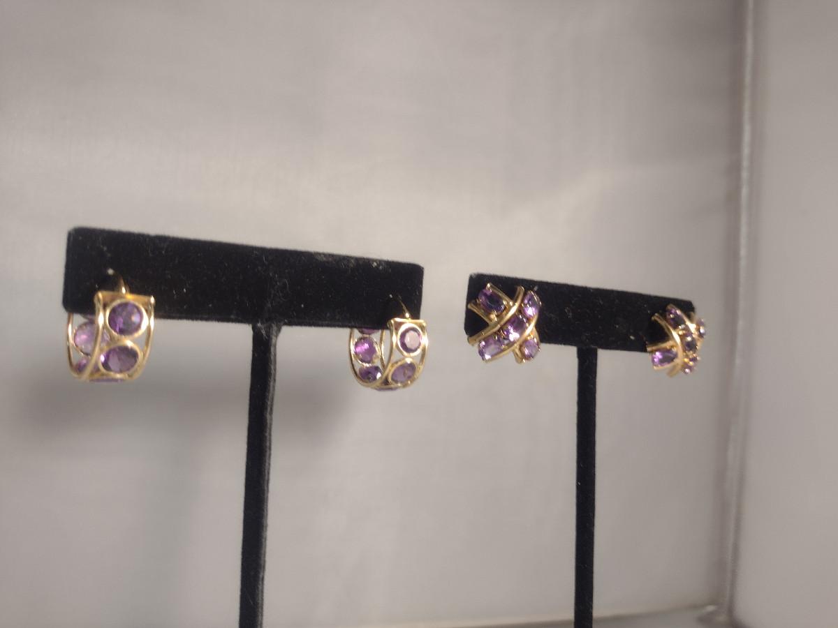 Two Pairs of 10 Karat Yellow Gold and Gemstone Post Earrings- Approx Weight 6.1 Grams (#43). Stones are possibly amethyst.