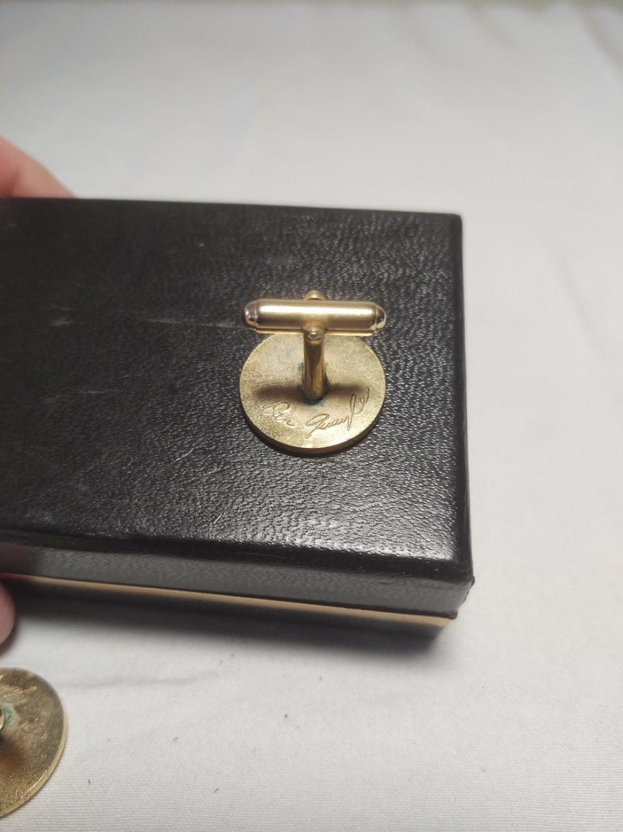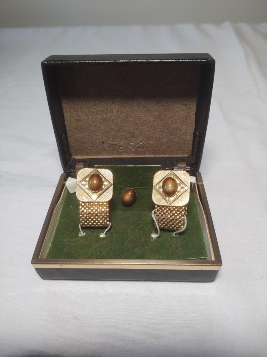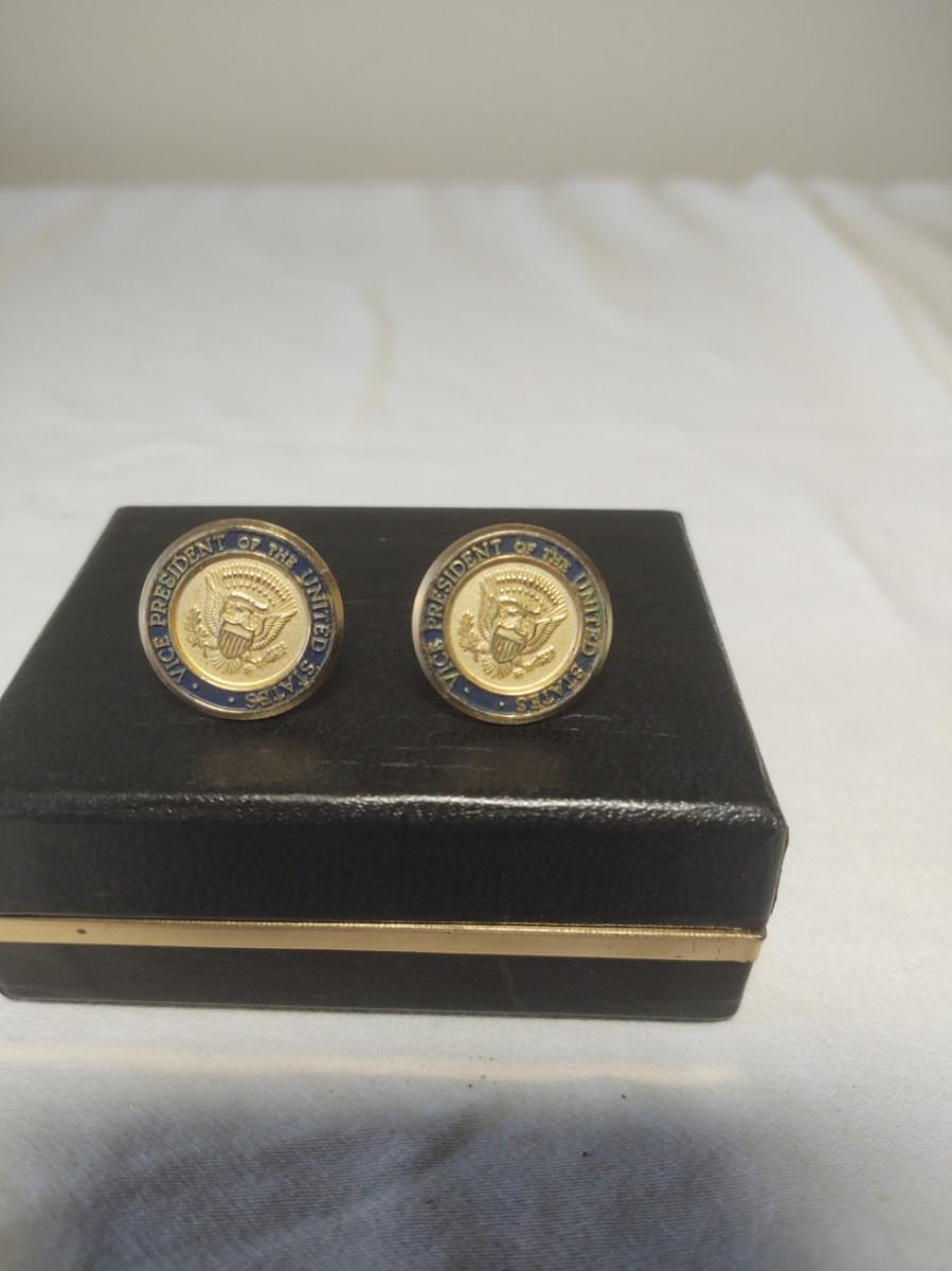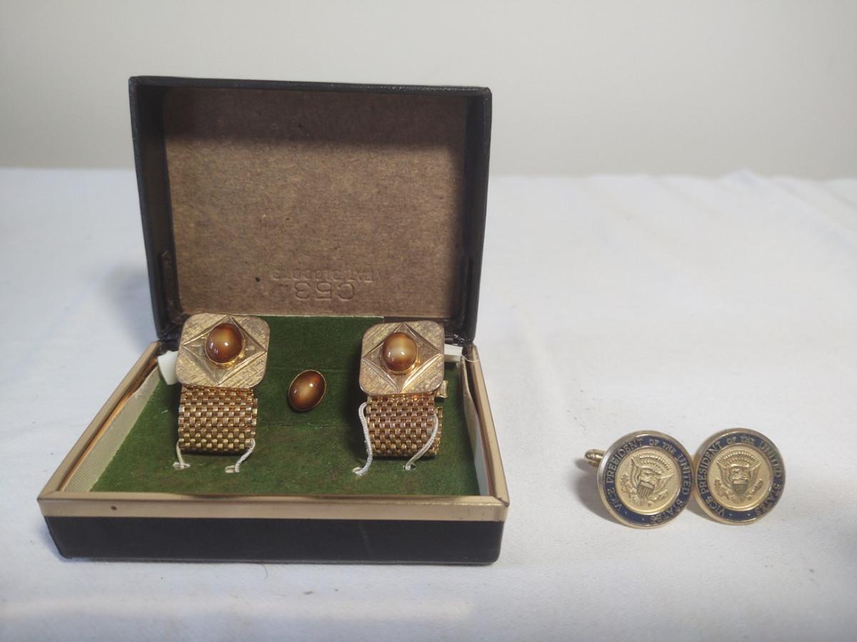 One pair is gold toned and is set with a tiger's eye stone. The other pair are an official souvenir Vice President Dan Quayle cuff links. The front has the seal of the vice president and the back has Dan Quayle's signature etched into the cuff link. See pictures for more detail.