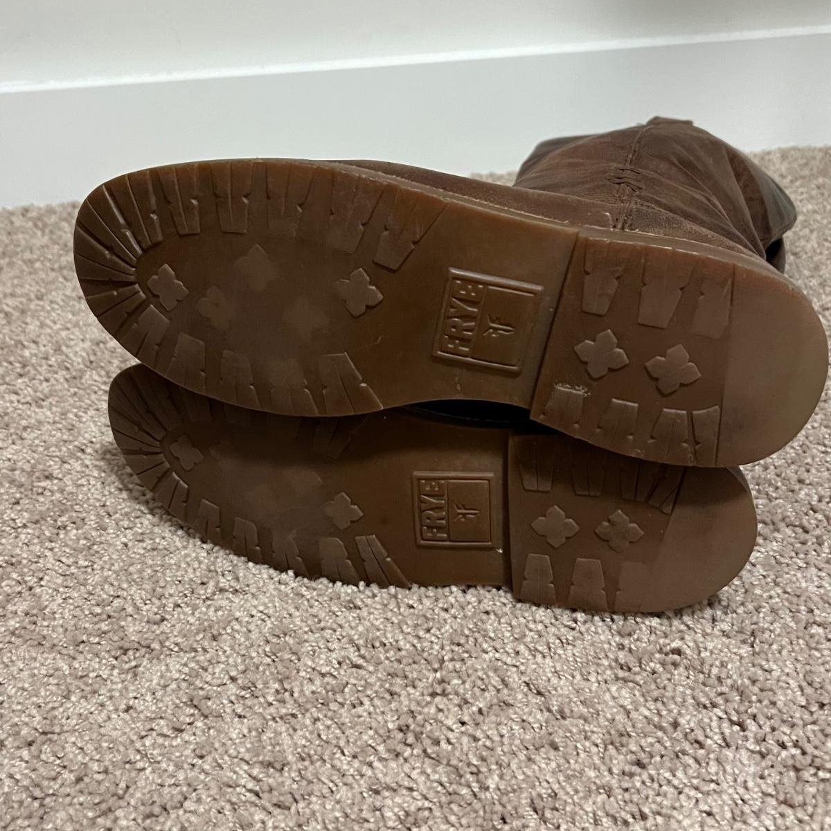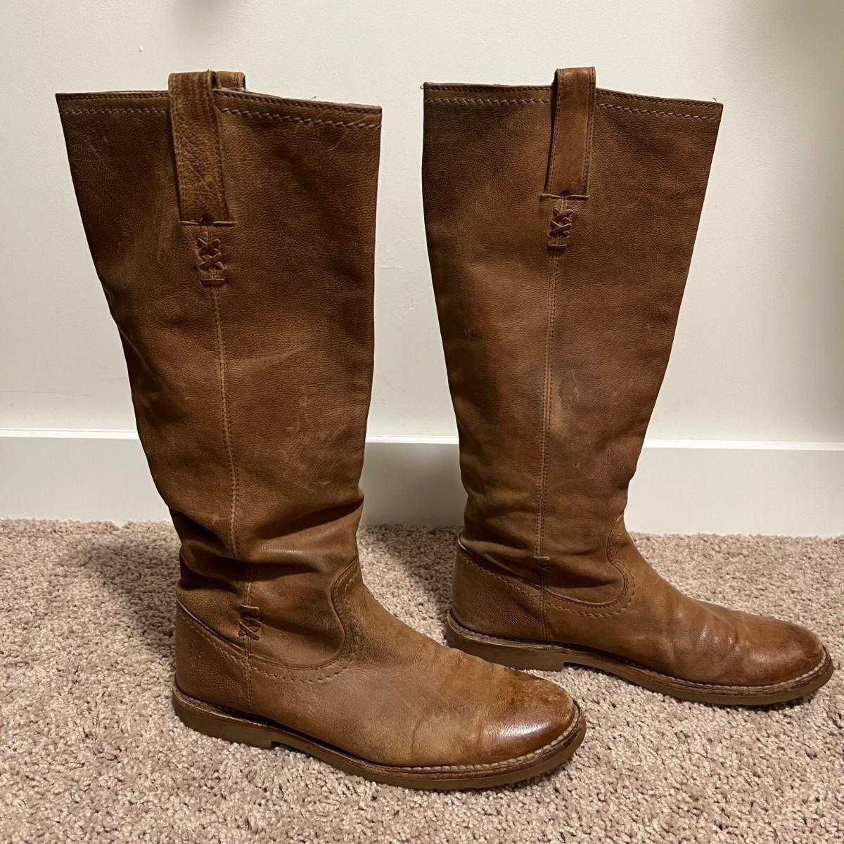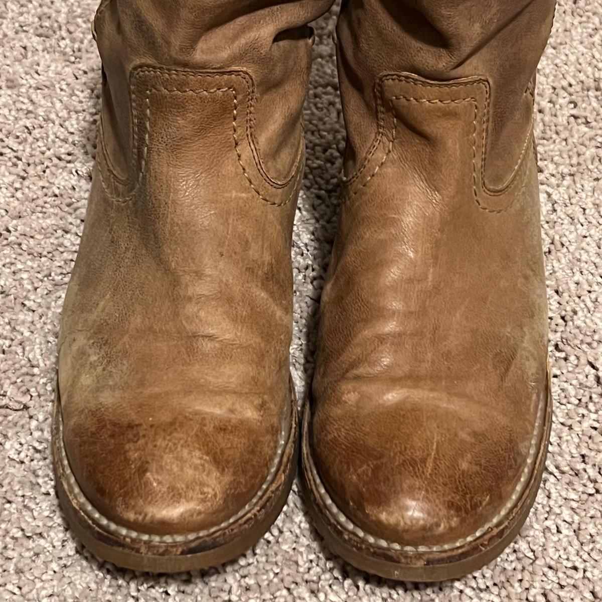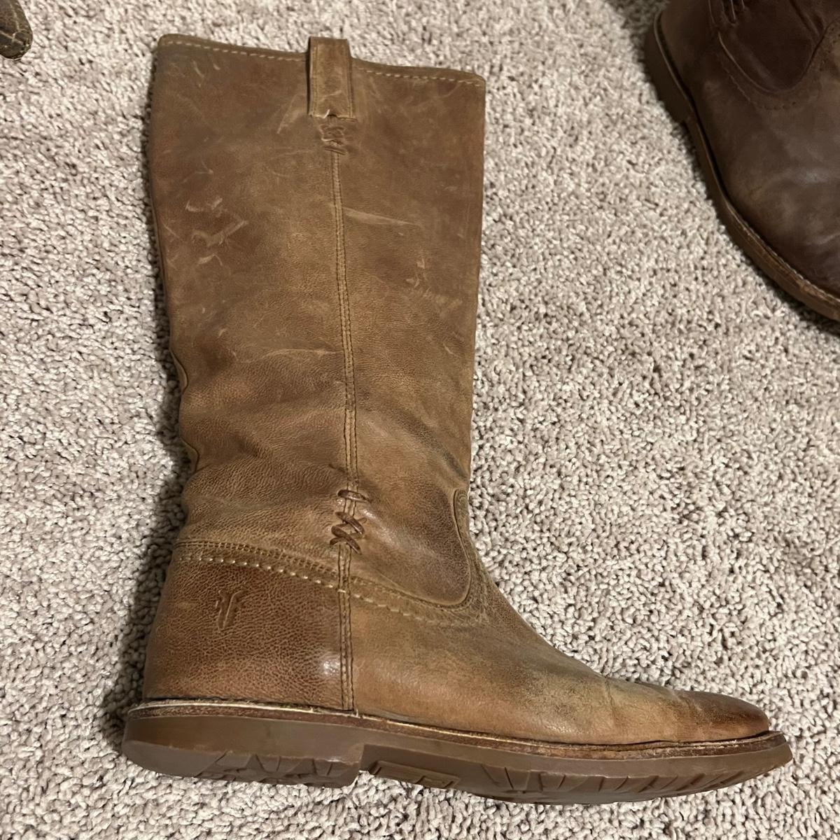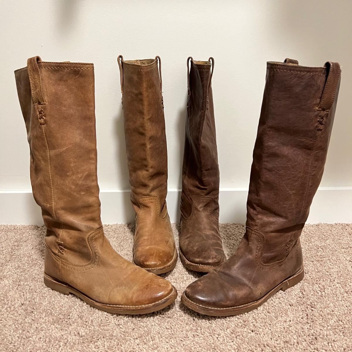 Two pairs of Frye leather boots in size 8.5. Plenty of wear left in this pair of brown and pair of tan boots that both have that desirable worn leather look!
