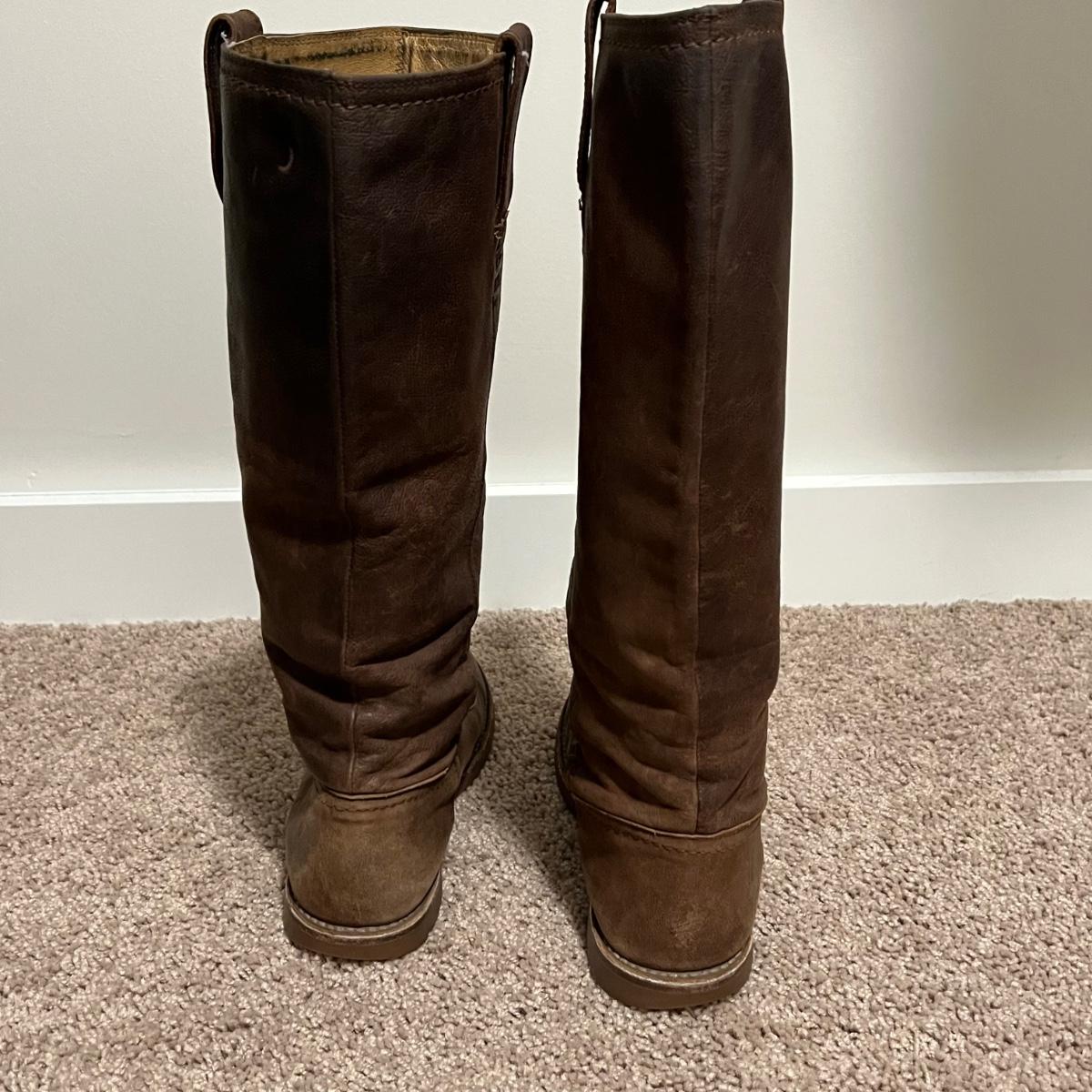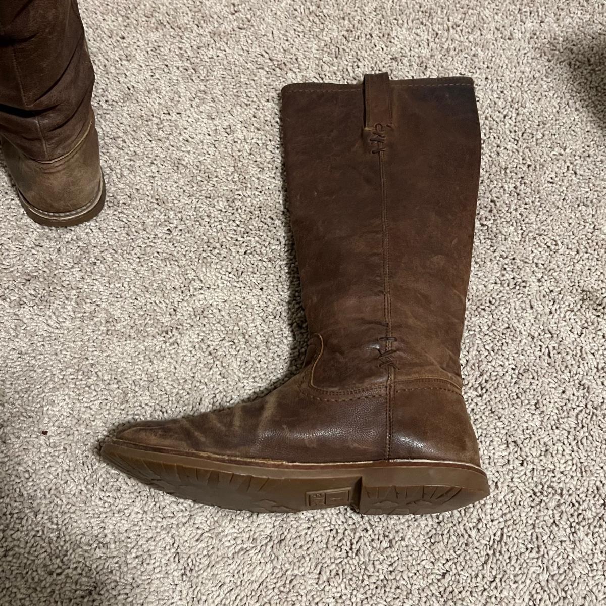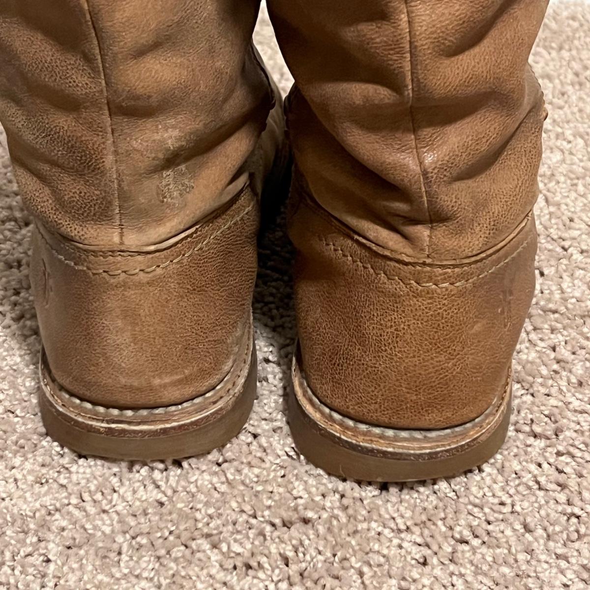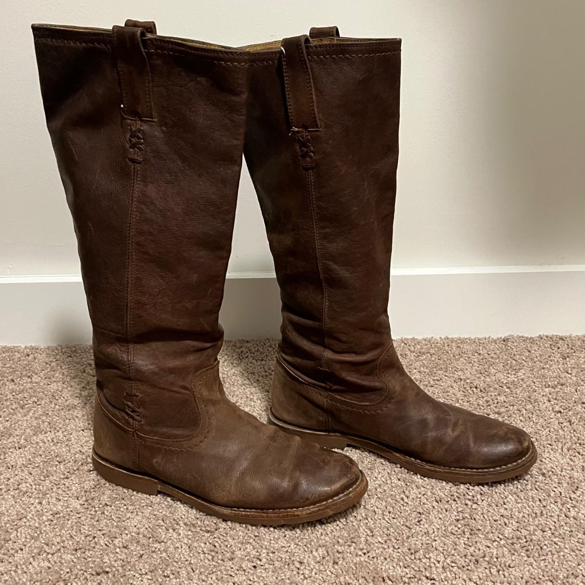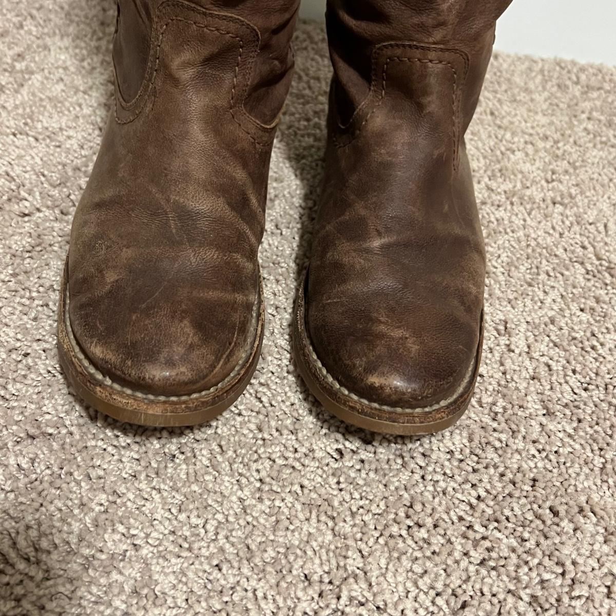 Two pairs of Frye leather boots in size 8.5. Plenty of wear left in this pair of brown and pair of tan boots that both have that desirable worn leather look!