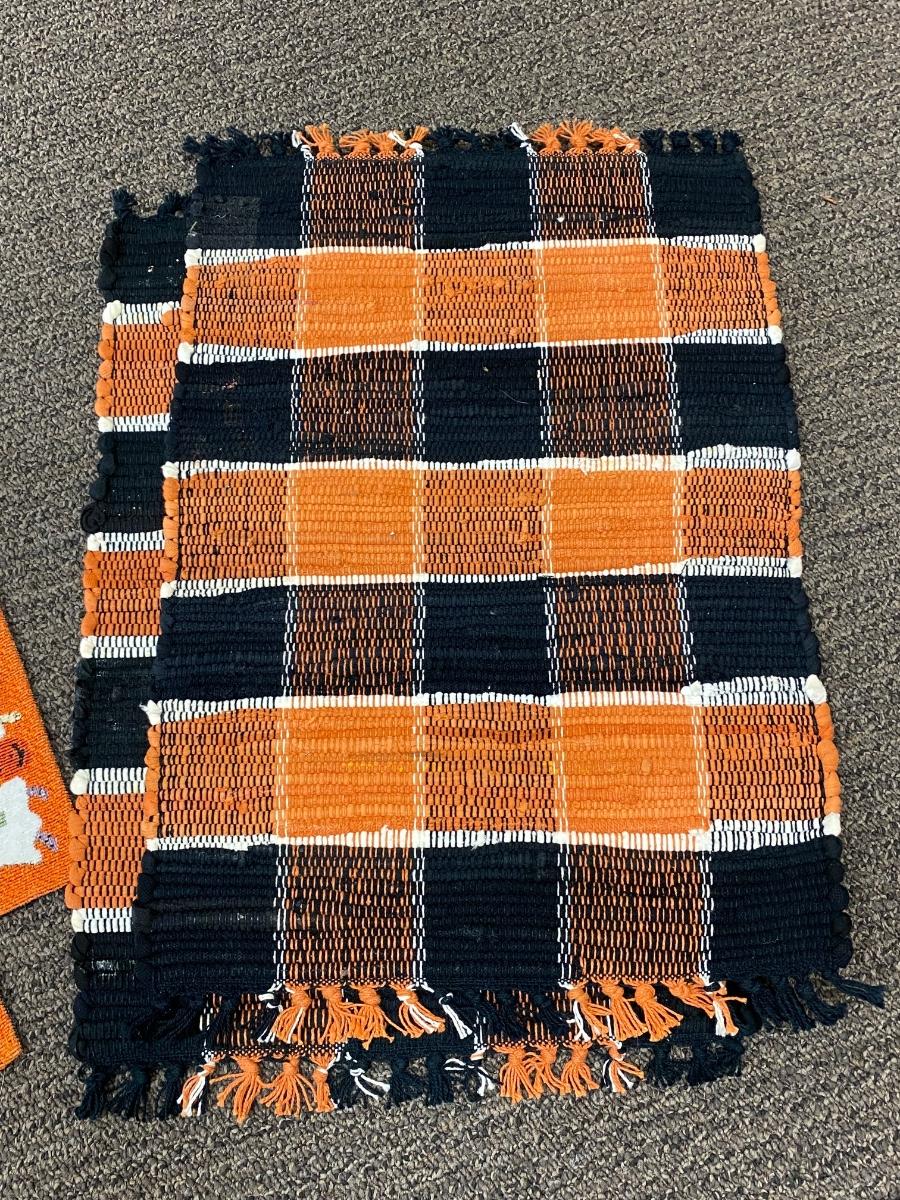 Two pairs of Halloween seasonal placemats. One set is orange with ghost edges, the other set is orange and black plaid. In good used condition, may have light spots/discolor from use.