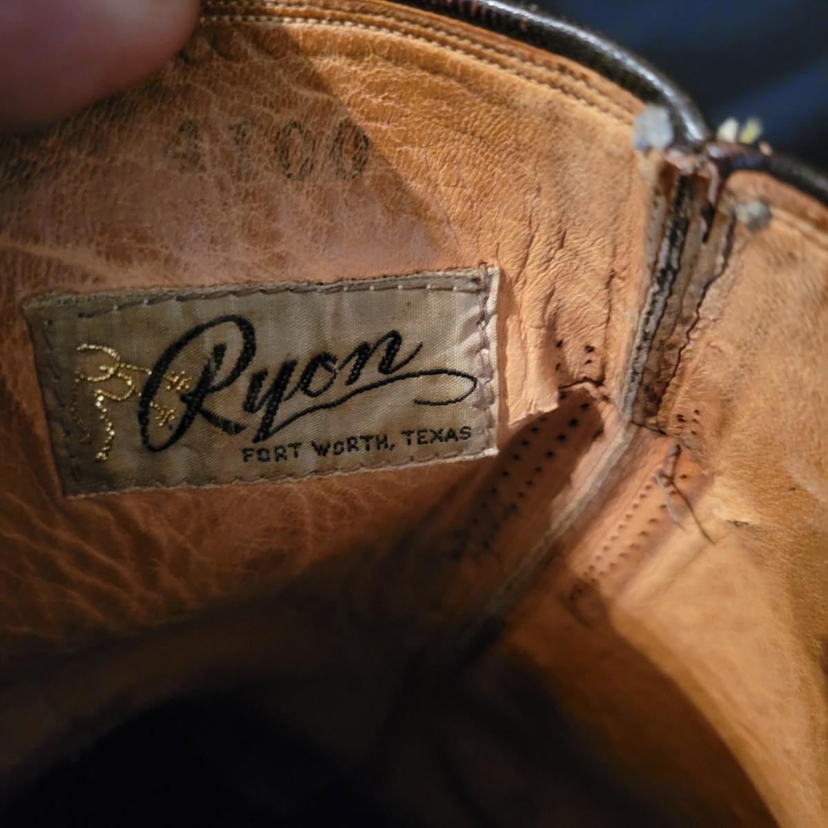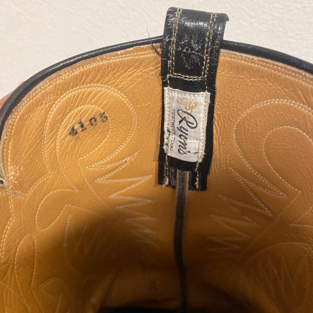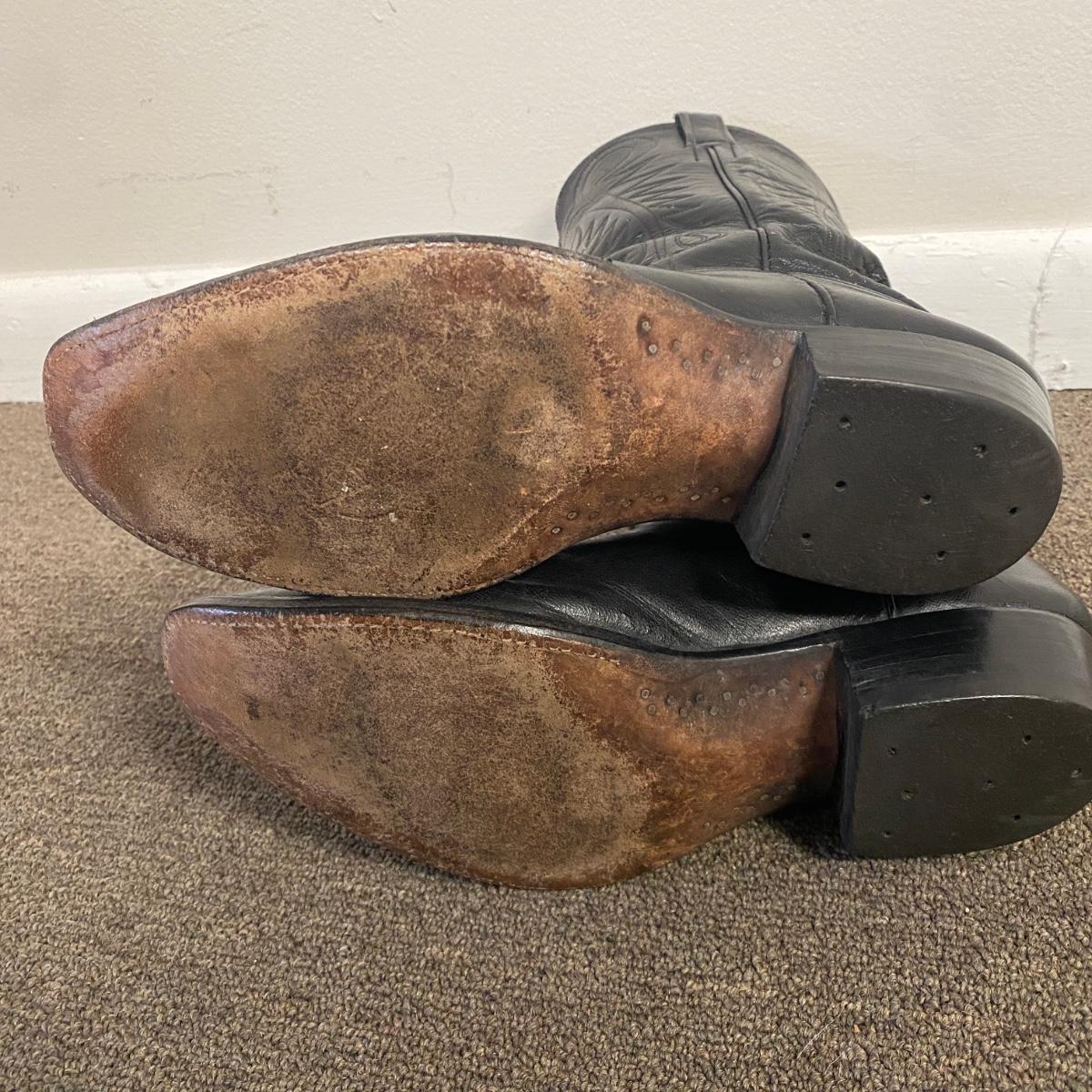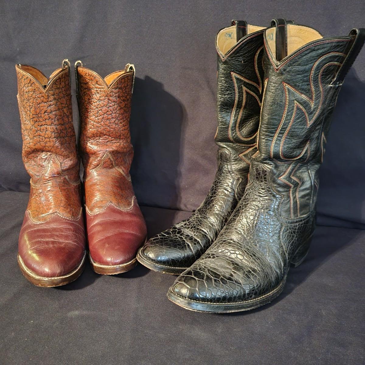 Three pairs of men's cowboy boots. One pair is a reddish brown leather made by Ryon's and appear to be the same size as the black boots. There is a torn bootstrap on the right boot. Also includes a pair of black boots that show 9 1/2D for the sizing. And another pair of black boots that has some tags but no sizing. The bottoms appears to black, embossed leather. See photos for details. Shipping available.