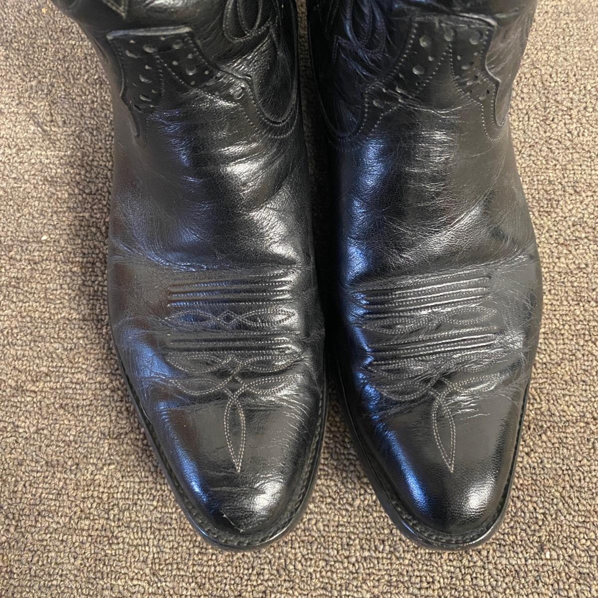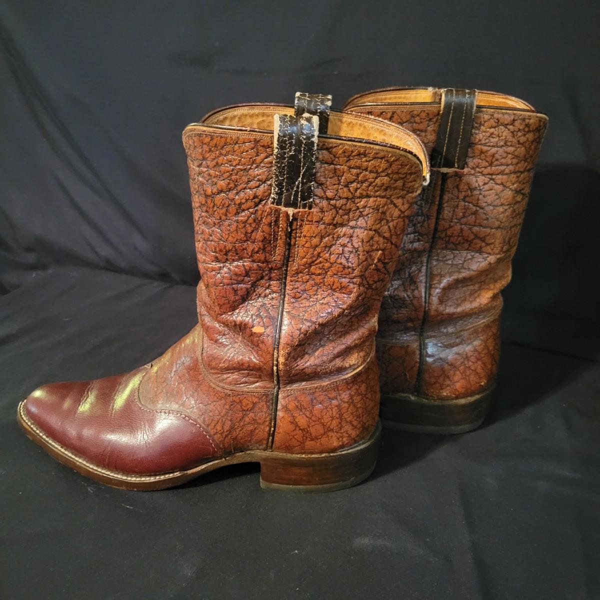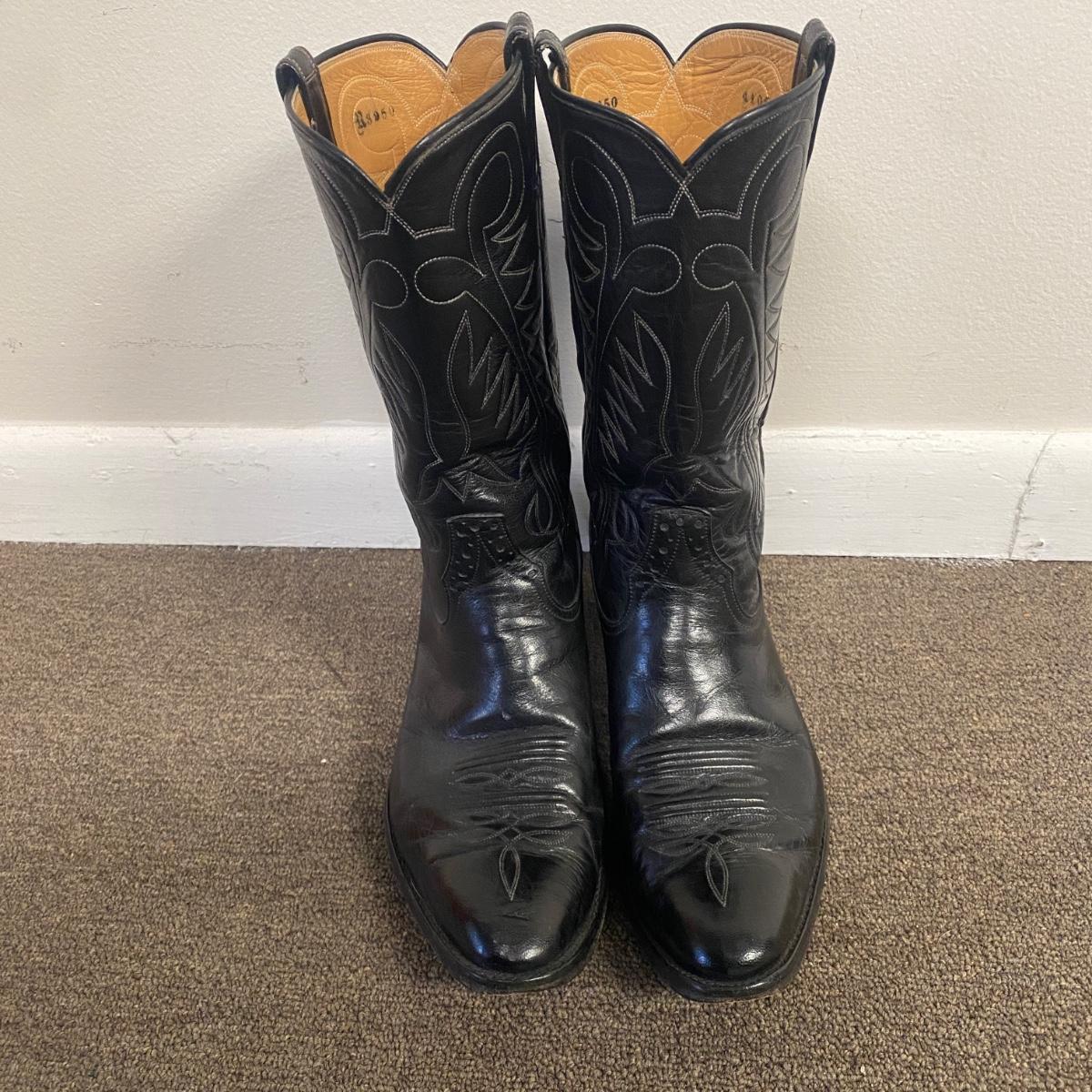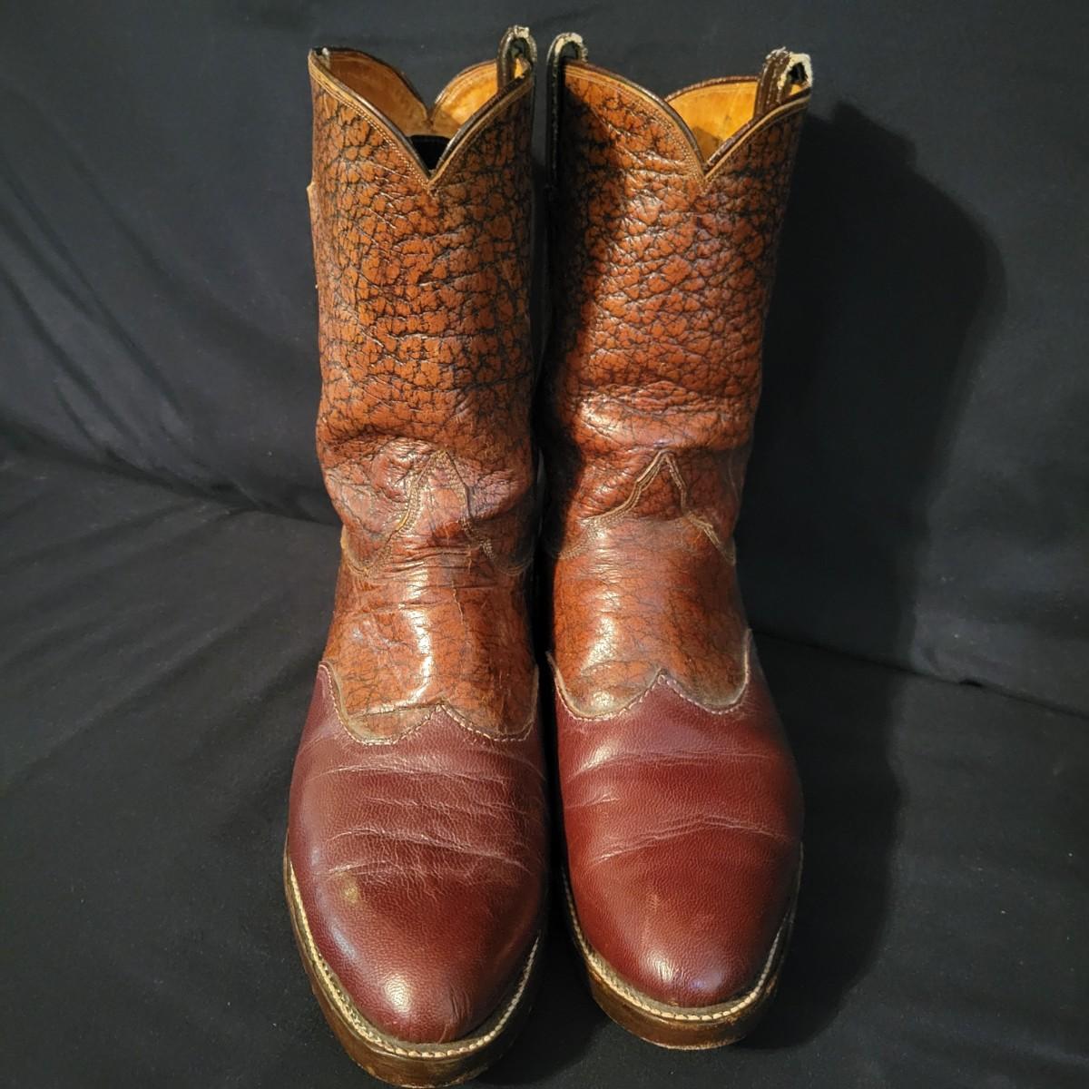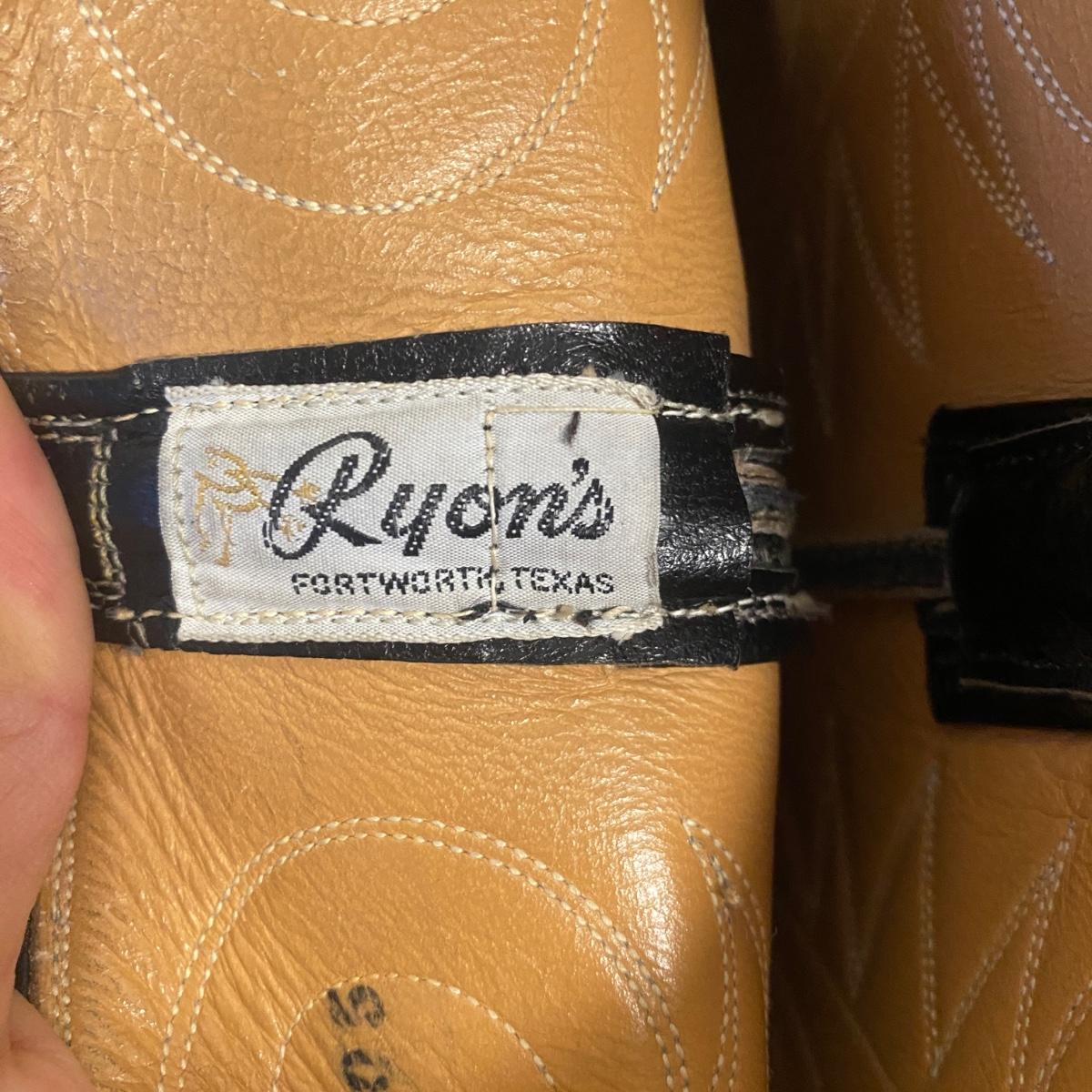 Three pairs of men's cowboy boots. One pair is a reddish brown leather made by Ryon's and appear to be the same size as the black boots. There is a torn bootstrap on the right boot. Also includes a pair of black boots that show 9 1/2D for the sizing. And another pair of black boots that has some tags but no sizing. The bottoms appears to black, embossed leather. See photos for details. Shipping available.