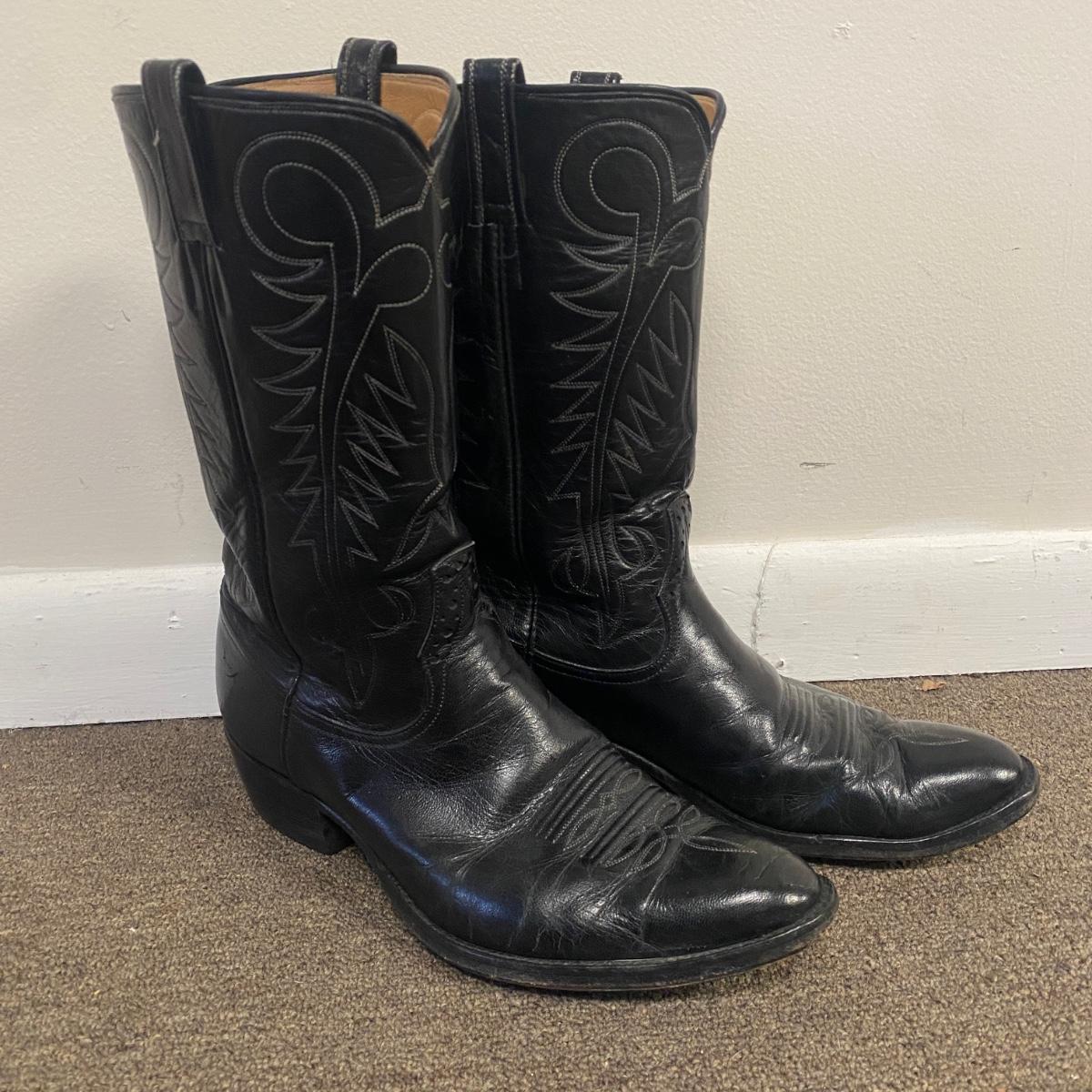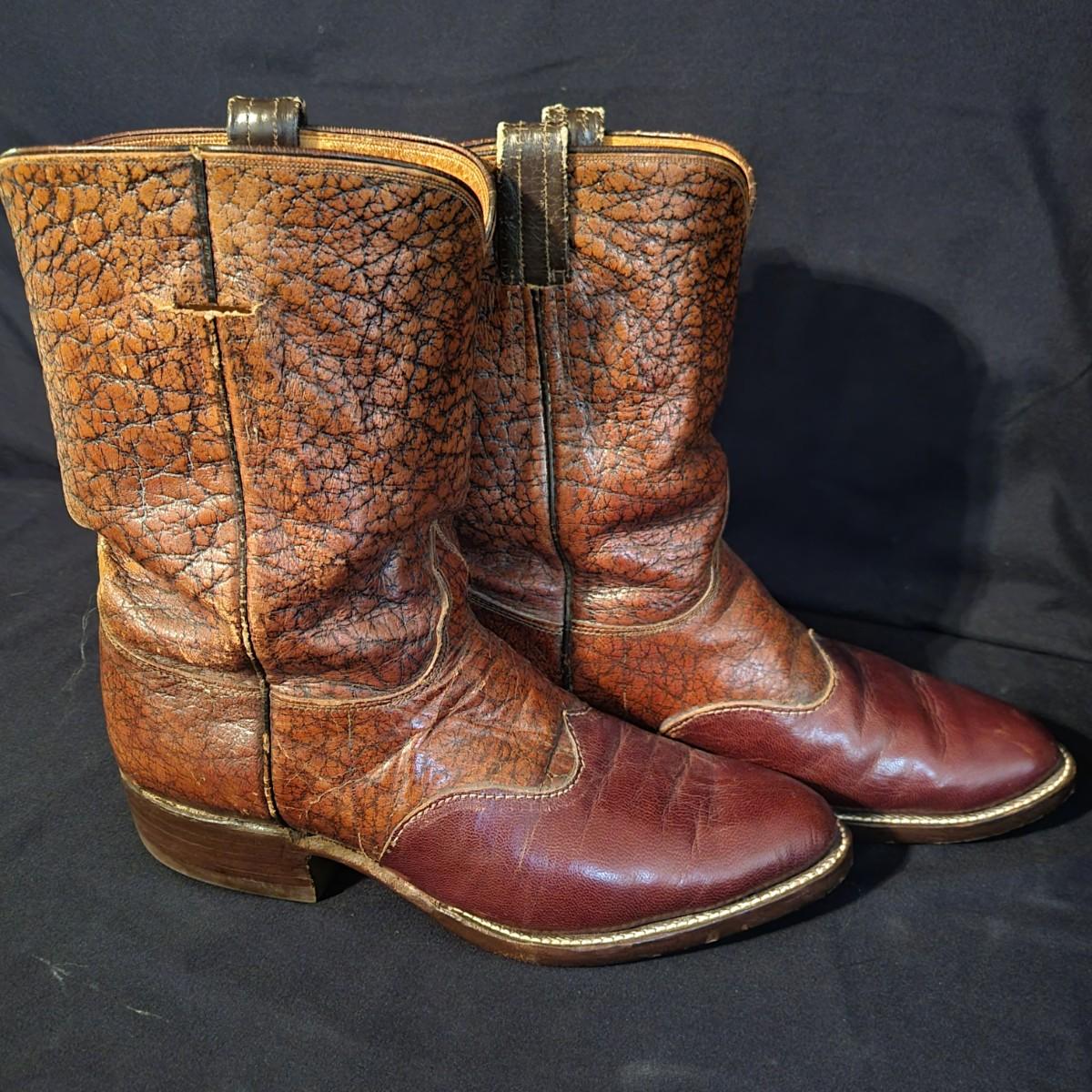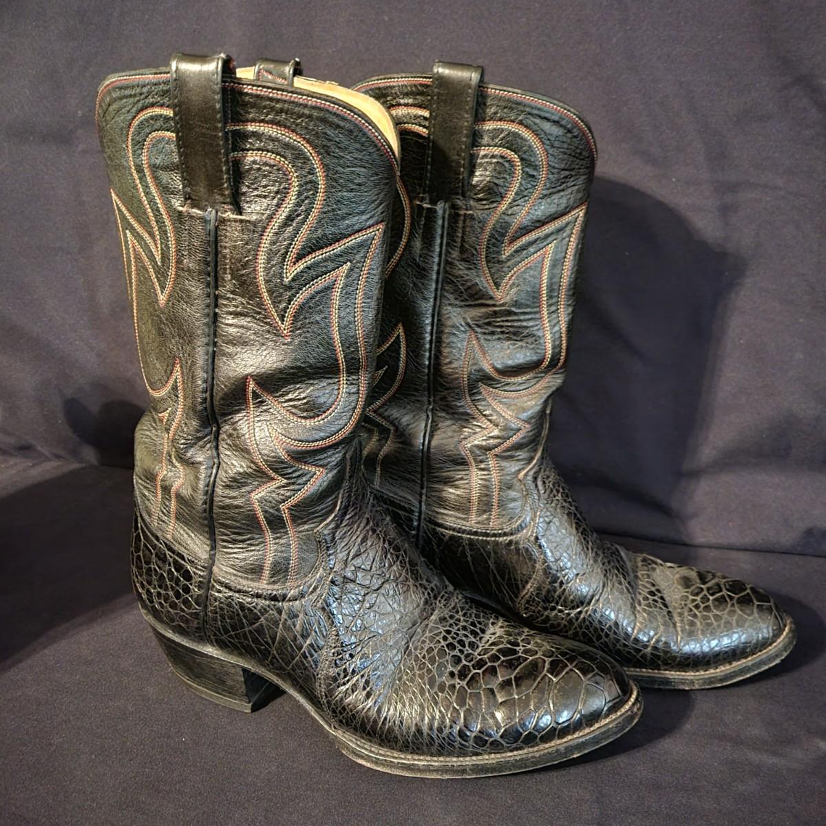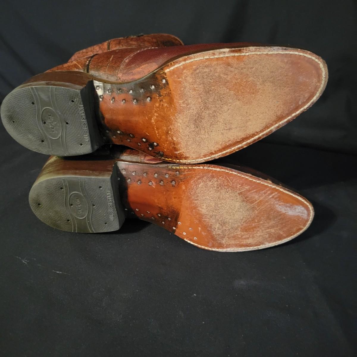 Three pairs of men's cowboy boots. One pair is a reddish brown leather made by Ryon's and appear to be the same size as the black boots. There is a torn bootstrap on the right boot. Also includes a pair of black boots that show 9 1/2D for the sizing. And another pair of black boots that has some tags but no sizing. The bottoms appears to black, embossed leather. See photos for details. Shipping available.