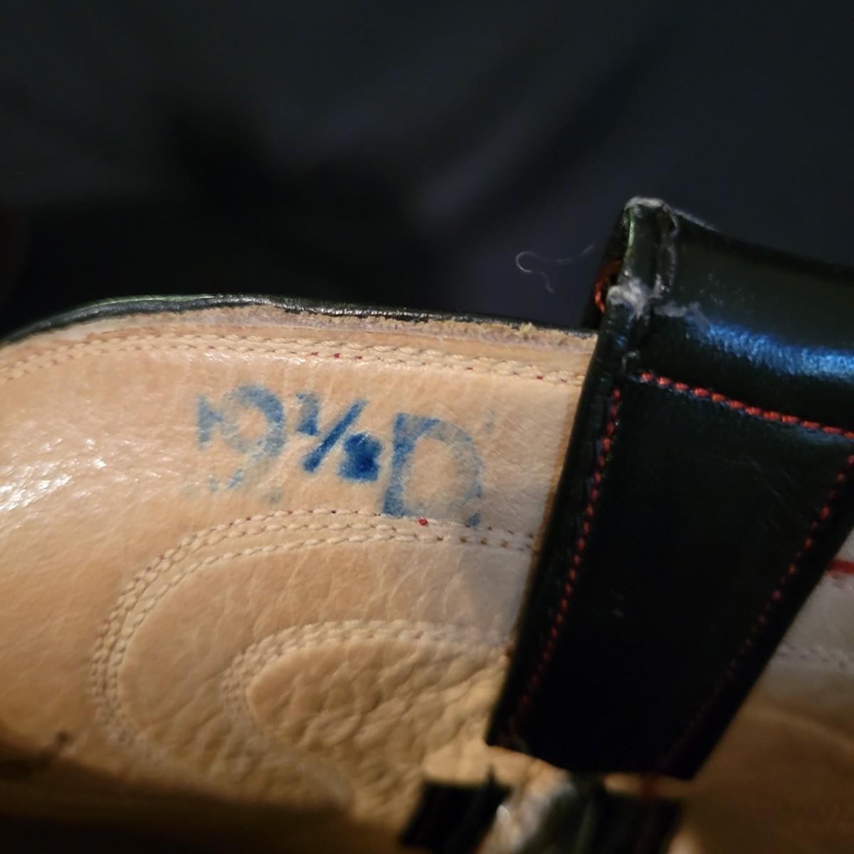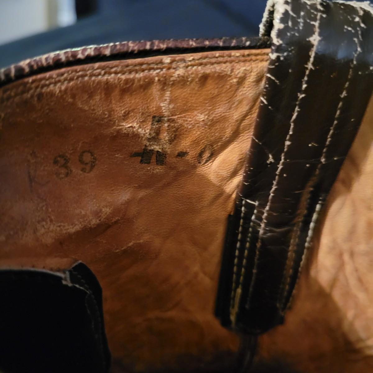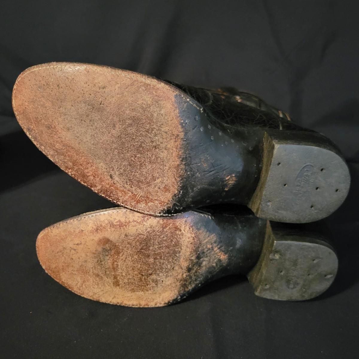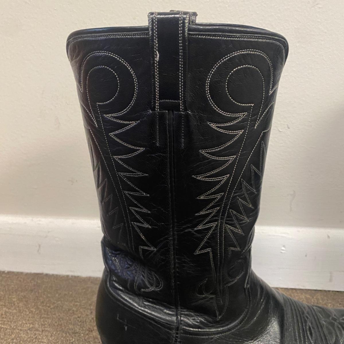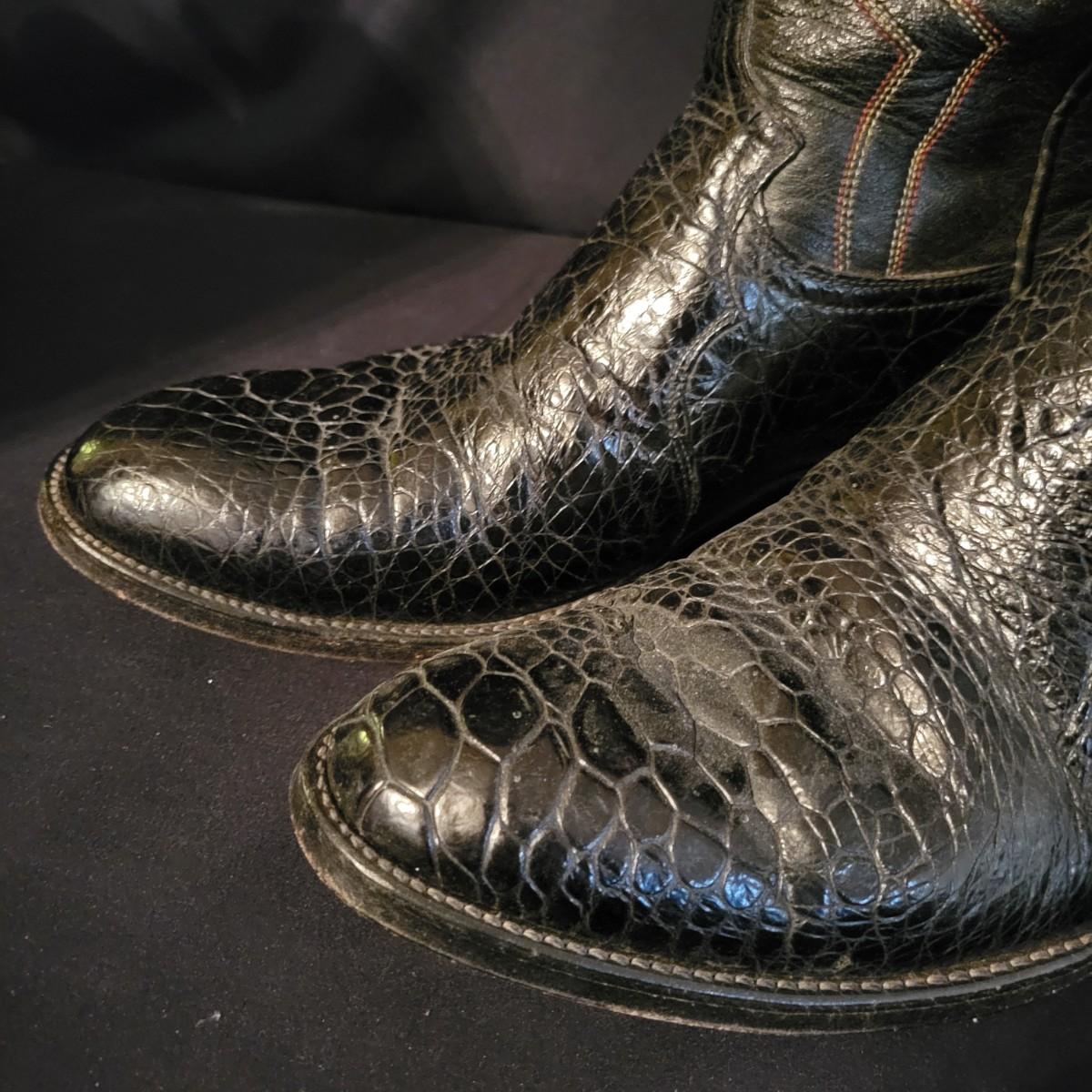 Three pairs of men's cowboy boots. One pair is a reddish brown leather made by Ryon's and appear to be the same size as the black boots. There is a torn bootstrap on the right boot. Also includes a pair of black boots that show 9 1/2D for the sizing. And another pair of black boots that has some tags but no sizing. The bottoms appears to black, embossed leather. See photos for details. Shipping available.