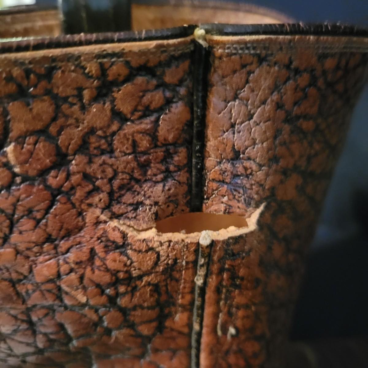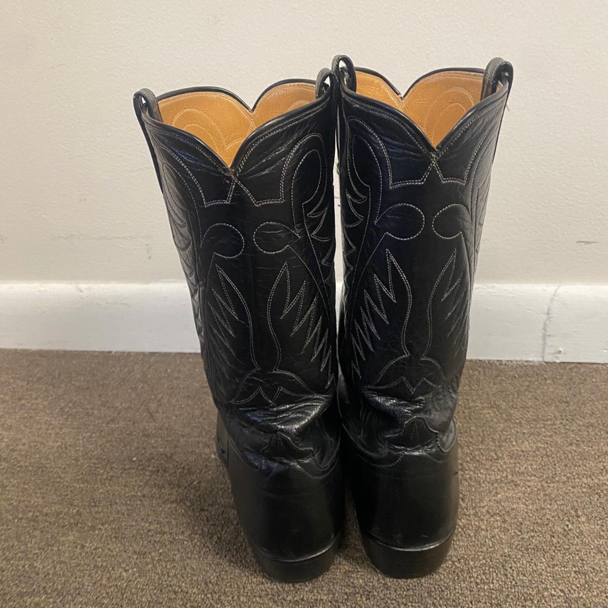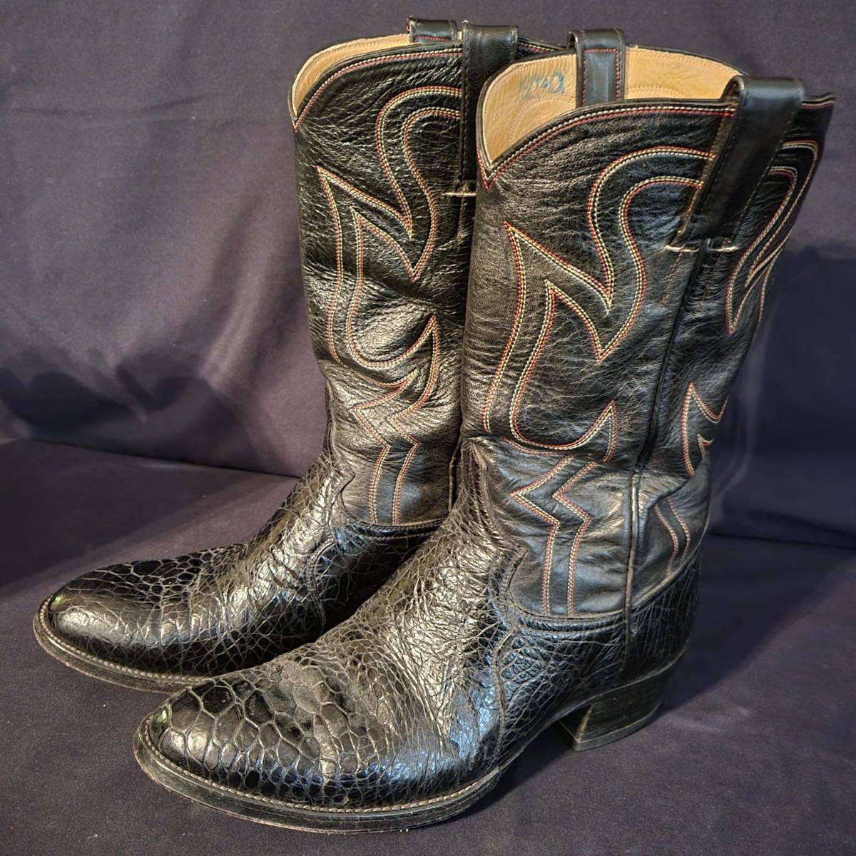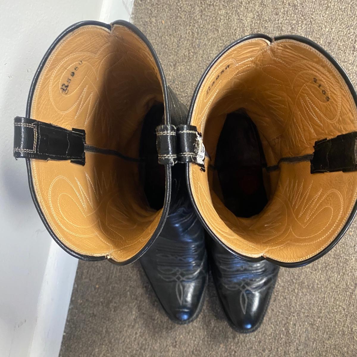Three pairs of men's cowboy boots. One pair is a reddish brown leather made by Ryon's and appear to be the same size as the black boots. There is a torn bootstrap on the right boot. Also includes a pair of black boots that show 9 1/2D for the sizing. And another pair of black boots that has some tags but no sizing. The bottoms appears to black, embossed leather. See photos for details. Shipping available.