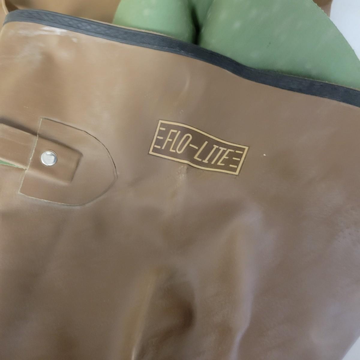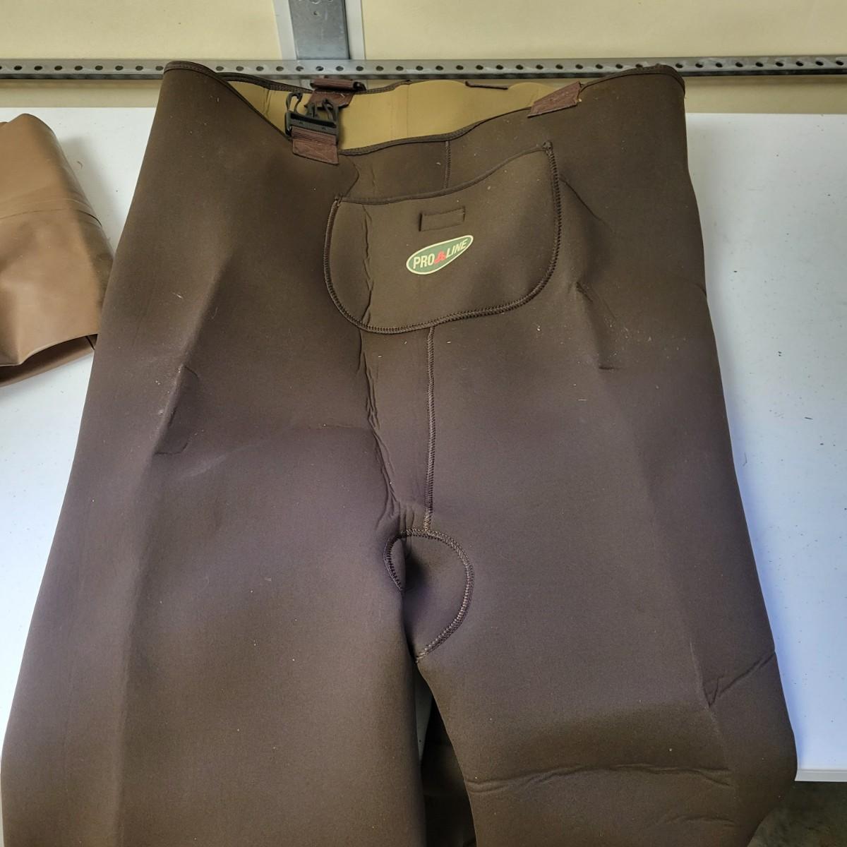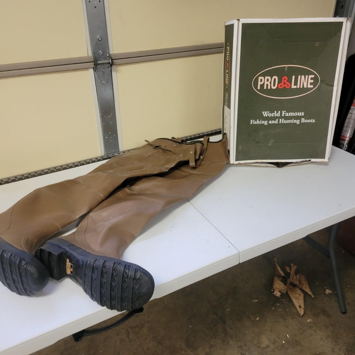 Two pairs of men's waders in excellent condition. One pair have never been used and the other pair has seen light use. One set is a pair of vinyl boot foot thigh waders manufactured by Flo-Lite. They have straps that loop through a belt to hold them up and they have rubber soles. These appear to have never been used. Also included is a pair of ProLine neoprene boot foot chest waders. These are also size 13 and have rubber soles. Shipping available. Shipping can be costly. We suggest calling our local UPS with dimensions and getting an estimate before bidding: (828) 252-6930