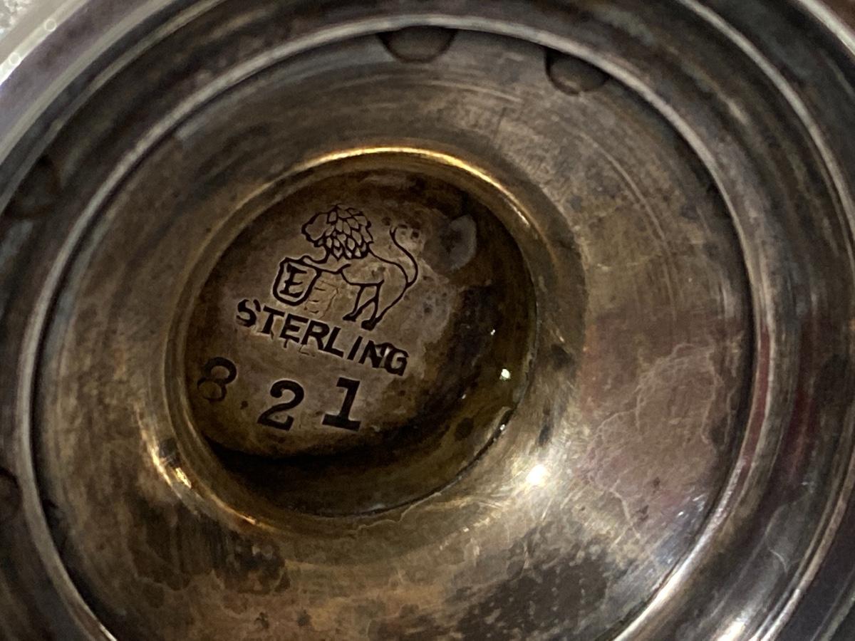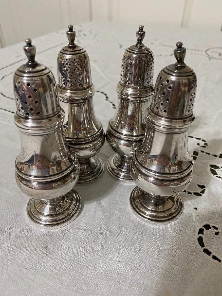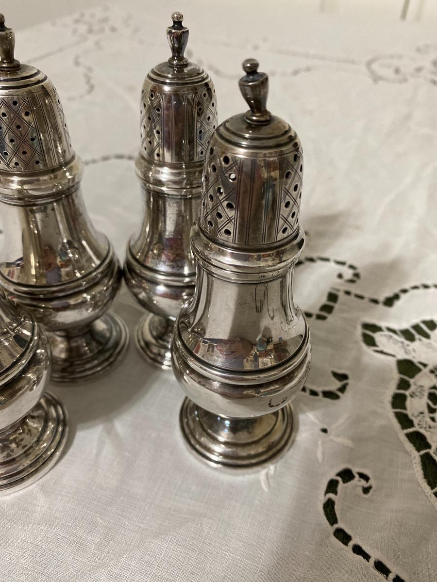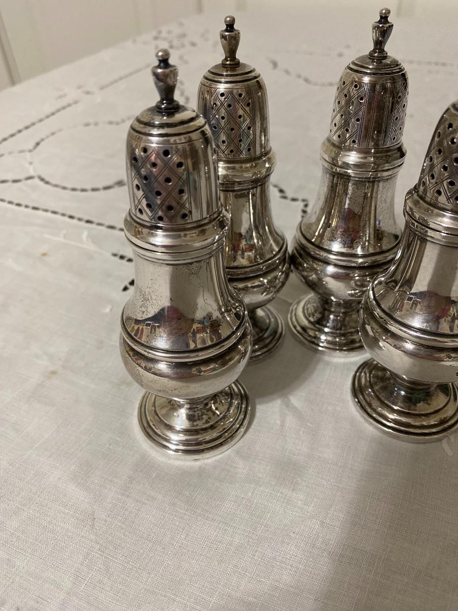 Four matching salt and pepper shakers stamped on the bottom Sterling with a Lion hallmark. One shaker has a slightly bent finial. Each shaker measures 5 inches high. The total weight of all shakers is 252.7 dwt and 392 grams.