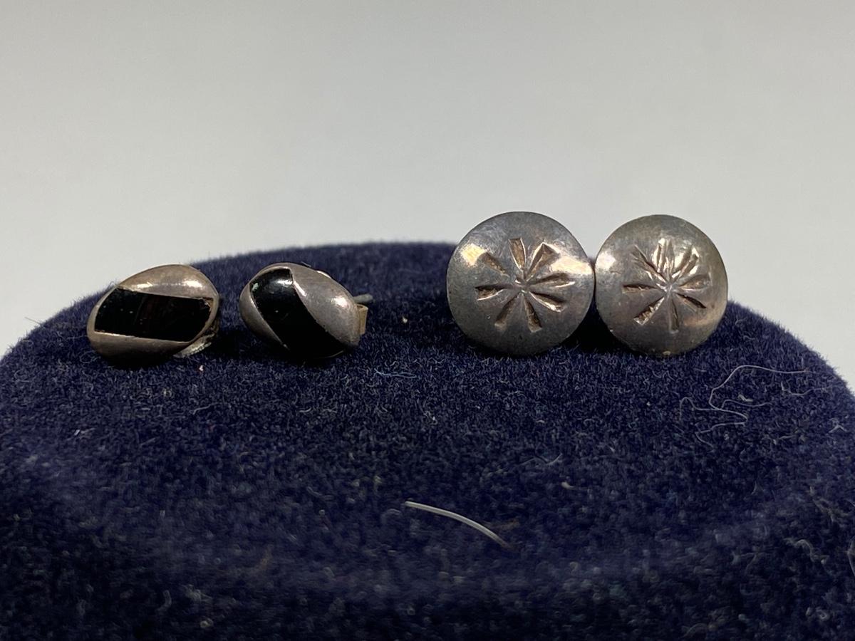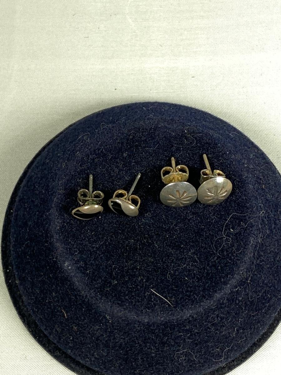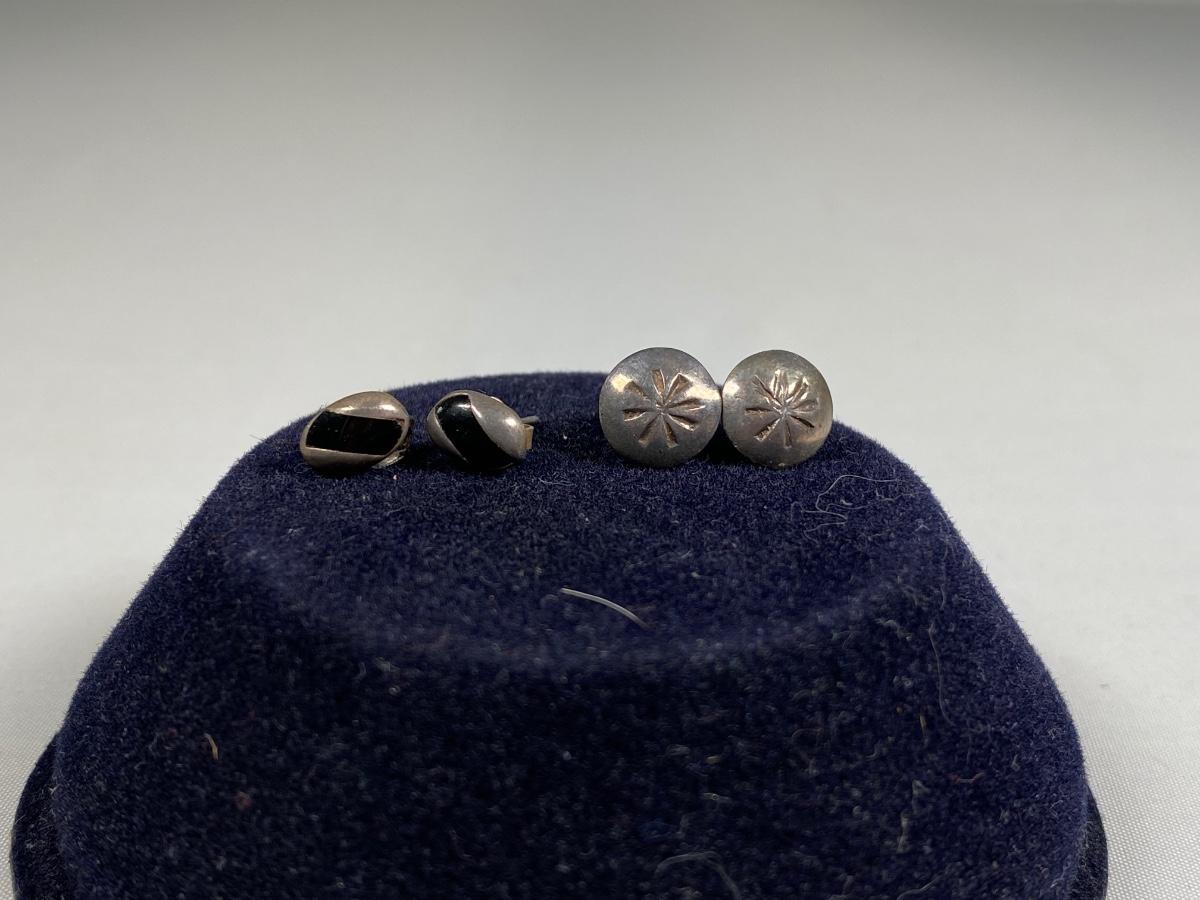 Two pairs of very small southwestern style stud earrings. Previously worn condition. Look like sterling but did not notice any markings.